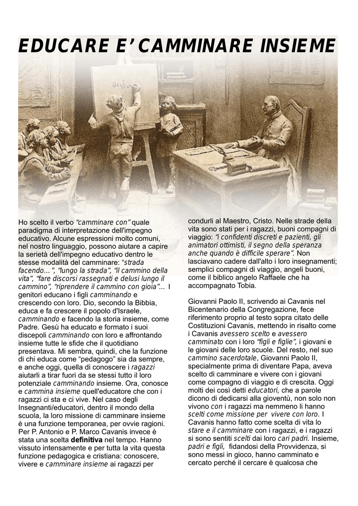 EDUCARE E’ CAMMINARE INSIEME Ho scelto il verbo “camminare con” quale paradigma di interpretazione dell'impegno educativo. Alcune espressioni molto comuni, nel nostro linguaggio, possono aiutare a capire la serietà dell'impegno educativo dentro le stesse modalità del camminare: “strada facendo…”, “lungo la strada”, “il cammino della vita”, “fare discorsi rassegnati e delusi lungo il cammino”, “riprendere il cammino con gioia”… I genitori educano i figli camminando e crescendo con loro. Dio, secondo la Bibbia, educa e fa crescere il popolo d'Israele, camminando e facendo la storia insieme, come Padre. Gesù ha educato e formato i suoi discepoli camminando con loro e affrontando insieme tutte le sfide che il quotidiano presentava. Mi sembra, quindi, che la funzione di chi educa come “pedagogo” sia da sempre, e anche oggi, quella di conoscere i ragazzi aiutarli a tirar fuori da se stessi tutto il loro potenziale camminando insieme. Ora, conosce e cammina insieme quell'educatore che con i ragazzi ci sta e ci vive. Nel caso degli Insegnanti/educatori, dentro il mondo della scuola, la loro missione di camminare insieme è una funzione temporanea, per ovvie ragioni. Per P. Antonio e P. Marco Cavanis invece è stata una scelta definitiva nel tempo. Hanno vissuto intensamente e per tutta la vita questa funzione pedagogica e cristiana: conoscere, vivere e camminare insieme ai ragazzi per condurli al Maestro, Cristo. Nelle strade della vita sono stati per i ragazzi, buoni compagni di viaggio: “i confidenti discreti e pazienti, gli animatori ottimisti, il segno della speranza anche quando è difficile sperare”. Non lasciavano cadere dall'alto i loro insegnamenti; semplici compagni di viaggio, angeli buoni, come il biblico angelo Raffaele che ha accompagnato Tobia. Giovanni Paolo II, scrivendo ai Cavanis nel Bicentenario della Congregazione, fece riferimento proprio al testo sopra citato delle Costituzioni Cavanis, mettendo in risalto come i Cavanis avessero scelto e avessero camminato con i loro “figli e figlie”, i giovani e le giovani delle loro scuole. Del resto, nel suo cammino sacerdotale, Giovanni Paolo II, specialmente prima di diventare Papa, aveva scelto di camminare e vivere con i giovani come compagno di viaggio e di crescita. Oggi molti dei così detti educatori, che a parole dicono di dedicarsi alla gioventù, non solo non vivono con i ragazzi ma nemmeno li hanno scelti come missione per vivere con loro. I Cavanis hanno fatto come scelta di vita lo stare e il camminare con i ragazzi, e i ragazzi si sono sentiti scelti dai loro cari padri. Insieme, padri e figli, fidandosi della Provvidenza, si sono messi in gioco, hanno camminato e cercato perché il cercare è qualcosa che realizza e completa la natura della gioventù e la sua vocazione. I giovani hanno trovato nei Cavanis, qualcuno a cui affidare i loro sogni di felicità e le loro paure a riguardo del futuro. P. Antonio e P. Marco, da parte loro, hanno accolto volentieri l'invito a camminare insieme e hanno offerto ai giovani una traccia per un programma di crescita umana e spirituale che non fosse solo realizzazione individuale ma realizzazione comunitaria, con ruoli ben chiari di servizio nella scuola e nell'oratorio, dove il più grande e il primo doveva farsi ultimo e mettersi a servizio degli altri. Il cammino educativo, se fatto insieme, giovani ed educatori, crea naturalmente un legame paterno e filiale. La strada dell'educazione è lunga ma rende possibile una migliore conoscenza reciproca e rafforza i legami che si creano, nella costante del “viaggio” della vita. Gli educatori possono perfino capire le cosiddette “trasgressioni” dei giovani; i tentativi di cercare altre strade che non siano quelle del bene che sono state loro insegnate e testimoniate. “La stessa parola “trasgressione” significa di per sé l'azione di chi muove il proprio passo al di là, al di fuori, oltre il tracciato, il percorso stabilito”. Nei giovani il primo effetto della “trasgressione” è l'allontanamento dal luogo di origine, dalla propria identità di figli, dalla scuola, dall'oratorio. E' l'andare errando senza uno scopo e una direzione. Vera emergenza educativa. I Cavanis, nel loro tempo, parlavano di “ tanta povera gioventù dispersa”. Oggi è il nostro turno di vivere in questa emergenza educativa di dispersione giovanile, di ragazzi rubati dei valori fondamentali, degli ideali e della sicurezza affettiva. della credibilità di genitori ed educatori. Ma chi disperde la gioventù? Per i Cavanis quando la gioventù perde la possibilità e la libertà di scelta, perché non c' niente da scegliere, viene automaticamente dispersa, diventa schiava dell'ignoranza, dei condizionamenti sociali e delle ideologie. Ma i giovani dispersi, se qualcuno li aiuta, possono “ritrovare la strada giusta”, ritrovare se stessi, ritrovare il Padre e la propria identità di figli; possono liberarsi dalla schiavitù e quindi ritrovare la felicità. Scrivono i Cavanis: “Una innumerabile quantità di giovani abbandonati ad occhi aperti corrono ad ingrossare il torrente della odierna scostumatezza, finché non si applichi a tanto male un rimedio proporzionato al bisogno”. La gioventù ha bisogno di un: “particolar sistema di educazione così indispensabile”. Questo particolare sistema, attento ai metodi con cui si lavora con i ragazzi, è il conoscerli, lo stare e il camminare insieme. Lo stare insieme e il camminare con i giovani, proprio dei due fratelli Cavanis, ha modalità differenti: P. Antonio sta con i giovani specialmente in classe, in cortile e in oratorio. P. Marco prevalentemente in cortile, in oratorio, nel lavoro. La modalità del loro stare e camminare con i giovani è, però, sempre la stessa: paternamente amorosa nel donare i tesori della vita cristiana che non dovevano essere rinchiusi in intoccabili sacrari per essere persi di vista o per diventare pezzi da museo da guardare m