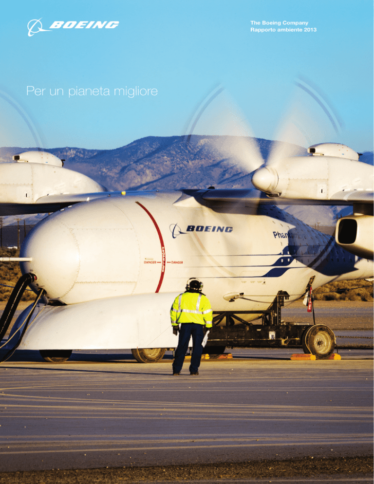 The Boeing Company Rapporto ambiente 2013 Per un pianeta migliore Risultati Dal 2007, Boeing ha ridotto il consumo di energia del 3% su base assoluta e del 21% sulla base del reddito netto effettivo. DAL 2007-2012 ABBIAMO AUMENTATO MENTRE, ALLO STESSO TEMPO, ABBIAMO RIDOTTO... LE CONSEGNE DI AEREI DEL le emissioni di ANIDRIDE I RIFIUTI CARBONICA del PERICOLOSI del IL CONSUMO DI ACQUA nelle attività produttive del Tabella riassuntiva delle Prestazioni Ambientali 2007–2012 2007 2008 2009 2010 2011 2012 Percentuale Percentuale Miglioramento Miglioramento Assoluta Normalizzata Ricavi (in milioni di dollari statunitensi) $66.387 $60.909 $68.281 $64.306 $68.735 $81.698 N/A N/A Occupazione (fine anno) 159.313 162.191 157.073 160.537 171.175 174.429 N/A N/A Consegne (aerei commerciali e velivoli da difesa di nuova costruzione) 552 474 602 577 592 745 N/A N/A Emissioni di CO2 (in milioni di tonnellate metriche) 1,29 1,25 1,21* 1,17* 1,20* 1,17 9% 26% Consumo di energia (in milioni di MMBTU o trilioni di Unità Termiche Britanniche) 12,97 12,71 12,67 12,27 12,87 12,64 3% 21% Rifiuti pericolosi 8,99 (in migliaia di tonnellate americane generate) 7,71 8,15 6,94 7,50 7,40 18% 33% Consumo di acqua (in miliardi di galloni americani) 1,83 1,81 1,71 1,63 1,66 1,80 2% 20% Rifiuti solidi non smaltiti in discarica (in percentuale sul totale dei rifiuti solidi non pericolosi prodotti) 58% 64% 68% 73% 76% 79% 36% N/A $0,472 $0,024 $0,028 $0,647 $0,226 $0,079 N/A N/A Ammende per il mancato rispetto dell’ambiente (in milioni di dollari statunitensi) *I valori totali delle emissioni di CO2 relative agli anni 2009–2011 sono stati adattati in conformità con i fattori EPA eGRID statunitensi aggiornati. Cinque anni fa, abbiamo deciso di perseguire obiettivi ambiziosi al fine di ridurre il nostro impatto ambientale, incrementando, allo stesso tempo, la nostra attività commerciale. Grazie alla dedizione e al duro lavoro di ciascun membro di Boeing, abbiamo raggiunto questi obiettivi e siamo pronti a compiere ulteriori passi avanti negli anni a venire. Il nostro impegno: Messaggio della Leadership Jim McNerney Presidente del Consiglio di Amministrazione, Direttore Generale e CEO di Boeing Company Kim Smith Vicepresidente Boeing Ambiente, Salute e Sicurezza Durante un periodo di cinque anni, in cui abbiamo sviluppato due nuovi velivoli a basso consumo energetico e incrementato di oltre il 50% le consegne di aerei, abbiamo anche ridotto notevolmente le emissioni di CO2, il consumo energetico, la produzione di rifiuti pericolosi e il consumo di acqua nelle nostre attività. Inoltre, nello stesso periodo, abbiamo aperto una nuova importante struttura produttiva, creando oltre 13.000 nuovi posti di lavoro e aumentando i ricavi annui fino al valore record di $81,7 miliardi. Gli sforzi compiuti per la riduzione dei consumi sono stati premiati dall’Agenzia per la Protezione dell’Ambiente degli Stati Uniti, che ha riconosciuto i nostri progressi ed ha conferito a Boeing il titolo di Partner ENERGY STAR® dell’Anno nel 2013, per il terzo anno consecutivo. È questo il tipo di crescita sostenibile che Boeing si impegna a perseguire, alle soglie del suo secondo secolo di attività. Puntiamo a una crescita zero delle emissioni per i prossimi cinque anni, in vista della continua espansione della nostra azienda. L’obiettivo per le nostre fabbriche e attività è l’assoluta crescita zero delle emissioni di CO2, del consumo di acqua e dei rifiuti solidi smaltiti in discarica, oltre alla crescita zero dei materiali pericolosi calcolata sulla base dei ricavi, entro il 2017. I nostri risultati in campo ambientale si estendono ben al di là delle mura delle nostre fabbriche. Boeing sta cercando e sviluppando nuove tecnologie, che contribuiranno a realizzare la prossima generazione di aeroplani meno inquinanti, più silenziosi e a maggiore efficienza energetica. liquido e rilascia unicamente vapore acqueo nell'atmosfera. Abbiamo inoltre completato i test di volo dell’X48C, un velivolo da ricerca nel quale cabina ed ali si fondono in un'unica struttura, mantenendo le promesse in termini di efficienza energetica e di impatto acustico. Il 737 MAX, attualmente in fase di sviluppo, è caratterizzato da un’impronta di carbonio inferiore del 13% rispetto all’odierno NextGeneration 737, che è l’aereo con maggiore efficienza energetica attualmente in circolazione nel suo genere. Guardando avanti, Boeing continua ad esercitare la sua leadership a livello mondiale, affinché l’industria dell’aviazione commerciale raggiunga l’obiettivo di una crescita a emissioni zero entro il 2020. Collaboriamo con partner internazionali per fare sì che lo sviluppo di biocarburanti passi dalla fase di test alla produzione, fino all’utilizzo quotidiano. Ci impegniamo, insieme all’industria globale, a ridurre l’utilizzo di sostanze chimiche pericolose per i nostri prodotti e a migliorare l’efficienza della rete di traffico aereo mondiale, allo scopo di ridurre notevolmente le emissioni. Il nostro nuovo 787 Dreamliner e il 747-8 offrono una riduzione dell'impronta di carbonio a due cifre, rispetto agli aerei a cui sono subentrati; inoltre, stiamo valutando insieme ai clienti il 777X, un nuovo modello derivato che offrirebbe il minore consumo energetico per posto a sedere rispetto a qualsiasi aeromobile commerciale in circolazione. A settembre abbiamo concluso la prima fase di test di volo del nostro progetto ecoDemonstrator, volto a intensificare lo sviluppo di prodotti, materiali e design innovativi dal punto di vista ambientale. All’inizio di quest’anno, il Phantom Eye è decollato per il suo terzo test di volo. Il velivolo, a pilotaggio remoto e in grado di raggiungere elevate altitudini, è alimentato a idrogeno combustibile Per maggiori informazioni, visitare il sito www.boeing.com/environment Inoltre, investiamo costantemente in tecnologie d'avanguardia per soddisfare il bisogno di prestazioni di precisione espresso da
