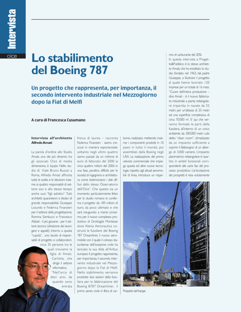 Intervista Lo stabilimento del Boeing 787 Un progetto che rappresenta, per importanza, il secondo intervento industriale nel Mezzogiorno dopo la Fiat di Melfi A cura di Francesca Cusumano Intervista all’architetto Alfredo Amati La parola d’ordine allo Studio Amati, uno dei più dinamici tra gli associati Oice di media dimensione, è èquipe. Nello studio di Viale Bruno Buozzi a Roma, Alfredo Amati affronta tutte le scelte e le decisioni insieme ai quattro responsabili di settore: soci e allo stesso tempo anche suoi “figli adottivi”. Tutti architetti quarantenni e titolari di grande responsabilità: Giuseppe Losurdo e Federica Finanzieri per il settore della progettazione; Romina Sambucci e Francesco Abbati - il più giovane - per il settore tecnico (direzione dei lavori, gare e appalti). Intorno a questa “cupola”, uno stuolo di responsabili di progetto e collaboratori, circa 35 persone tra le quali troviamo la figlia di Amati, Carlotta, che dirige il settore informatico. “Nell’arco di dieci anni, da quando sono entrata fresca di laurea – racconta Federica Finanzieri - siamo cresciuti in maniera esponenziale: soltanto negli ultimi quattro siamo passati da un milione di euro di fatturato del 2000 ai circa quattro milioni del 2006 in una fase, peraltro, difficile per le società di ingegneria e architettura, come testimoniano i dati diffusi dallo stesso Osservatorio dell’Oice”. Che questo sia un momento particolarmente felice per lo studio romano lo conferma il progetto da 100 milioni di euro, da poco ultimato e che sarà inaugurato a marzo prossimo, per il nuovo complesso produttivo di Grottaglie Monteiasi dove Alenia Aeronautica costruirà le fusoliere del Boeing 787 Dreamliner, il nuovo aeromobile con il quale il colosso statunitense dell'aviazione civile ha lanciato la sua sfida all’Airbus europeo. Il progetto rappresenta, per importanza, il secondo intervento industriale nel Mezzogiorno dopo la Fiat di Melfi. Nello stabilimento verranno prodotte due sezioni della fusoliera per la fabbricazione del Boeing B787 Dreamliner, il primo aereo civile in fibra di car- bonio, realizzato mettendo insieme i componenti prodotti in 10 paesi in tutto il mondo, poi assemblati dalla Boeing negli USA. La realizzazione del primo velivolo commerciale che impiega questa ed altre nuove tecnologie, rispetto agli attuali aeromobili di linea, introduce un rispar- Prospetto dell’hangar. mio di carburante del 20%. In questa intervista a Progetto&Pubblico è lo stesso architetto Amati, che ha ereditato lo studio, fondato nel 1963, dal padre Giuseppe, a illustrare il progetto al quale hanno lavorato 120 imprese per un totale di 16 mesi. “Cuore dell’intera produzione – dice Amati - è il nuovo fabbricato industriale a pianta rettangolare tripar tita in navate da 55 metri, per un’altezza di 25 metri ed una superficie complessiva di circa 70.000 m2. E’ qui che verranno formate le par ti della fusoliera, all’interno di un unico ambiente da 300.000 metri cubi detto “clean room”, climatizzato da un impianto sufficiente a coprire il fabbisogno di un albergo di 3.000 camere. L’impianto planimetrico rettangolare è ripartito in ambiti funzionali corrispondenti alle varie fasi del processo produttivo. L’articolazione dei prospetti è resa volutamente dinamica lungo il fronte principale, che misura circa 400 metri, dai tagli e dalle piegature praticate sul rivestimento. Le fessure caratterizzano anche le condizioni di luce all’interno dell’edificio, l’andamento inclinato delle superfici, sagomate sulla struttura sottostante, è anche l’alveo che accoglie gli impianti. Il complesso degli elementi architettonici celebra la poderosa macchina produttiva e gli avanzati sistemi tecnologici che operano all’interno dello stabilimento. La ricerca di una riconoscibilità immediata si traduce nella scelta cromatica e nella caratterizzazione attribuita ai due involucri metallici che celano i collegamenti verticali esterni”. Progetto&Pubblico: Allo stesso tempo, un complesso così avanzato tecnologicamente lo avete impiantato nella cornice tradizionale degli ulivi pugliesi… Amati: Tutto il progetto è stato calibrato per integrarsi con il contesto ambientale rispettandone a pieno le valenze paesistiche. Il colore blu richiama la leggerezza del cielo, il fronte dell’edificio è stato scomposto in più elementi per minimizzare l’impatto con il contesto, gli ulivi fanno da cornice naturale del complesso. Certo, la portata dell’intervento, con tutte le implicazioni strutturali ed impiantistiche ad esso legate e la volontà di realizzare un fabbricato che costituisse una risposta non solo in termini di funzionalità ma anche di qualità architettonica, ha richiesto un approccio progettuale integrato ed un confronto continuo tra le molteplici professionalità specializzate coinvolte. Progetto&Pubblico: Coordinate da una donna, condirettrice dei lavori. Un fatto un po’ atipico, ce ne vuole parlare? Amati: Effettivamente sono poche le donne che scelgono di indossare l’elmetto e trascorrere intere giornate tra calce e cemento, ma ancor meno sono gli studi di architettura che si avvalgono di un direttore dei lavori donna, il nostro è uno di questi. L’architetto Romina Sambucci da dieci anni segue con continuità i lavori sul tutto il territorio nazionale. Per circa un anno ha lavorato in pianta stabile sul cantiere di Grottaglie Monteiasi. Quando fu presentata all’inizio i responsabili di Alenia mostrarono una certa diffidenza, per via della giovane età e per il fatto che si trattava di una donna… ma poi si sono dovuti ricredere! Progetto&Pubblico: L’intera opera è stata realizzata a tempi da record in soli 16 mesi. Come vi siete organizzati per essere tanto veloci? Amati: Il nostro Team è esperto e ben organizzato, inoltre è ottimale il nostro livello di informatizzazione. A questo si aggiunge la consolidata esperienza dello studio nella gestione della progettazion