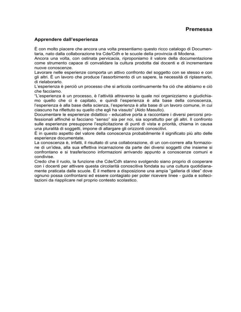 Premessa Apprendere dall’esperienza È con molto piacere che ancora una volta presentiamo questo ricco catalogo di Documentaria, nato dalla collaborazione tra Cde/Cdh e le scuole della provincia di Modena. Ancora una volta, con ostinata pervicacia, riproponiamo il valore della documentazione come strumento capace di convalidare la cultura prodotta dai docenti e di incrementare nuove conoscenze. Lavorare nelle esperienze comporta un attivo confronto del soggetto con se stesso e con gli altri. È un lavoro che produce l’assorbimento di un sapere, la necessità di riplasmarlo, di rielaborarlo. L’esperienza è perciò un processo che si articola continuamente fra ciò che abbiamo e ciò che facciamo. “L’esperienza è un processo, è l’attività attraverso la quale noi organizziamo e giudichiamo quello che ci è capitato, e quindi l’esperienza è alla base della conoscenza, l’esperienza è alla base della scienza, l’esperienza è alla base di un lavoro comune, in cui ciascuno ha riflettuto su quello che egli ha vissuto” (Aldo Masullo). Documentare le esperienze didattico - educative porta a raccontare i diversi percorsi professionali affinché si facciano “senso” sia per noi, sia soprattutto per gli altri. Il confronto sulle esperienze presuppone l’esplicitazione di punti di vista e priorità, chiama in causa una pluralità di soggetti, impone di allargare gli orizzonti conoscitivi. È in questo aspetto del valore della conoscenza probabilmente il significato più alto delle esperienze documentate. La conoscenza è, infatti, il risultato di una collaborazione, di un con-correre alla formazione di un’idea, alla sua effettiva incarnazione da parte dei diversi soggetti che insieme si confrontano e si trasferiscono informazioni arrivando appunto a conoscenze comuni e condivise. Credo che il ruolo, la funzione che Cde/Cdh stanno svolgendo siano proprio di cooperare con i docenti per attivare questa circolarità conoscitiva fondata su una cultura quotidianamente praticata dalle scuole. È il mettere a disposizione una ampia ”galleria di idee” dove ognuno possa confrontarsi ed essere contagiato per poter ricevere linee - guida e sollecitazioni da riapplicare nel proprio contesto scolastico. Introduzione I materiali che sono esposti in Mostra in questa quarta edizione di Documentaria, fanno riferimento al mondo della scuola della provincia di Modena. Occupano i foyer dell’Auditorium “Guido Monzani” e sono suddivisi in tre grandi aree: • La prima, che si incontra dopo l’ingresso, ospita progetti e attività promossi da: Cde, Cdh, Itinerari Didattici, Centro Interculturale e sono stati realizzati in collaborazione con le scuole e altri enti operanti sul territorio a livello sia provinciale sia regionale. In questa area hanno particolare risalto le esperienze presentate nei seminari in parallelo del 3 e 5 settembre, in quanto possono permettere, ad un visitatore interessato, un ulteriore approfondimento. Inoltre, si è scelto di presentare, oltre alle attività delle sezioni di Educazione Musicale e L2, gli interventi dello Sportello Consulenza sulla Documentazione del Cde che hanno generato, per le scuole che ne hanno usufruito, soluzioni operative particolarmente interessanti. • La seconda area, sempre a piano terra, presenta esperienze e servizi di Enti, Istituzioni e Associazioni del territorio che collaborano attivamente con le istituzioni scolastiche. La particolarità più evidente di questi servizi è che tutti presentano progetti realizzati in collaborazione con una scuola o con reti di scuole: ciò a significare che il raccordo tra i soggetti del territorio e la scuola si è realmente concretizzato. • La terza grande area, nel foyer al piano superiore, è dedicata alle documentazioni didattico-educative realizzate nelle scuole di ogni ordine e grado. Questa area raccoglie, raggruppandole in tre settori, le ottantasette esperienze più significative o innovative scelte dai Dirigenti Scolastici in base a criteri predefiniti forniti da Cde/Cdh. I settori sono: ♦ Risorse, inteso come valorizzazione delle risorse umane e strutturali ♦ Progettazione, che evidenzia, appunto, progettazioni e innovazioni educative ♦ Territorio, in cui si mettono in risalto le collaborazioni e il raccordo tra la scuola e i soggetti del territorio. A loro volta, i settori Risorse e Progettazione sono articolati in diverse sezioni tematiche, che raggruppano ulteriormente le esperienze in base ai loro aspetti più significativi. Le sezioni del settore Risorse sono: Attività Formative, Competenze, Esperti Esterni, Laboratori, Reti di scuole. Le sezioni del settore Progettazione sono: Continuità, Piano Offerta Formativa, Programmazione per Reti, Strategie Innovative. Ogni esperienza è, dunque, collocata sia nella Mostra sia nel presente Catalogo in una particolare area, in uno specifico settore e in una determinata sezione. Ad esempio l’esperienza “Cibovagando. Progetto di integrazione multiculturale”, che fa parte dell’area delle documentazioni didattico-educative, è stata collocata all’interno del settore Risorse e della sezione Laboratori, in quanto l’elemento che è stato ritenuto determinante la realizzazione dello spettacolo e la produzione di un libro da parte degli studenti coinvolti, è l’organizzazione delle attività per laboratori (laboratorio di teatro, laboratorio per la stesura del libro, laboratorio creativo/espressivo). Ciò non toglie che nell’esperienza ci siano altri elementi altrettanto importanti, riconducibili ad esempio al settore della Progettazione, come il riscontro nel POF di conoscenza e incontro di culture diverse da parte di tutti gli alunni, o come l’uso di strategie didattiche innovative. In tal senso, la collocazione delle esperienze nei settori - sezioni è solo una chiave di lettura proposta, che non impedisce ai visitatori della Mostra - lettori del Catalogo - di cogliere dalle esperienze altri aspetti o stimoli imp