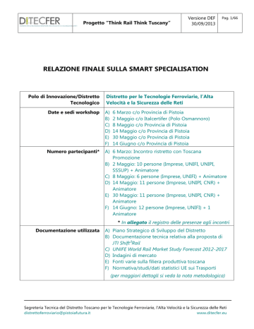 Progetto “Think Rail Think Tuscany” Versione DEF 30/09/2013 Pag. 1/66 RELAZIONE FINALE SULLA SMART SPECIALISATION Polo di Innovazione/Distretto Tecnologico Distretto per le Tecnologie Ferroviarie, l’Alta Velocità e la Sicurezza delle Reti Date e sedi workshop A) B) C) D) E) F) 6 Marzo c/o Provincia di Pistoia 2 Maggio c/o Italcertifer (Polo Osmannoro) 8 Maggio c/o Provincia di Pistoia 14 Maggio c/o Provincia di Pistoia 30 Maggio c/o Provincia di Pistoia 14 Giugno c/o Provincia di Pistoia Numero partecipanti* A) 6 Marzo: Incontro ristretto con Toscana Promozione B) 2 Maggio: 10 persone (Imprese, UNIFI, UNIPI, SSSUP) + Animatore C) 8 Maggio: 6 persone (Imprese, UNIFI) + Animatore D) 14 Maggio: 11 persone (Imprese, UNIPI, CNR) + Animatore E) 30 Maggio: 11 persone (Imprese, UNIPI, CNR) + Animatore F) 14 Giugno: 12 persone (Imprese, UNIFI) + 1 Animatore * In allegato il registro delle presenze agli incontri Documentazione utilizzata A) Piano Strategico di Sviluppo del Distretto B) Documentazione tecnica relativa alla proposta di JTI Shift²Rail C) UNIFE World Rail Market Study Forecast 2012-2017 D) Indagini di mercato E) Fonti varie sulla filiera produttiva toscana F) Normativa/studi/dati statistici UE sui Trasporti (per maggiori dettagli si veda la nota metodologica) Segreteria Tecnica del Distretto Toscano per le Tecnologie Ferroviarie, l’Alta Velocità e la Sicurezza delle Reti [email protected] www.ditecfer.eu Progetto “Think Rail Think Tuscany” Versione DEF 30/09/2013 Pag. 2/66 Nota metodologica Il presente Rapporto è redatto al fine di contribuire all’individuazione di indicazioni strategiche per la programmazione dei fondi strutturali per la Regione Toscana 2014-2020 in ottica di Smart Specialisation relativamente al settore industriale e scientifico coperto dal Distretto per le Tecnologie Ferroviarie, l’Alta Velocità e la Sicurezza delle Reti. A tal fine sono state valorizzate informazioni e dati già in possesso del Distretto (visite in aziende, Comitati di Indirizzo Tecnologico, riunioni del Working Group Ferroviario all’interno del Cluster Tecnologico Nazionale, ecc.), e raccolte informazioni e dati nuovi, acquisiti mediante una serie di incontri avuti con le Aziende aderenti al Distretto, con le Università e con attori di settore. In particolare, le indicazioni contenute nel presente Rapporto emergono come sintesi di strategie, dati di mercato, normative, statistiche ed altre indicazioni di settore a livello internazionale, europeo, nazionale e regionale. I principali riferimenti utilizzati per l’elaborazione del contesto e per lo sviluppo collaborativo del contenuto sono stati: Livello internazionale: 1) Trend di sviluppo del mercato ferroviario (UNIFE World Rail Market Study Forecast 2012-2017); 2) Analisi di scouting condotte da Toscana Promozione; Livello europeo: 3) Strategie di sviluppo della rete ferroviaria in ottica 2020 e 2050, con relative proiezioni di sviluppo del mercato (Reti TEN-T e atti collegati); 4) Normative comunitarie di regolamentazione di aspetti tecnici e tecnologici (ETCS, antirumore, ecc.); 5) Proposta di Joint Technology Initiative “Shift²Rail” 2014-2020 promossa da UNIFE per la R&S nel settore ferroviario; 6) Proposta di programma quadro per la R&S Horizon 2020; Livello nazionale: 7) Indagine Eurostat sulla soddisfazione dei passeggeri in merito ai servizi ferroviari (marzo 2011); 8) Analisi ANIE sulla Filiera ferroviaria italiana nella competizione globale (settembre 2011); 9) Piano Strategico di Sviluppo del costituendo Cluster Tecnologico Nazionale “Trasporti Italia 2020”; Segreteria Tecnica del Distretto Toscano per le Tecnologie Ferroviarie, l’Alta Velocità e la Sicurezza delle Reti [email protected] www.ditecfer.eu Progetto “Think Rail Think Tuscany” Versione DEF 30/09/2013 Pag. 3/66 10) Lavori del Working Group Ferroviario in seno al Cluster Tecnologico Nazionale “Trasporti Italia 2020”; Livello regionale: 11) Piano Strategico di Sviluppo del Distretto per le Tecnologie Ferroviarie, l’Alta Velocità e la Sicurezza delle Reti 2012-2015; 12) Analisi delle “Schede di rilevazione competenze” raccolte dalle Aziende aderenti al Distretto per le Tecnologie Ferroviarie, l’Alta Velocità e la Sicurezza delle Reti; 13) Analisi dei Questionari sulle priorità tecnologiche in ottica 2020 raccolti dalle Aziende aderenti al Distretto per le Tecnologie Ferroviarie, l’Alta Velocità e la Sicurezza delle Reti; 14) Studi di settore realizzati da Pistoia Futura sulla meccanica ferroviaria. Coinvolgimento attivo degli attori di settore: Partendo dalla delineazione delle linee strategiche di sviluppo tecnologico del settore (di cui il principale riferimento è dato dalla proposta di JTI “Shift²Rail”, che sintetizza anche le innovazioni indotte dallo sviluppo della normativa comunitaria), ed incrociando tali dati con le priorità strategiche individuate nel Piano Strategico di Sviluppo del Distretto per le Tecnologie Ferroviarie, l’Alta Velocità e la Sicurezza delle Reti, si sono invitate le Aziende del Distretto ad indicare, in step successivi: 1) le priorità tematiche di loro interesse; 2) i percorsi tecnologici che – in ragione delle proprie competenze – esse potrebbero/vorrebbero intraprendere in ottica 2020; 3) idee progettuali coerenti con il quadro strategico di riferimento e con i possibili impegni di investimento; 4) i soggetti - aderenti al Distretto e non – che, con le proprie competenze, potrebbero essere dei partner di valore in grado di sviluppare investimenti congiunti in R&S e innovazione. Ciò è avvenuto mediante: - l’invio di informazioni preventive per email; - l’invito a incontri operativi, in cui è stato fatto brainstorming con l’ausilio della Dott.ssa Veronica Elena Bocci, coordinatore della Segreteria Tecnica del Distretto; - attività di feedback post-riunioni in cui è stato chiesto di redigere degli abstract in merito alle priorità tecnologiche e di investimento de