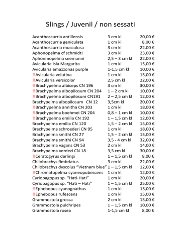 Slings / Juvenil / non sessati Acanthoscurria antillensis 3 cm kl Acanthoscurria geniculata 1 cm kl Acanthoscurria musculosa 3 cm kl Aphonopelma cf schmidti 3 cm kl Aphonmopelma seemanni 2,5 – 3 cm kl Avicularia Isla Margarita 1 cm kl Avicularia amazzonas purple 1-1,5 cm kl !!Avicularia velutina 1 cm kl !!Avicularia versicolor 2,5 cm kl !!Brachypelma albiceps CN 196 3 cm kl !!Brachypelma albopilosum CN 204 1 – 2 cm kl !!Brachypelma albopilosum CN191 2 – 2,5 cm kl Brachypelma albopilosum CN 12 3,5cm kl !!Brachypelma annitha CN 203 1 cm kl !!Brachypelma boehmei CN 204 0,8 – 1 cm kl !!Brachypelma emilia CN 192 1 – 1,5 cm kl Brachypelma emilia CN 120 1,5 – 2 cm kl Brachypelma schroederi CN 95 1 cm kl Brachypelma smithi CN 27 1,5 – 2 cm kl Brachypelma smithi CN 94 3,5 - 4 cm kl Brachypelma vagans CN 53 2 cm kl Brachypelma verdezi CN 18 3,5 cm kl !!Ceratogyrus darlingi 1 – 1,5 cm kl Chilobrachys fimbriatus 3 cm kl Chilobrachys dyscolus “Vietnam blue” 1 – 1,5 cm kl !!Chromatopelma cyaneopubescens 1 cm kl Cyriopagopus sp. “Hati-Hati” 1 cm kl Cyriopagopus sp. “Hati – Hati” 1 – 1,5 cm kl !!Ephebopus cyanognathus 1 cm kl !!Ephebopus rufescens 1 cm kl Grammostola grossa 2 cm kl Grammostola pulchripes 1 – 1,5 cm kl Grammostola rosea 1-1,5 cm kl 20,00 € 8,00 € 22,00 € 23,00 € 22,00 € 15,00 € 10,00 € 15,00 € 22,00 € 30,00 € 10,00 € 12,00 € 20,00 € 18,00 € 10,00 € 12,00 € 15,00 € 18,00 € 15,00 € 32,00 € 14,00 € 30,00 € 8,00 € 22,00 € 12,00 € 12,00 € 20,00 € 25,00 € 15,00 € 15,00 € 15,00 € 10,00 € 8,00 € !!Grammostola rosea Hapalopus sp. Gross !!Haplopelma alborstriatum Haplopelma vonwitrhi !!Heteroscodra maculata !!Heteroscodra maculata Holothele incei “gold” Hysterocrates cf gigas Lampropelma nigerrimum !!Lampropelma nigerrimum Lasiodora difficilis !!Lasiodora klugi !!Lasiodora parahybana Lasiodorides polycuspulatus !!Monocentropus balfouri Monocentropus balfouri Nhandu chromatus Nhandu chromatus Nhandu coloratovillosum !!Nhandu tripepii !!Nhandu tripepii Ornithoctonus aureotibialis !!Ornithoctonus aureotibialis !!Pelinobius muticus Plesiopelma sp. Bolivien Poecilotheria metallica Poecilotheria miranda Poecilotheria ornata Poecilotheria regalis !!Poecilotheria smithi Poecilotheria sp. Lowland Psalmopoeus cambridgei Psalmopoeus irminia !!Psalmopoeus irminia !!Psalmopoeus irminia 2,5 cm kl 1,5 - 2 cm kl 1,5 cm kl 1 – 1,5 cm kl 2 cm kl 4 cm kl 2 cm kl 1 – 1,5 cm kl 1 – 1,5 cm kl 2,5 – 3 cm kl 2,5 – 3 cm kl 2 cm kl 2 cm kl 2 – 2,5 cm kl 2 – 2,5 cm kl 3 cm kl 1 cm kl 1,5 - 2cm kl 1,5 cm kl 2 cm kl 2,5 cm kl 1 cm kl 4 cm kl 3 cm kl 2,5 cm kl 1,5 – 2 cm kl 2 – 2,5 cm kl 2 cm kl 1,5 cm kl 3 cm kl 3,5 cm kl 3 – 4 cm kl 1 cm kl 2 cm kl 3,5 cm kl 12,00 € 22,00 € 13,00 € 15,00 € 12,00 € 25,00 € 18,00 € 8,00 € 18,00 € 28,00 € 16,00 € 15,00 € 9,00 € 20,00 € 28,00 € 30,00 € 6,00 € 10,00 € 10,00 € 16,00 € 20,00 € 15,00 € 48,00 € 28,00 € 28,00 € 35,00 € 20,00 € 12,00 € 10,00 € 25,00 € 25,00 € 20,00 € 8,00 € 12,00 € 20,00 € !!Pseudhapalopus sp. Blue Pseudhapalopus sp. "langhaarig" !!Pterinochilus chordatus !!Pterinochilus murinus “rcf” Theraposa stirmi !!Thrixopelma ockerti 0,8 cm kl 3 – 3,5 cm kl 3 cm kl 1 – 1,5 cm kl 2 cm kl 1,5 cm kl 20,00 € 25,00 € 20,00 € 9,00 € 48,00 € 12,00 € Subadult / Adult / sessate femmine !!Acanthoscurria geniculata !!Acanthoscurria geniculata !!Acanthoscurria geniculata !!Aphonopelma seemanni !!Augacephalus ezendami !!Avicularia aurantica Avicularia versicolor !!Avicularia sp. Peru purple !!Brachypelma albiceps CN 197 Brachypelma albopilusum CN 149 !!Brachypelma albopilosum CN 202 !!Brachypelma annitha CN 195 !!Brachypelma boehmei CN 198 !!Brachypelma boehmei CN 193 !!Brachypelma klaasi CN 194 Brachypelma sabulosum CN 148 !!Brachypelma smithi CN 199 !!Ceratogyrus darlingi !!Ceratogyrus marshalli Chilobrachys huahini Cyclosternum fasciatum !!Cyclosternum fasciatum !!Ephebopus murinus !!Grammostola rosea !!Grammostola rosea !!Grammostola porteri Hapalopus sp. Gross !!Haplopelma albosgtriatum Haplopelma lividum !!Haplopelma minax “big black” !!Haplopelma vonwirthi Hysterocrates cf gigas !!Lasiodora klugi 3 – 4 cm kl 30,00 € 6 cm kl 50,00 € 8 cm kl 65,00 € 5 cm kl 50,00 € 4 – 5 cm kl 50,00 € 6 cm kl 65,00 € 3 – 4 cm kl 40,00 € 6 cm kl 55,00 € 5 cm kl 60,00 € 6 cm kl 40,00 € 6,5 cm kl 45,00 € 6 cm kl 110,00 € 3,5 – 4,5 cm kl 40,00 € 7 – 8 cm kl 65,00 € 7 cm kl 70,00 € 5,5 cm kl 45,00 € 3 – 3,5 cm kl 35,00 € 4,5 cm kl 40,00 € 5,5 cm kl 50,00 € 6 cm kl 45,00 € 4 cm kl 35,00 € 5 cm kl 40,00 € 4 cm kl 45,00 € 5 cm kl 30,00 € 6 cm kl 35,00 € 5 cm kl 28,00 € 3 cm kl 35,00 € 4 – 5 cm kl 55,00 € 5 cm kl 55,00 € 6 cm kl 60,00 € 5 cm kl 55,00 € 5 – 6 cm kl 45,00 € 6,5 cm kl 60,00 € !!Lasiodora parahybana !!Lasiodora parahybana !!Nhandu carapoensis !!Nhandu chromatus !!Nhandu chromatus !!Ornithoctonus aureotibialis !!Ornithoctonus sp. Surat Thani Pamphobeteus platyomma !!Phormictopus cancerides !!Poecilotheria formosa !!Poecilotheria metallica !!Poecilotheria regalis !!Poecilotheria regalis Poecilotheria striata !!Psalmopoeus irminia Theraposa blondi Theraposa stirmi !!Xenesthis immanis 3 – 4 cm kl 5 cm kl 3 cm kl 3 cm kl 6 cm kl 5 cm kl 5 cm kl 7 cm kl 4,5 cm kl 6 cm kl 5 cm kl 4,5 cm kl 8 cm kl 5 cm kl 5 cm kl 6 – 7 cm kl 6 cm kl 4 cm kl 22,00 € 40,00 € 28,00 € 25,00 € 52,00 € 65,00 € 70,00 € 60,00 € 40,00 € 69,00 € 150,00 € 40,00 € 55,00 € 50,00 € 50,00 € 200,00 € 140,00 € 75,00 € 4 cm kl RH 02/15 2,5 cm kl 3 cm kl RH 03/15 4 cm kl 18,00 € 25,00 € 12,00 € 10,00 € 35,00 € 35,00 € Males !!Phormictopus cancerides !!Avicularia metallica !!Brachypelma smithi CN 200 !!Brachypelma albopilosum CN 201 !!Chromatopelma cyaneopubescens !!Ephebopus murinus Scorpions / 