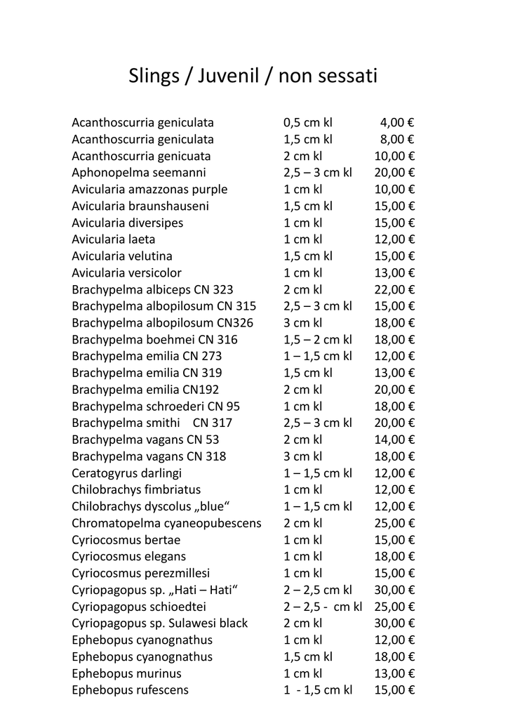 Slings / Juvenil / non sessati Acanthoscurria geniculata Acanthoscurria geniculata Acanthoscurria genicuata Aphonopelma seemanni Avicularia amazzonas purple Avicularia braunshauseni Avicularia diversipes Avicularia laeta Avicularia velutina Avicularia versicolor Brachypelma albiceps CN 323 Brachypelma albopilosum CN 315 Brachypelma albopilosum CN326 Brachypelma boehmei CN 316 Brachypelma emilia CN 273 Brachypelma emilia CN 319 Brachypelma emilia CN192 Brachypelma schroederi CN 95 Brachypelma smithi CN 317 Brachypelma vagans CN 53 Brachypelma vagans CN 318 Ceratogyrus darlingi Chilobrachys fimbriatus Chilobrachys dyscolus „blue“ Chromatopelma cyaneopubescens Cyriocosmus bertae Cyriocosmus elegans Cyriocosmus perezmillesi Cyriopagopus sp. „Hati – Hati“ Cyriopagopus schioedtei Cyriopagopus sp. Sulawesi black Ephebopus cyanognathus Ephebopus cyanognathus Ephebopus murinus Ephebopus rufescens 0,5 cm kl 1,5 cm kl 2 cm kl 2,5 – 3 cm kl 1 cm kl 1,5 cm kl 1 cm kl 1 cm kl 1,5 cm kl 1 cm kl 2 cm kl 2,5 – 3 cm kl 3 cm kl 1,5 – 2 cm kl 1 – 1,5 cm kl 1,5 cm kl 2 cm kl 1 cm kl 2,5 – 3 cm kl 2 cm kl 3 cm kl 1 – 1,5 cm kl 1 cm kl 1 – 1,5 cm kl 2 cm kl 1 cm kl 1 cm kl 1 cm kl 2 – 2,5 cm kl 2 – 2,5 - cm kl 2 cm kl 1 cm kl 1,5 cm kl 1 cm kl 1 - 1,5 cm kl 4,00 € 8,00 € 10,00 € 20,00 € 10,00 € 15,00 € 15,00 € 12,00 € 15,00 € 13,00 € 22,00 € 15,00 € 18,00 € 18,00 € 12,00 € 13,00 € 20,00 € 18,00 € 20,00 € 14,00 € 18,00 € 12,00 € 12,00 € 12,00 € 25,00 € 15,00 € 18,00 € 15,00 € 30,00 € 25,00 € 30,00 € 12,00 € 18,00 € 13,00 € 15,00 € Grammostola pulchra Haplopelma albostriatum Haplopelma lividum Haplopelmaminax „big black“ Haplopelma vonwirthi Holothele incei „gold“ Homeomma sp. Peru Hysterocrates gigas Hysterocrates gigas Iridopelma hirsutum Lampropelma nigerrimum Lampropelma nigerrimum Lampropelma violaceopes Lasiodora klugi Lasiodora parahybana Lasiodora parahybana Lasiodora parahybana Lasiodora striapes Lasiodorides polycuspulatus Megaphobema robustum Megaphobema robustum Nhandu chromatus Nhandu coloratovillosum Pelinobius muticus Poecilotheria formosa Poecilotheria regalis Poecilotheria rufilata Poecilotheria sp. Lowland Poecilotheria striata Poecilotheria vittata Psalmopoeus cambridgei Psalmopoeus irminia Psalmopoeus pulcher Pterinochilus chordatus Pterinochilus murinus „rcf“ Pterinochilus murinus „tcf“ Selenocosmia obscura Stromatopelma calceatum 1 – 1,5 cm kl 1,5 – 2 cm kl 1 – 1,5 cm kl 1 cm kl 1,5 – 2 cm kl 1 – 1,5 cm kl 1 cm kl 1 – 1,5 cm kl 2 cm kl 1,5 – 2 cm kl 1 – 1,5 cm kl 2,5 – 3 cm kl 1,5 cm kl 3 cm kl 2 cm kl 2,5 cm kl 3,5 cm kl 3 cm kl 2 – 2,5 cm kl 1,5 – 2 cm kl 2 – 2,5 cm kl 2 cm kl 1,5 – 2 cm kl 2,5 – 3 cm kl 3,5 cm kl 2,5 cm kl 3 – 3,5 cm kl 3 cm kl 1 cm kl 1 – 1,5 cm kl 4 cm kl 1 cm kl 2 – 2,5cm kl 2 cm kl 1,5 cm kl 1,5 cm kl 1 cm kl 1 cm kl 18,00 € 18,00 € 10,00 € 8,00 € 20,00 € 12,00 € 12,00 € 8,00 € 12,00 € 18,00 € 18,00 € 28,00 € 22,00 € 15,00 € 10,00 € 12,00 € 20,00 € 18,00 € 20,00 € 22,00 € 28,00 € 14,00 € 12,00 € 25,00 € 25,00 € 20,00 € 28,00 € 28,00 € 10,00 € 12,00 € 22,00 € 8,00 € 17,00 € 15,00 € 10,00 € 12,00 € 10,00 € 8,00 € Subadult / Adult / sessate femmine Acanthoscurria geniculata Aphonopelma chalcodes Aphonopelma seemanni Brachypelma smithi CN 322 Brachypelma vagans CN 324 Ceratogyrus darlingi Cyriocosmus bertae Cyriocossmus perezmillesi Eucratoscelus pachypus Haplopelma albostriatum Haplopelma lividum Haplopelma minax „big black“ Hysterocrates cf gigas Nhandu carapoensis Nhandu chromatus Nhandu coloratovillosum Ornithoctonus aureotibialis Pamphobeteus sp. Machala Pamphobeteus sp. Machala Phormictopus cancerides Poecilotheria fasciata Poecilotheria formosa Poecilotheria regalis Poecilotheria striata Selenocosmia effera Selenocosmia sp. „black Java“ 5 – 6 cm kl 6 cm kl 5 – 6 cm kl 3,5 – 4 cm kl 3,5 – 4 cm kl 5,5 cm kl 3 cm kl 2,5 cm kl 4 cm kl 4 – 5 cm kl 5 cm kl 6 cm kl 5 – 6 cm kl 3 – 4 cm kl 6 cm kl 6 cm kl 5 cm kl 3 – 4 cm kl 5,5 cm kl 4 – 5 cm kl 6 cm kl 6 cm kl 6 cm kl 6 cm kl 6 cm kl 5 – 6 cm kl 50,00 € 50,00 € 50,00 € 40,00 € 30,00 € 50,00 € 40,00 € 35,00 € 42,00 € 55,00 € 55,00 € 60,00 € 45,00 € 28,00 € 52,00 € 45,00 € 65,00 € 30,00 € 50,00 € 32,00 € 50,00 € 69,00 € 50,00 € 50,00 € 55,00 € 60,00 € Scorpions / Others / males Pandinus cavimanus Heterometrus cyaneus Heterometrus cyaneus 4 – 5 cm kl 2 – 3 cm kl 6 – 7 cm kl 25,00 € 15,00 € 30,00 € FAQ !! = Nuovi in lista dall'ultimo update CN = Numero carico del registro cites per gli esemplari protetti FH = Fresshaut = muta (per esempio 3. FH = 3a muta) RH = Reifehäutung = muta finale del maschio adulto KL = Körperlänge = lunghezza del corpo (misurato senza zampe, filiere e cheliceri)
