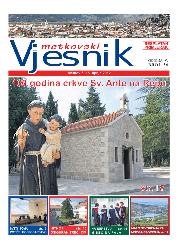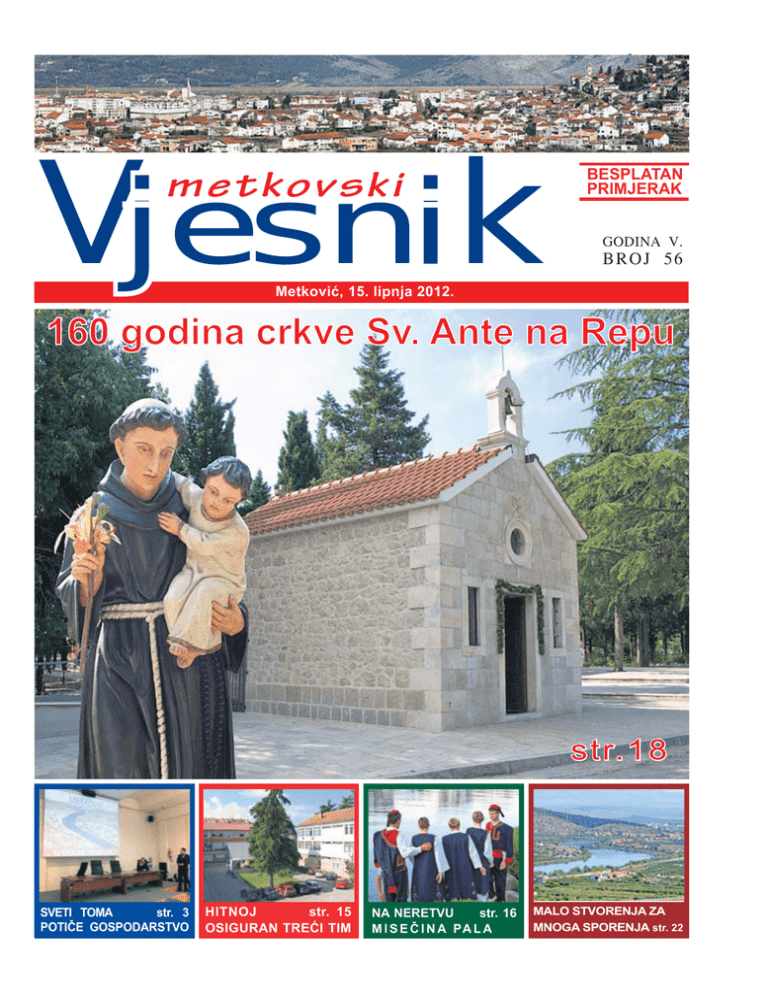 Vj esn i k metko vski petak, 15. lipnja 2012. Vj esn i k metko vski 1 BESPLATAN PRIMJERAK GODINA V. BR O J 5 6 Metković, 15. lipnja 2012. s t r. 1 8 SVETI TOMA str. 3 POTIČE GOSPODARSTVO HITNOJ str. 15 OSIGURAN TREĆI TIM NA NERETVU str. 16 M I S E Č I N A PA L A MALO STVORENJA ZA MNOGA SPORENJA str. 22 2 Vj esn i k metko vski Izgleda da nam ništa ne ide od ruke. Što god pokušali, naletimo na kakvu hrid o koju se razbije sva teorija i naše dobre namjere. Da se odmah razumijemo, nije za to kriva sadašnja vlast. Ona samo ne zna kako između hridi provesti naš mali brodić, a hridi su posijane na sve strane. Sijale su ih sve bivše vlasti, pa i biše bivše, a podosta podvodnih grebena posijali smo svi mi prihvativši olako sve čari neoliberalanoga kapitalizma. Jednostavno, nismo bili spremni za sve te šarene navlakuše kojima su nam pred očima mahali razni opsjenari. Dok smo mi, nakon što je konačno pala željezna zavjesa koja nas je dijelila od „naprednoga“ svijeta, kao hipnotizirani posezali za svim tim šarenilom, njegovi ponuđači gledali su samo u jednome smjeru – u smjeru naših džepova iz kojih je trebalo izvući još koju kunu. Konačno nam se pružila prigoda da svojega staroga Stojadina, Renaulta 4 ili, ne daj Bože, Fiću, zamijenimo Golfom, Audijem ili, daj Bože, Mercedesom. I sve to, bez kune u džepu! Trebalo je samo nešto potpisati, a pismeni toliko bili jesmo. Što se tiče željezne zavjese, kojom smo do ‘90. bili odijeljeni od svijeta naših čežnja, ona možda i jest bila željezna, ali je bila pletena dosta krupnim bodom, s mnoštvom rupa na kojima nam je pozavidio „vas“ Istočni blok. Tada još nismo mogli shvatiti da rupe nisu samo značile naš slobodan odlazak u Trst po traperice (koje su bile vrlo važan rekvizit pri osvajanju Čehinja u Gradcu ili Zaostrogu) nego su rupe postale način razmišljanja i djelovanja. Nije bilo toga zakona koji se nije mogao zaobići kojigod vlast smislila; tisućljetni genetski kôd, usađen nam borbom za opstanak, pronašao bi kakvu rupu, mala vrata ili obilaznicu. I sve do danas narod i država se tako međusobno varaju, a tek kada to prestane, ima nade da naš mali brodić zaplovi u mirnije vode. Kako to postići? Jednostavno, ali nikako brzo. Moj će naraštaj to teško dočekati, ali može puno učiniti. Može učiniti sve da stvori okvire u kojima će se mladi obrazovati, u kojima posao neće biti privilegij (pa da zbog toga padaju i ministri), u kojima će se znati koji su dobri, a koji zločesti, kojima je država na srcu, a kojima u džepu. Te naraštaje tek treba početi odgajati jer ovi današnji su (ne)odgojeni prema krivim uzorima, iako se to ne odnosi na većinu. Svake nam godine desetci tisuća mladih završe svoje obrazovanje za nepostojeća radna mjesta. Sposobni odlaze van, a ostali ostaju na milost i nemilost besposlici, apatiji, obiteljima koje pucaju po šavovima. Smisao života ubrzo postaje zabava na kratak dah popraćena drogom, alkoholom, jurnjavom cestama… To nas uništava. Svakim danom jedan stariji odlazi u mirovinu, a jedan mladi ne može ga naslijediti. Ne radi se tu o pitanju pada našega standarda, radi se tu o pitanju opstanka našega naroda. Ivica Puljan petak, 15. lipnja 2012. VIJESTI 22. sjednica Gradskoga vijeća N a sjednici Gradskoga vijeća Grada Metkovića, održanoj 5. lipnja pod predsjedavanjem dr. Darke Volarević, usvojeno je Izvješće o izvršenju proračuna Grada Metkovića od 1. siječnja do 31. prosinca 2011., kao i Prijedlog Odluke o raspodjeli rezultata proračuna ostvarenih u 2011. U spomenutome razdoblju ostvareni su ukupni prihodi u iznosu od 46.644.765,64 kuna, a ukupni rashodi iznosili su 47.442.650,09 kune. Manjku prihoda u iznosu od 797.884,45 kuna pridodan je manjak prihoda iz 2010. pa je na kraju godina završena s ukupnim manjkom prihoda nad rashodima u iznosu od 3.630.321,69 kuna, što će se pokriti iz prihoda 2012. godine. U nastavku sjednice, Vijeće je usvojilo tri prijedloga: Smjernica za organizaciju i razvoj sustava zaštite i spašavanja na području grada Metkovića za 2012. i 2013., Godišnji provedbeni plan unaprjeđenja zaštite od požara na području grada za 2012. te Plan evakuacije i zbrinjavanja turista za područje grada Metkovića. Na sjednici su podnesena i izvješća o radu i financijska izvješća za 2011. Ustanove Športski objekti Metković, Gradskoga kulturnog središta Metković, Gradske knjižnice Metković i Javne vatrogasne postrojbe Metković. Odvodnja u Ulici Mobine T ijekom poplava koje su Metković pogodile dva puta u 2010. probleme nije imala samo desna strana grada. Na lijevoj strani voda se izlila u samome središtu grada, ali je najteže bilo stanovnicima Mobina i dijelom u Ulici Petra Zoranića. Nakon što se voda povukla, građani tih ulica organizirali su potpisivanje peticije koja je upućena Upravnome odjelu za gospodarstvo Grada Metkovića u kojoj su tražili rješenje problema s odvodnjom oborinskih voda. Specifičnost tih ulica je da su nastale na bivšim poljskim putovima uz koje su išli nekadašnji odvodni kanali koji su završavali u Staroj Neretvi. Stihijskom izgradnjom kuća i ograđivanjem okućnica dio tih kanala je zatrpan, a preko dijela su čak napravljene ograde pa pri jakim oborinama voda više nije mogla otjecati do Stare Neretve. To se događalo svaki put za jakih kiša, ali kada su se dogodile dvije poplave, bilo je jasno da treba naći trajno rje- šenje. Stoga je Upravni odjel za gospodarstvo predložio, a gradonačelnik i Gradsko vijeće prihvatili da se uradi projekt rješenja odvodnje oborinskih voda u Mobinama te dijelu Ulice Petra Zoranića. Ponovno na prijedlog građana odlučeno je da se na javnim površinama izgrade i nogostupi jer tim ulicama svakodnevno u školu prolazi mnogo djece. Nogostupi s obiju strana bit će izgrađeni u dijelu Ulice Mobine od raskrižja s Ulicom Petra Zoranića pa do Stare Neretve, a u dijelu prema Ulici kralja Zvonimira nogostup će prolaziti 