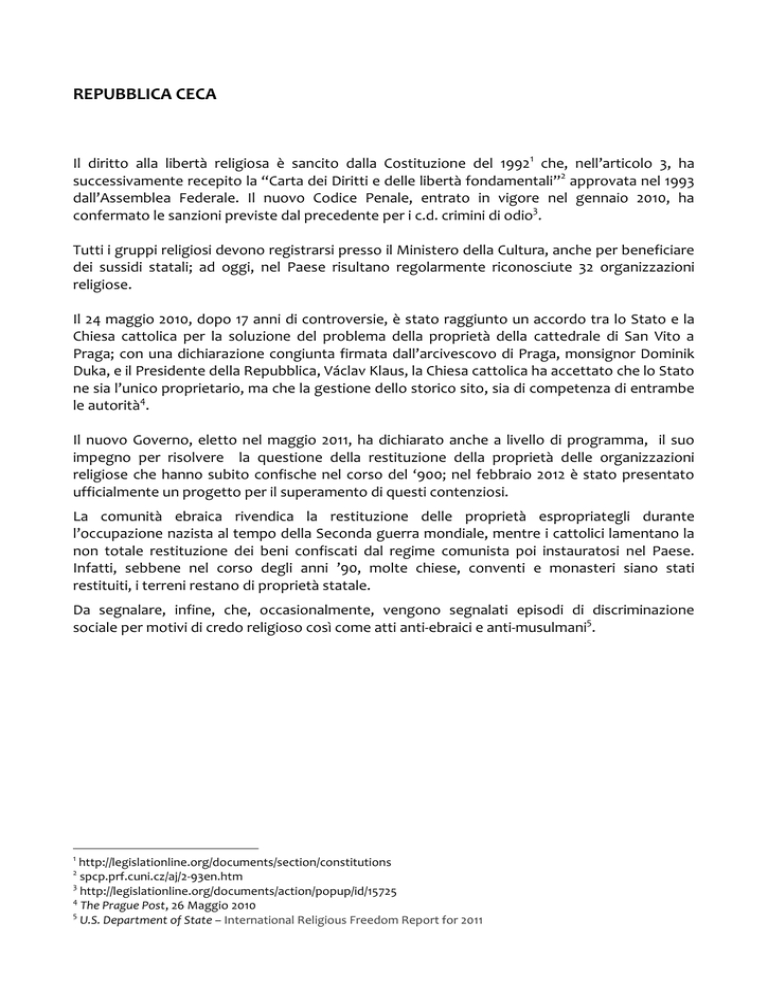 REPUBBLICA CECA Il diritto alla libertà religiosa è sancito dalla Costituzione del 19921 che, nell’articolo 3, ha successivamente recepito la “Carta dei Diritti e delle libertà fondamentali”2 approvata nel 1993 dall’Assemblea Federale. Il nuovo Codice Penale, entrato in vigore nel gennaio 2010, ha confermato le sanzioni previste dal precedente per i c.d. crimini di odio3. Tutti i gruppi religiosi devono registrarsi presso il Ministero della Cultura, anche per beneficiare dei sussidi statali; ad oggi, nel Paese risultano regolarmente riconosciute 32 organizzazioni religiose. Il 24 maggio 2010, dopo 17 anni di controversie, è stato raggiunto un accordo tra lo Stato e la Chiesa cattolica per la soluzione del problema della proprietà della cattedrale di San Vito a Praga; con una dichiarazione congiunta firmata dall’arcivescovo di Praga, monsignor Dominik Duka, e il Presidente della Repubblica, Václav Klaus, la Chiesa cattolica ha accettato che lo Stato ne sia l’unico proprietario, ma che la gestione dello storico sito, sia di competenza di entrambe le autorità4. Il nuovo Governo, eletto nel maggio 2011, ha dichiarato anche a livello di programma, il suo impegno per risolvere la questione della restituzione della proprietà delle organizzazioni religiose che hanno subito confische nel corso del ‘900; nel febbraio 2012 è stato presentato ufficialmente un progetto per il superamento di questi contenziosi. La comunità ebraica rivendica la restituzione delle proprietà espropriategli durante l’occupazione nazista al tempo della Seconda guerra mondiale, mentre i cattolici lamentano la non totale restituzione dei beni confiscati dal regime comunista poi instauratosi nel Paese. Infatti, sebbene nel corso degli anni ’90, molte chiese, conventi e monasteri siano stati restituiti, i terreni restano di proprietà statale. Da segnalare, infine, che, occasionalmente, vengono segnalati episodi di discriminazione sociale per motivi di credo religioso così come atti anti-ebraici e anti-musulmani5. 1 http://legislationline.org/documents/section/constitutions spcp.prf.cuni.cz/aj/2-93en.htm 3 http://legislationline.org/documents/action/popup/id/15725 4 The Prague Post, 26 Maggio 2010 5 U.S. Department of State – International Religious Freedom Report for 2011 2