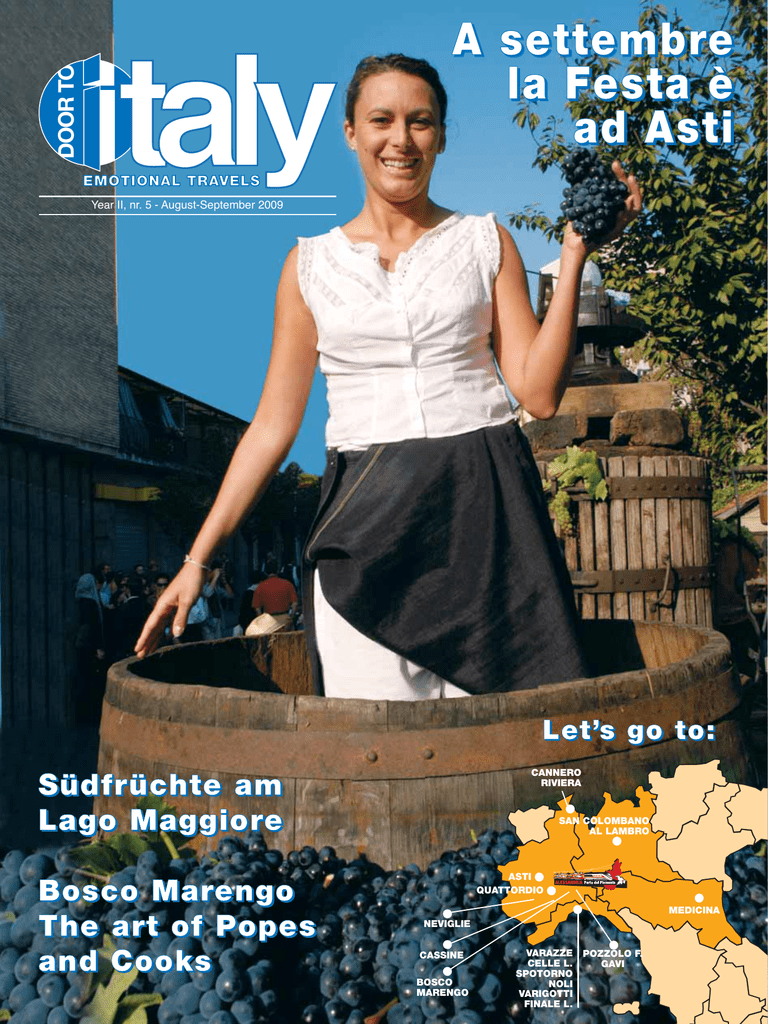 DOOR TO DOOR TO EMOTIONAL TRAVELS A s e t t e m b re la Festa è ad Asti EMOTIONAL TRAVELS Year II, nr. 5 - August-September 2009 L e t ’s g o t o : CANNERO RIVIERA Südfrüchte am L a g o M a g g i o re B o s c o M a re n g o The art of Popes and Cooks SAN COLOMBANO AL LAMBRO ASTI QUATTORDIO MEDICINA NEVIGLIE CASSINE BOSCO MARENGO VARAZZE CELLE L. SPOTORNO NOLI VARIGOTTI FINALE L. POZZOLO F. GAVI 2-08-2009 22:47 Pagina 2 2 DOOR TO doortoitaly agosto 09:Layout 3 the place of the month EMOTIONAL TRAVELS Vom 11. bis zum 20. September DALL’11 AL 20 SETTEMBRE Asti Stadt des Weins und der Gerichte von Annodazumal segna “Asti fa Goal” con tutte le eccellenze enogastronomiche del territorio. Ogni sera musica e spettacoli. Protagonista di questa grande kermesse sarà il Barbera d’Asti docg: sulle colline del Monferrato l’uva da sempre più coltivata è la Barbera e da questo vino rosso dipende l’economia di una delle aree più importanti del Piemonte vitivinicolo. Uno dei momenti più attesi è senz’altro il Festival delle Sagre che andrà in scena domenica 13 settembre in piazza Campo del Palio. Si inizia con la suggestiva sfilata con oltre 3.000 figuranti: giovani, vecchi e bambini, con gli attrezzi e gli animali della campagna, faranno rivivere un tempo che sembra perduto per sempre. La festa è un tripudio di odori e sapori: le Pro Loco astigiane sono pronte a servire a 300 mila turisti agnolotti, salamini, bagnacauda. A settembre la Festa è ad Asti. DOOR TO Dici Asti e dici vino ma anche tradizioni millenarie della campagna attorno alla città di San Secondo. A settembre la Camera di Commercio mette in mostra il meglio dell’enogastronomia locale, il frutto di saperi antichi. Questo appuntamento è preceduto dal Concorso Enologico Nazionale “Premio Douja d’Or”: i 506 vini italiani premiati, tra cui i 40 Oscar della Douja d’Or 2009 saranno in degustazione al Salone nazionale a Palazzo del Collegio, accompagnati ogni giorno da “piatti d’autore” cucinati dai migliori chef astigiani e dalle specialità gastronomiche proposte dalle associazioni di categoria. Ma sono molte le location dove trovare il meglio della produzione enologica e non solo: a Palazzo Ottolenghi ci sarà la Douja della Barbera e la Rassegna dell’Alta Langa, a Palazzo Alfieri si terrà la Douja dell’Asti, lo spumante aromatico più conosciuto nel mondo. Palazzo dell’Enofila è sede della ras- 11-20 SEPTEMBER ASTI city of wine and ancient savours The real protagonist of this great exhibition will be the Barbera d’Asti docg wine, as barbera is by far the most cultivated grape in Monferrato hills and its red wine is very important for the whole area economy. Another traditionally high expected day is the second Sunday of September: on the 13th, Festival delle Sagre will be performed at Piazza Campo del Palio. More than 3.000 people in genuine old Piedmontese costumes will march in parade before serving, with the several Asti province’s Pro Loco (touristic associations), agnolotti, taglierini, salamini, bagnacauda and many more traditional dishes to more than 300.000 enthusiastic visitors. In September the real, great feast is in Asti! DOOR TO Asti, the city of San Secondo, means wine but even its thousands year old traditions. Every year in September the local Chamber of Commerce displays wines and traditional food at its best. First, the National Wine Challenge “Premio Douja d’Or” will award 506 Italian wines, and the best 40 of them will be declared “Oscar della Douja 2009”. All these wines will be on tasting at the Salone Nazionale in Palazzo del Collegio, accompanied by “the author’s recipes” daily cooked by the best chefs of Asti province together with trade and producer associations. The best wines and food can be also tasted at Palazzo Ottolenghi (La Douja della Barbera and the Alta Langa Show), at Palazzo Alfieri (la Douja dell’Asti, the most famous aromatic spumante in the world). At Palazzo dell’Enofila will take place Asti fa Goal , where all the best food specialities will be displayed for tasting. Every night people will also enjoy music and shows. DOOR TO Asti città del vino e dei sapori antichi Sagt man “Asti”, sagt man auch “Wein”. Im September zeigt die Handelskammer das Beste, was die lokale, aus antiker Tradition hervorgegangene Önogastronomie zu bieten hat. Voran geht dieser Veranstaltung der Nationale Weinwettbewerb “Premio Douja d’Or”: die dabei 506 prämierten italienischen Weine, darunter die 40 Oscar der Douja d’Or 2009 können im “Salone nazionale” im Palazzo del Collegio verkostet werden, jeden Tag von „Autoren-Gerichten” begleitet, außerdem bieten die Fachverbände gastronomische Spezialitäten. Auch an anderen Stellen kann man finden, was Wein- und andere Produktionen an Köstlichkeiten zu bieten haben: im Palazzo Ottolenghi auf der Douja della Barbera und der Rasegna dell’Alta Langa, im Palazzo Alfieri auf der Douja dell’Asti, mit dem weltweit bekannten aromatischen Spumante. Palazzo dell’Enofila ist Veranstaltungsort von “Asti fa Goal” (Tor für Asti), mit allen önogastronomischen Besonderheiten der Gegend. Dazu jeden Abend Musik und Vorführungen. Hauptfigur dieser Schau ist der Barbera d’Asti docg: Auf den Hügeln des Monferrato ist Barbera seit jeher die am meisten angebaute Traube und von diesem Rotwein hängt die Wirtschaft einer der bedeutendsten Weingegenden des Piemont ab. Das Festival delle Sagre, das am 13. September auf der Piazza Campo del Palio stattfindet, gehört sicher zu den am meisten erwarteten Momente. Es beginnt mit einem malerischen Umzug mit mehr als 3.000 Teilnehmern: Jugendliche, alte Menschen und auch Kinder, lassen mit Werkzeugen und Tieren eine Zeit wieder auferstehen, die ganz verloren gegangen zu sein schien. Ein Freudenfest der Düfte und Geschmäcker: die Fremdenverkehrsvereine von Asti werden 300.000 Touristen Agnolotti, Salamini, und Bagnacauda bieten. Im September 