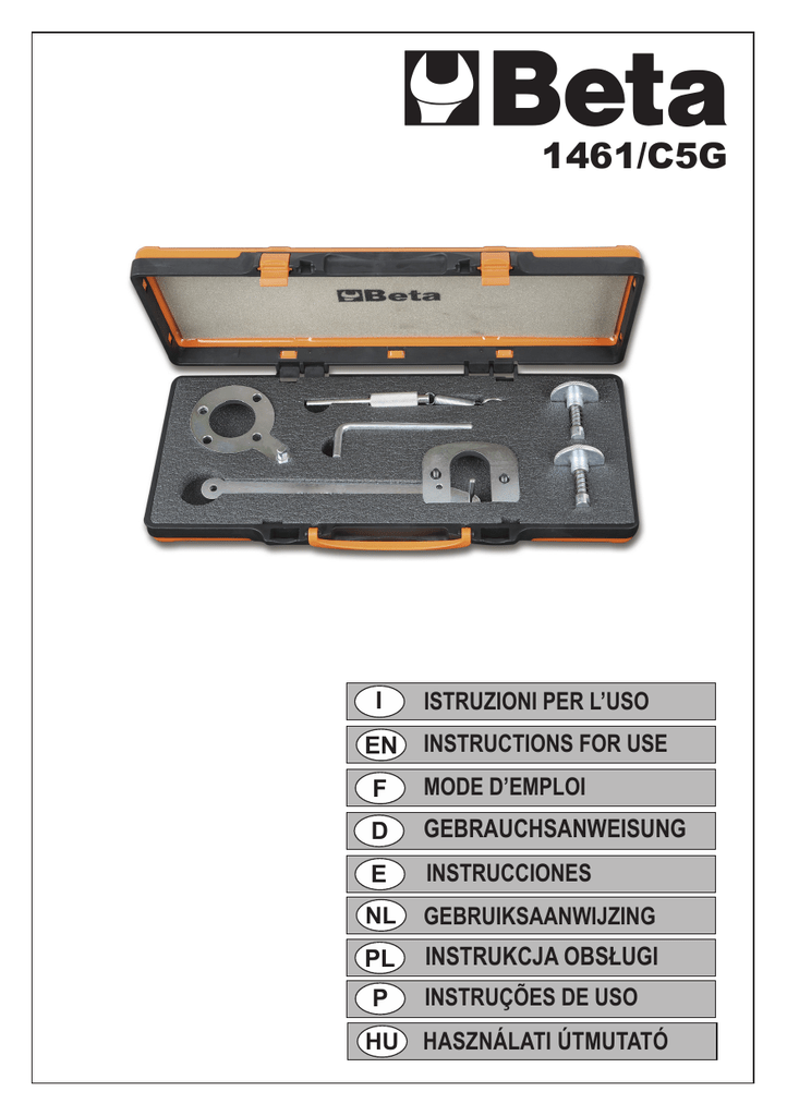 1461/C5G I EN ISTRUZIONI PER L’USO INSTRUCTIONS FOR USE F MODE D’EMPLOI D GEBRAUCHSANWEISUNG E INSTRUCCIONES NL GEBRUIKSAANWIJZING PL INSTRUKCJA OBSŁUGI P INSTRUÇÕES DE USO HU HASZNÁLATI ÚTMUTATÓ I ISTRUZIONI PER L’USO KIT MESSA IN FASE E BLOCCAGGIO ALBERO MOTORE 1.3 Multi Jet COMPONENTI: Codice Beta E811 Codice OEM 1 870 900 300, KM-662-C, 303-1468 Descrizione Attrezzo messa in fase albero motore E813 1 870 900 400 F184/1 1 871 000 900, 1 860 985 000, EN-46781, 303-1472, 09917 - 68610 Attrezzi per bloccaggio albero a camme NV092 1 871 000 200, - KM-661-C, 303-1469 Perno di bloccaggio puleggia albero motore NV095 EN-46785, 09912 38300 Chiave di tensionamento catena distribuzione Perno di bloccaggio volano APPLICAZIONE MARCA Fiat Lancia Opel Suzuki Ford 2 MODELLO Punto, Panda, Idea, Doblo, Stilo Ypsilon, Musa Corsa, Agila, Meriva, Combo Tour Ignis, Swift, Vagon R+ Ka MOTORE 1,3 JTD Multi-jet; 1,3D Multijet 75; 1,3D Multijet 95; 1,3D JTD/Multijet 70; 1,3D Multijet 70; 1,3D Multijet 85; 1,3D Multijet 90; 1,3D Multijet 95, 1,3 TDCi; 1,3 CDTi Codice Motore 188A9.000, 199A3.000, 199B1.000, 199A2.000, 169A1.000, 199A9.000, 188A8.000, 199B2.000, 223A9.000, 169A1.000 (FD4) / BAAA/B, Z13DT, Z13DTH, Z13DTJ I ISTRUZIONI PER L’USO Codice OEM Codice motore 1 871 000 900; 1 860 985 000; EN-46781; 303-1472; 09917 68610 EN-46785; 09912 38300 1 871 000 200; KM-661-C; 303-1469 1 870 900 300; KM-662-C; 303-1468 1 870 900 400 188A9.000, 199A3.000 ● ● ● ● 199B1.000 ● ● ● ● 199A2.000, 169A1.000 ● ● ● ● 199A9.000 ● ● ● ● 188A8.000 ● ● ● ● 199B2.000 ● ● ● ● 223A9.000 ● ● ● ● 199A3.000 ● ● ● ● 169A1.000 (FD4) / BAAA/B ● ● ● ● Z13DT, Z13DTH, Z13DTJ ● ● ● ● Precauzioni speciali - Leggere attentamente • • • • • • • • • • • • • • • • Scollegare il cavo della batteria dal polo negativo di terra (verificare il codice radio se disponibile) Rimuovere le candele o le candelette per facilitare la rotazione del motore Non utilizzare detersive liquidi su cinghie, pignoni o tensionatori Segnare il senso di rotazione della cinghia ausiliaria prima di rimuoverla Ruotare il motore in senso orario (antiorario solo se specificato) Non ruotare mai l’albero a camme, l’albero motore o la pompa d’iniezione diesel quando la catena è già stata rimossa (a meno che non sia specificato) Non utilizzare la catena di distribuzione per bloccare il motore quando si allentano o si stringono i bulloni della puleggia dell’albero motore Non ruotare l’albero motore o l’albero a camme quando la cinghia / catena è già stata rimossa Prima di rimuovere la catena, segnare la sua direzione È sempre consigliato ruotare il motore lentamente manualmente e riverificare il posizionamento dell’albero motore e dell’albero a camme Gli alberi a camme e motore possono essere ruotati solamente quando il meccanismo di azionamento della catena / cinghia è completamente installato. Non ruotare il motore azionando l’albero a camme o altri ingranaggi Verificare la corretta posizione della pompa d’iniezione diesel dopo aver sostituito la catena Osservare tutte le coppie di serraggio Attenersi sempre al manuale della casa costruttrice o al libretto d’istruzioni fornito Una fasatura del motore non precisa o sbagliata comporta il danneggiamento delle valvole 3 EN INSTRUCTIONS FOR USE DRIVING SHAFT TIMING AND LOCKING KIT, 1.3 Multi Jet PARTS: Beta item number E811 OEM item number Description 1 870 900 300, KM-662-C, 303-1468 Driving shaft timing device E813 1 870 900 400 F184/1 1 871 000 900, 1 860 985 000, EN-46781, 303-1472, 09917 - 68610 Camshaft locking devices NV092 1 871 000 200, - KM-661-C, 303-1469 Driving shaft pulley locking pin NV095 EN-46785, 09912 38300 Distribution chain tensioning wrench Flywheel locking pin APPLICATION Brand Fiat Lancia Opel Suzuki Ford 4 Model Punto, Panda, Idea, Doblo, Stilo Ypsilon, Musa Corsa, Agila, Meriva, Combo Tour Ignis, Swift, Vagon R+ Ka Engine 1,3 JTD Multi-jet; 1,3D Multijet 75; 1,3D Multijet 95; 1,3D JTD/Multijet 70; 1,3D Multijet 70; 1,3D Multijet 85; 1,3D Multijet 90; 1,3D Multijet 95, 1,3 TDCi; 1,3 CDTi Engine number 188A9.000, 199A3.000, 199B1.000, 199A2.000, 169A1.000, 199A9.000, 188A8.000, 199B2.000, 223A9.000, 169A1.000 (FD4) / BAAA/B, Z13DT, Z13DTH, Z13DTJ EN INSTRUCTIONS FOR USE OEM item number Engine number 1 871 000 900; 1 860 985 000; EN-46781; 303-1472; 09917 68610 EN-46785; 09912 38300 1 871 000 200; KM-661-C; 303-1469 1 870 900 300; KM-662-C; 303-1468 1 870 900 400 188A9.000, 199A3.000 ● ● ● ● 199B1.000 ● ● ● ● 199A2.000, 169A1.000 ● ● ● ● 199A9.000 ● ● ● ● 188A8.000 ● ● ● ● 199B2.000 ● ● ● ● 223A9.000 ● ● ● ● 199A3.000 ● ● ● ● 169A1.000 (FD4) / BAAA/B ● ● ● ● Z13DT, Z13DTH, Z13DTJ ● ● ● ● Safety Precautions - Please read • • • • • • • • • • • • • • • • • Disconnect the battery earth leads (check radio code is available) Remove spark or glow plugs to make the engine turn easier Do not use cleaning fluids on belts, sprockets or rollers Always make a note of the route of the auxiliary drive belt before removal Turn the engine in the normal direction (clockwise unless stated otherwise) Do not turn the camshaft, crankshaft or diesel injection pump once the timing chain has been removed (unless specifically stated) Do not use the timing chain to lock the engine when slackening or tightening crankshaft pulley bolts Do not turn the crankshaft or camshaft when the timing belt/chain has been removed Mark the direction of the chain before removing It is always recommended to turn the engine slowly, by hand and to re-check the camshaft and crankshaft timing positions. Crankshafts and Camshafts may only be turned with the chain drive mechanism fully installed. Do not turn crankshaft via camshaft or other gears Check the diesel injection pump timing after replacing