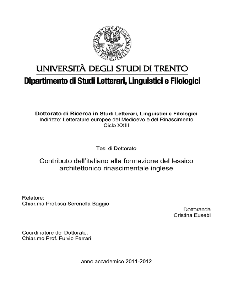 Dottorato di Ricerca in Studi Letterari, Linguistici e Filologici Indirizzo: Letterature europee del Medioevo e del Rinascimento Ciclo XXIII Tesi di Dottorato Contributo dell’italiano alla formazione del lessico architettonico rinascimentale inglese Relatore: Chiar.ma Prof.ssa Serenella Baggio Dottoranda Cristina Eusebi Coordinatore del Dottorato: Chiar.mo Prof. Fulvio Ferrari anno accademico 2011-2012 Premessa 1. La tradizione medievale della terminologia architettonica pag. 1 6 1. Il ruolo dell’architetto in età medievale 2. Il posto dell’architettura nella classificazione medievale 6 13 delle arti 3. Architettura ed enciclopedismo medievale 4.La terminologia architettonica nelle fonti documentarie 19 29 2. La formazione del lessico architettonico italiano: 41 dalla traduzione di Vitruvio alla trattatistica architettonica 3 4 Terminologia architettonica e tradizione lessicografica 1. I lessici cinquecenteschi e la terminologia architettonica 2. Terminologia architettonica e vocabolario della Crusca 3. Lessici bilingui e tecnicismi: il dizionario di John Florio 63 L’ingresso degli italianismi architettonici nell’Inghilterra rinascimentale 1. Diffusione degli italianismi architettonici in Inghilterra tra 124 XVI e XVIII secolo 2. Influenza italiana nell'Inghilterra elisabettiana. Le modalità di diffusione delle conoscenze architettoniche italiane nel XVI secolo 5 6 63 73 92 124 135 Traduzioni e trattati architettonici dell’Inghilterra del XVI secolo 1.The first and chief groundes of Architecture di Shute 2. Il Tracte di Haydocke 3. The First [Fift] Booke of Architecture di Serlio 159 Presenza dell’italiano nella lingua dell’architettura inglese dell’età di Inigo Jones 1. La figura dell’architetto e la trattatistica architettonica 197 nella prima metà del Seicento inglese 2. The Elements of Architecture di Henry Wotton 159 171 183 197 3. Diari di viaggio 4. Inigo Jones On Palladio 201 220 240 Conclusioni 249 Glossario Appendice 1 Appendice 2 Appendice 3 Riferimenti bibliografici 256 288 304 308 316 Quelle discipline che noi abbiamo formate (per esempio l’architettura) hanno i nostri vocaboli anche presso le altre nazioni (Leopardi, Zibaldone, 9 giugno 1820) PREMESSA Negli ultimi decenni l’attenzione ai testi settoriali e alla loro terminologia è notevolmente cresciuta: ne è testimonianza il moltiplicarsi di studi lessicali e di pubblicazioni di edizioni critiche di testi tecnici, ad opera di istituti e centri di ricerca (ricordiamo, tra gli altri, l’ILIESI, Istituto Lessico Intellettuale Europeo e Storia delle Idee del CNR, che sta attualmente curando un progetto incentrato sul lessico europeo della filosofia e della scienza, e il SIGNUM, del Centro di ricerche informatiche per le discipline umanistiche della Scuola Normale Superiore di Pisa, che si occupa della catalogazione e gestione informatica di fonti documentarie, con particolare attenzione alle fonti storico artistiche). Il settore della lingua dell’architettura è stato anch’esso oggetto di attente analisi: dopo i primi, pioneristici, studi di Nencioni, diversi ricercatori hanno rivolto la propria attenzione alla genesi del lessico architettonico italiano, sia studiando le scelte linguistiche di volgarizzatori e trattatisti italiani,1 sia svolgendo ricerche sulla diffusione del lessico artistico italiano a livello europeo. 2 In effetti la formazione e la diffusione della lingua dell’architettura costituiscono un soggetto di studio, ancora per molti versi da approfondire, che offre diversi elementi di interesse per la storia della lingua italiana: quella architettonica è una delle prime terminologie di settore ad affermarsi a livello sovraregionale e a costituire un sistema 1 In particolare si ricorda Marco Biffi, che si è soffermato sul lessico architettonico di Francesco di Giorgio Martini, di Leonardo e di diversi autori di diversi autori di volgarizzamenti e commentari vitruvani 2 Pochi mesi prima della conclusione del presente lavoro è stata pubblicata una ricerca di Matteo Motolese sulla diffusione a livello europeo del lessico artistico italiano 1 relativamente organico. Al contempo, essa sviluppa sin dall’inizio una forte vocazione ad accogliere apporti di diversa origine, tanto da essere caratterizzata da una notevole presenza di sinonimi, che la distingue da altre terminologie tecniche in cui ha prevalso una tendenza selettiva volta a salvaguardare la corrispondenza biunivoca vocaboloreferente. Già sul finire del Quattrocento, con i primi volgarizzamenti di Vitruvio, e ancor più nel Cinquecento, con la stampa di traduzioni vitruviane e di trattati corredati di tavole illustrative munite di didascalie, si afferma un nucleo di vocaboli che ha ampia diffusione. Si tratta, come è stato evidenziato dagli studiosi che si sono occupati di questa prima fase, di un lessico che incorpora numerose varianti regionali e in cui, alla variabilità diatopica, si aggiungono elementi di variabilità diastratica (poiché ad usare tale terminologia sono i ricchi e colti committenti, gli architetti, i capomastri e i manovali) e diamesica (poiché è un linguaggio tramandato per duplice via: orale, nelle botteghe e nei cantieri, e scritta, nei trattati di architettura). Tale patrimonio terminologico, decisamente composito, conosce nella seconda metà del Cinquecento e nel Seicento una grande fortuna all’estero: seguendo il diffondersi delle idee rinascimentali a livello europeo e la fortuna del modello cortigiano italiano, ha infatti modo di irradiarsi e di giungere ad un’ulteriore evoluzione negli adattamenti in altre lingue. L’uso sovranazionale porta alla costituzione di una lingua di koiné a base italiana e latina, comprensiva di forme che hanno tratti di continuità e tratti peculiari nelle diverse nazioni. Obiettivo della presente tesi è indagare, all’interno di questo processo, l’apporto dell’italiano alla formazione del lessico architettonico rinascimentale inglese. Si è sce