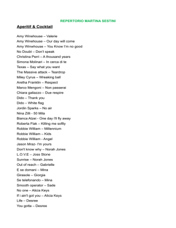 REPERTORIO MARTINA SESTINI Aperitif & Cocktail Amy Winehouse – Valerie Amy Winehouse – Our day will come Amy Winwhouse – You Know I’m no good No Doubt – Don’t speak Christina Perri – A thousand years Simona Molinari – In cerca di te Texas – Say what you want The Massive attack – Teardrop Miley Cyrus – Wreaking ball Aretha Franklin – Respect Marco Mengoni – Non passerai Chiara galiazzo – Due respire Dido – Thank you Dido – White flag Jordin Sparks – No air Nina Zilli - 50 Mila Bianca Atzei - One day i'll fly away Roberta Flak – Killing me softly Robbie William – Millennium Robbie William – Kids Robbie William - Angel Jason Mraz- I'm yours Don't know why – Norah Jones L.O.V.E – Joss Stone Sunrise – Norah Jones Out of reach – Gabrielle E se domani – Mina Girasole – Giorgia Se telefonando – Mina Smooth operator – Sade No one – Alicia Keys If i ain't got you – Alicia Keys Life – Desree You gotta – Desree Giorgia – E poi Cass Elliot – Dream a little dream Alicia keys – girl on fire Etta James -- at last Texas – Say what you want Aretha Franklin – A natural woman Mariah Carey – I want to know what love is Stevie Wonder – Overjoyed Stevie Wonder – I just come to say I love you Queen – Somebody to love Michael Boublè – Save the last dance for me Elisa – Qualcosa che non c’è Annalisa Scarrone – Senza riserva Annalisa Scarrone – Diamante lei e luce lui Annalisa scarrone – Mi sei scoppiato dentro al cuore Shakira – Gipsy Mina – Parole parole parole Cindy lauper – Time after time Elisa – Love is requited Giorgia – è l’amore che conta Malika Ayana – Come foglie Elisa – a feast for me Elisa – the marriage Alex Baroni – Cambiare Alanis Morrisette – You learn Diane Ross – Do you know where you going to Alessandra Amoroso – Arrivi tu Madonna – take a bow Madonna – Secret Atomic Kitten – Eternal Flame Eppure sentire – Elisa I'm like a bird – Nelly Furtado True colors – Cindy Lauper Adele- Turning tables Alicia Keys – Empire state of mine part II Alicia Keya – Fallin Anggun – Snow on the sahara Alexia – Per dire di no Christina Aguilera – Beautiful Celine Dion – My heart will go on Elisa – dancing Elisa – Almeno tu nell'universo Emma Marrone – Sarò libera Faith Hill – There you'll be Francesco Renga – Ci sarai Giorgia – Come saprei Giorgia – Strano il mio destino Sade – By your side Giorgia – di sole e d'azzurro Leona Lewis – Bleeding love Laura Pausini – Vivimi Laura Pausini – E ritorno da te Laura Pausini – Spaccacuore Laura Pausini – Ascolta il tuo cuore Laura Pausini – Un fatto ovvio Madonna – frozen Madonna – You'll see Mina – Volami nel cuore Marco Mengoni – In un giorno qualunque Mia Martini – Minuetto Mina – E se domani Mina – Insieme Mina – Grande grande grande Noemi – Briciole Patty Pravo – E dimmi che non vuoi morire Irene Grandi – Buon compleanno Ivana Spagna – Il cerchio della vita Ivana Spagna – Gente come noi Roxette – it must have been love Roberta Flack – Killing me softly Withney Houston – I will Always love you Mariah carey – Hero Mariah Carey – My all Mariah Carey - .Without you Irene Grandi – Che vita è Mika – Relax Laura Pausini – Limpido Giorgia - pregherò Emma Marrone – Dimentico tutto Marco Mengoni – Pronto a correre Kt Tundstall – The big black horse and the cherry tree Lacuna Coil – Enjoy the silence Katie Perry – Roar Pink – True love Florence and the machine – You’ve got to love Ace of base – Life is a flower Beyoncè – Irreplaceable Beyoncè – Sweet dreams Pink – Who Knew Pink – Try Bonnie Tyler – Total eclipse of the heart Elisa – L’anima vola Justin Timberlake – Mirrors Michael Jakson – Billie jean Daft punk – Get luky Mika- relax Mika - Love today MIka . sturdust Florence and the machine - You've got the love Elisa – gift Elisa – Qualcosa che non c’è Elisa – Love is requited Elisa – Stay Elisa – Broken Elisa - Ecco che Jennifer Lopez – I’m into you Katy Parry – Wade awake Katy Perry – California girls Jamelia – Superstar Kings of leon – Use somebody Kathrine and the wawes – walking on sunshine Jojo – Leave Lisa Minelli – New York New York Lady gaga – Just dance Lady gaga – Born in this way Natalie Imbruglia – Torn Lovefool – The Cardigans La isla bonita – Madonna Primavera – Marina Rei The rithm is magic – Marie Claire D'Ubaldo Luce – Elisa In vacanza da una vita – Irene Grandi Merci – Duffy Rehab – Amy Winehouse I kissed a girl – Katy Perry Mi chico latino – Gery Halliwell Material girl – Madonna Bruci la città – Irene Grandi Rain on your parade – Duffy Rome was build in a day – Morcheeba Hot n' cold - Katy Perry Someone like you – Adele Set fire to the rain – Adele Rolling in the deep – Adele S&M – Rihanna Rihanna – Te amo Lean Rimes – Can't fight the moonlight Fiorella Mannoia – Quello che le donne non dicono Emma Marrone – Con le nuvole Celine Dion – A new Day has come Michael Jackson – Black or white Anastacia – Heavy on my heart Giorgia – Un'ora sola ti vorrei Malika Ayane – Ricomincio da qui Malika Ayane – La prima cosa bella Alanis Morissette – You outta know Noemi – Vuoto a perdere Giorgia – il mio giorno migliore Queen – Somebody to love Queen – The show must go on Queen – I want to break free Jennife Lopez – Love don't cost a thing Malika Ayane – Come foglie Christina Aguilera – Genie in a bottle Christina Aguilera – What a girl want Tina Turner – Goldeneye Modà – La notte Modà – Sono già solo Tina Turner – Simply the best madonna – American Pie Madonna – Like a prayer Michael Jackson – Beat it Francesco Renga – Cambio direzione Emma Marrone – Cullami Anastacia – Sick and tired Shania Twain – man i feel like a woman Queen – Don't stop me now Mina – Parole parole parole