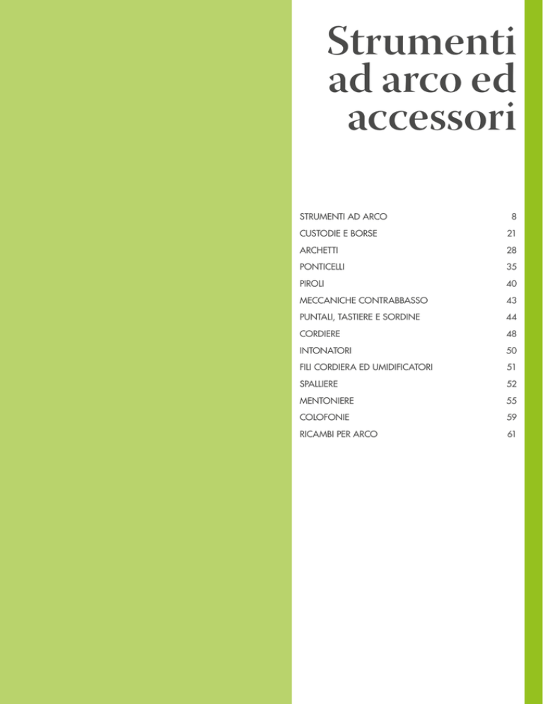 Strumenti ad arco ed accessori STRUMENTI AD ARCO CUSTODIE E BORSE 8 21 ARCHETTI28 PONTICELLI35 PIROLI40 MECCANICHE CONTRABBASSO 43 PUNTALI, TASTIERE E SORDINE 44 CORDIERE48 INTONATORI50 FILI CORDIERA ED UMIDIFICATORI 51 SPALLIERE52 MENTONIERE55 COLOFONIE59 RICAMBI PER ARCO 61 Violino con custodia ed arco VIOLINO RIALTO VIOLINO STENTOR STUDENT I Il Violino Domus Rialto, costituisce lo strumento ideale per chi inizia, offrendo un eccezionale prodotto ad un costo estremamente contenuto. Lo strumento, interamente in legno massello, viene fornito corredato di una muta di corde Dogal V21 (non montate), cordiera completa di intonatori in metallo, archetto e custodia. La sonorità e la costruzione sono assimilabili a strumenti di livello superiore (Student I). Lo strumento è “NP” Non Preparato dal nostro liutaio, pertanto non sarà accompagnato dal nostro certificato di controllo e sarà corredato da corde e colofonia di provenienza cinese. “Stentor Student I” è un violino di fattura superiore, tanto da non temere rivali nella propria categoria. Strumento in acero e abete tutto massello realizzato a mano con legni stagionati naturalmente da almeno tre anni. Piroli e mentoniera in palissandro, cordiera in metallo con quattro intonatori incorporati e Corde Dogal R31. Ogni singolo strumento viene accuratamente controllato dal nostro Laboratorio di Liuteria e corredato da Certificato di Controllo. I Violini “Stentor Student I” da oltre trent’anni sono adottati da Insegnanti di molti paesi europei, in virtù di superiori specifiche, ottime finiture ed un’ampia combinazione d’accessori, il tutto ad un prezzo estremamente contenuto. Particolare del ponticello preparato dal nostro laboratorio di liuteria. CODICE DESCRIZIONE CODICE DESCRIZIONE VL1000 VL1010 VL1020 VL1030 VL1040 VL1050 VL1060 - Violino 4/4 con custodia ed arco VL1100 VL1110 VL1120 VL1130 VL1140 VL1150 VL1160 VL1170 VL1180 - Violino 4/4 con custodia ed arco Violino 3/4 con custodia ed arco Violino 1/2 con custodia ed arco Violino 1/4 con custodia ed arco Violino 1/8 con custodia ed arco Violino 1/10 con custodia ed arco Violino 1/16 con custodia ed arco Violino 3/4 con custodia ed arco Violino 1/2 con custodia ed arco Violino 1/4 con custodia ed arco Violino 1/8 con custodia ed arco Violino 1/10 con custodia ed arco Violino 1/16 con custodia ed arco Violino 1/32 con custodia ed arco Violino 1/64 con custodia ed arco Versione NP (strumento Non Preparato) E’ possibile acquistare lo strumento in versione “base” senza alcun intervento da parte del nostro laboratorio di liuteria. La versione “NP” non sarà pertanto accompagnata dal nostro certificato di controllo e sarà corredata da corde e colofonia di provenienza cinese. Lo strumento potrebbe necessitare di eventuali regolazioni. 8 CODICE DESCRIZIONE VL1100NP VL1110NP VL1120NP - Violino 4/4 con custodia ed arco Violino 3/4 con custodia ed arco Violino 1/2 con custodia ed arco Domus Musica s.r.l. Tel: +39 041 923927 Violino con custodia ed arco VIOLINO STENTOR STUDENT II VIOLINO STENTOR CONSERVATOIRE I Violini “Stentor Student II”, di concezione europea, rappresentano un consistente progresso nella qualità e nelle specifiche degli strumenti da studio. Strumento massello realizzato in legno d’acero e abete interamente a mano, “Student II” ha tastiera, capotasto, piroli e mentoniera in ebano, cordiera in metallo con quattro intonatori incorporati. Lo strumento si completa con corde Dogal Marchio Rosso R31, custodia con doppia tracolla ed archetto in legno con nasetto in ebano e colofonia tedesca Royal Oak. Controllato singolarmente nel nostro Laboratorio di Liuteria, ed accompagnato da Certificato di Controllo, lo strumento viene consegnato pronto per essere suonato. Disponibile anche con vernice satinata per il solo modello 4/4. Chiusura porta archi in velcro per non danneggiare lo strumento Strumento indicato per un avanzato livello di studio. Ricavato interamente a mano da Legni altamente selezionati, “Conservatoire” viene offerto ad un eccellente rapporto qualità/prezzo. Capotasto, tastiera, piroli e mentoniera in Ebano Superiore, ponticello Francese o Tedesco, colofonia Tedesca Royal Oak, corde Dogal Vivaldi serie T81. Un tono eccezionale contraddistingue lo strumento. Consegnato in custodia rettangolare con tasca porta musica, interno in velour, due porta archi, tasca per accessori e doppia tracolla. Il violino “Conservatoire” è corredato di archetto ottagonale di ottima fattura con nasetto in Ebano, crini naturali, e copri strumento. Controllo dello strumento prima della spedizione CODICE DESCRIZIONE CODICE DESCRIZIONE VL1200 VL1200SN VL1205 VL1210 VL1220 VL1230 VL1240 - Violino 4/4 con custodia ed arco VL1300 VL1310 VL1320 VL1330 - Violino 4/4 con custodia ed arco Vl satinato 4/4 con custodia ed arco Violino 7/8 con custodia ed arco Violino 3/4 con custodia ed arco Violino 3/4 con custodia ed arco Violino 1/2 con custodia ed arco Violino 1/4 con custodia ed arco Violino 1/2 con custodia ed arco Violino 1/4 con custodia ed arco Violino 1/8 con custodia ed arco Versione NP (strumento Non Preparato) E’ possibile acquistare lo strumento in versione “base” senza alcun intervento da parte del nostro laboratorio di liuteria. La versione “NP” non sarà pertanto accompagnata dal nostro certificato di controllo e sarà corredata da corde e colofonia di provenienza cinese. Lo strumento potrebbe necessitare di eventuali regolazioni. Versione NP (strumento Non Preparato) E’ possibile acquistare lo strumento in versione “base” senza alcun intervento da parte del nostro laboratorio di liuteria. La versione “NP” non sarà pertanto accompagnata dal nostro certificato di controllo e sarà corredata da corde e colofonia di provenienza cinese. Lo strumento potrebbe necessitare di eventuali regolazioni. CODICE DESCRIZIONE CODICE DESCRIZIONE VL1200NP VL1210NP VL1220NP - Violino 4/4 con custodia ed arco VL1300NP VL1310NP VL1320NP - Violino