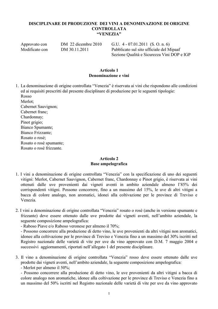 DISCIPLINARE DI PRODUZIONE DEI VINI A DENOMINAZIONE DI ORIGINE CONTROLLATA “VENEZIA” Approvato con Modificato con DM 22 dicembre 2010 DM 30.11.2011 G.U. 4 - 07.01.2011 (S. O. n. 6) Pubblicato sul sito ufficiale del Mipaaf Sezione Qualità e Sicurezza Vini DOP e IGP Articolo 1 Denominazione e vini 1. La denominazione di origine controllata “Venezia” è riservata ai vini che rispondono alle condizioni ed ai requisiti prescritti dal presente disciplinare di produzione per le seguenti tipologie: Rosso Merlot; Cabernet Sauvignon; Cabernet franc; Chardonnay; Pinot grigio; Bianco Spumante; Bianco Frizzante; Rosato o rosè; Rosato o rosè spumante; Rosato o rosè frizzante. Articolo 2 Base ampelografica 1. I vini a denominazione di origine controllata “Venezia” con la specificazione di uno dei seguenti vitigni: Merlot, Cabernet Sauvignon, Cabernet franc, Chardonnay e Pinot grigio, è riservata ai vini ottenuti dalle uve provenienti dai vigneti aventi in ambito aziendale almeno l’85% dei corrispondenti vitigni. Possono concorrere, fino a un massimo del 15%, le uve di altri vitigni a bacca di colore analogo, non aromatici, idonei alla coltivazione per le province di Treviso e Venezia. 2. I vini a denominazione di origine controllata “Venezia” rosato o rosè (anche in versione spumante e frizzante) deve essere ottenuto dalle uve prodotte dai vigneti aventi, nell’ambito aziendale, la seguente composizione ampelografica: - Raboso Piave e/o Raboso veronese per almeno il 70%; - Possono concorrere alla produzione di detto vino, le uve provenienti da altri vitigni non aromatici, idonee alla coltivazione per le province di Treviso e Venezia fino a un massimo del 30% iscritti nel Registro nazionale delle varietà di vite per uve da vino approvato con D.M. 7 maggio 2004 e successivi aggiornamenti, riportati nell’allegato 1 del presente disciplinare. 3. Il vino a denominazione di origine controllata “Venezia” rosso deve essere ottenuto dalle uve prodotte dai vigneti aventi, nell’ambito aziendale, la seguente composizione ampelografica: - Merlot per almeno il 50%; - Possono concorrere alla produzione di detto vino, le uve provenienti da altri vitigni a bacca di colore analogo non aromatiche, idonee alla coltivazione per le province di Treviso e Venezia fino a un massimo del 50% iscritti nel Registro nazionale delle varietà di vite per uve da vino approvato 1 con D.M. 7 maggio 2004, pubblicato nella Gazzetta Ufficiale n. 242 del 14 ottobre 2004 e successivi aggiornamenti, riportati nell’allegato 1 del presente disciplinare. 4. Il vino a denominazione di origine controllata “Venezia” bianco frizzante e bianco spumante devono essere ottenuti dalle uve prodotte dai vigneti aventi, nell’ambito aziendale, la seguente composizione ampelografica: - Verduzzo friulano e/o Verduzzo trevigiano e/o Glera per almeno il 50%, possono concorrere alla produzione di detto vino fino ad un massimo del 50%, le uve provenienti da altri vitigni a bacca di colore analogo non aromatiche, idonei alla coltivazione per le province di Treviso e Venezia, iscritti nel Registro nazionale delle varietà di vite per uve da vino approvato con D.M. 7 maggio 2004, pubblicato nella Gazzetta Ufficiale n. 242 del 14 ottobre 2004 e successivi aggiornamenti, riportati nell’allegato 1 del presente disciplinare. Articolo 3 Zona di produzione 1. La zona di produzione delle uve atte a produrre i vini della denominazione di origine controllata “Venezia” comprende tutto il territorio amministrativo delle province di Venezia e Treviso. Articolo 4 Norme di coltivazione 1. Le condizioni ambientali e di coltura dei vigneti destinati alla produzione dei vini a denominazione di origine controllata “Venezia” devono essere quelle tradizionali della zona, e comunque, atte a conferire alle uve ed al vino derivato le specifiche caratteristiche di qualità. Sono pertanto da considerarsi idonei i terreni ben esposti ad esclusione di quelli ad alta dotazione idrica con risalita della falda e quelli torbosi. 2. I sesti di impianto, le forme di allevamento ed i sistemi di potatura devono essere quelli generalmente usati e, comunque, atti a non modificare le caratteristiche delle uve e del vino. 3. Per i vigneti piantati dopo l’approvazione del presente disciplinare sono ammesse solo le forme di allevamento a spalliera semplice e doppia e la densità minima di impianto per ettaro non deve essere inferiore a 2.500 ceppi. Tuttavia, per le sole varietà Raboso Piave e Raboso veronese è consentita la tradizionale forma a raggi “Bellussi”, con un numero minimo di ceppi ad ettaro pari 1.250 piante e a condizione che sia garantita la tradizionale potatura con una carica massima di 70.000 gemme ad ettaro. Tuttavia per i vigneti piantati prima dell’approvazione del presente disciplinare ed allevati a “Bellussi”, possono essere idonei alla produzione della denominazione per un periodo transitorio massimo di 10 anni, a condizione che sia garantita con la tradizionale potatura una carica massima di 70.000 gemme ad ettaro. 4. È vietata ogni pratica di forzatura; è consentita l’irrigazione di soccorso. 5. La produzione massima di uva per ettaro in coltura specializzata destinate alla produzione dei vini di cui all’art. 1 e i rispettivi titoli alcolometrici volumici naturali minimi sono i seguenti: 2 Tipologie Merlot Cabernet franc Cabernet Sauvignon Chardonnay Pinot grigio Bianco spumante Bianco frizzante Rosato o rosè Rosato o rosè spumante Rosato o rosè frizzante Rosso Produzione massima t. uva/ha 16 16 16 15 15 17 17 17 17 17 16 Titolo alcol. vol. naturale minimo % vol. 10,00 % 10,00 % 10,00 % 10,00 % 10,00 % 9,50 % 9,50 % 9,50 % 9,50 % 9,50 % 10,00 % 6. Nelle annate favorevoli, i quantitativi di uva ottenuti da destinare alla produzione dei vini a denominazione di origine controllata “Venezia”, devono essere riportati nei limiti di cui sopra purché la produzione globale non superi del 20% i limiti medesimi, fer