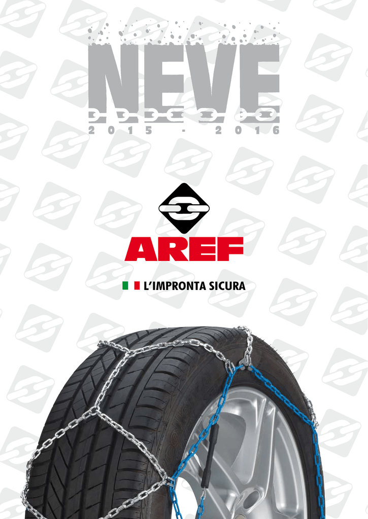 2 0 1 5 - 2 0 L’IMPRONTA SICURA 1 6 9 La catena da neve a cavo flessibile Battistrada a rombo con dispositivo di tensione autobloccante Snow chain with flexible steel cable Diamond pattern chain with stop device for hooking chain Conforme agli standard CUNA NC 178-01 e UNI 11313 2 1 Far passare il cavo dietro la ruota Chiudere il cavo all’esterno Pass the yellow side of the cable behind the wheel Engage the cable-hook from the outside CATENE S N O W DA C H I N NEVE W I T H CATENA A ROMBO IN ACCIAIO LEGATO MONT FACIL E A DIAMOND PATTERN CHAIN IN ALLOY STEEL SY atene ad ingombro interno 9 mm particolarmente adatto C alle autovetture di nuova produzione Si montano rapidamente senza spostare la vettura Maglie compatte a sezione “D” per una migliore tenuta su neve e ghiaccio Catena completamente zincata con laterale azzurro Cavo flessibile ricoperto con tubo in plastica colorata Istruzioni di montaggio plastificate Maglie di riparazione e guanti in plastica 2 Snow chains with lower profile 9 mm. They are especially good for car of new generation Can be easily mounted and removed without moving the veicle Excellent road-holding on snow and ice thanks to the cross chains in “D” shape Chain entirely galvanized with blu side chain Flexible steel cable covered by colored plastic Water proof mounting istructions Repair links and plastic gloves Confezione 5 Packaging coppie pairs Ingombro interno Inside space 9 V 5117 CATENA DA NEVE A CAVO FLESSIBILE BATTISTRADA A ROMBO CON DISPOSITIVO DI TENSIONE AUTOBLOCCANTE SNOW CHAI WITH FLEXIBLE STEEL CABLE DIAMOND PATTERN CHAIN WITH STOP DEVICE FOR HOOKING CHAIN SCHNEEKETTEN STAND MONTAGE RINGKETTE MIT SCHNAPPVERSCHLUSS CHAINES NEIGE A CABLE FLEXIBLE TENSIONAMENT AVEC DISPOSITIF AUTOBLOCANT 11 22 33 Maglia a sez “D” in acciaio al manganese 44 Link in “D”-shape manganese steel F TR La catena da neve a cavo flessibile Battistrada con dispositivo di tensione autobloccante 3 4 Agganciare la catena Tendere la catena Hook the side chain Tighten the chain CAVO FLEXIBLE STEEL CABLE DIAMOND PATTERN CHAIN IN ALLOY STEEL N F I TT Conforme agli standard CUNA NC 178-01 e UNI 11313 CATENA A ROMBO IN ACCIAIO LEGATO G AGGIO ITATO FLESSIBILE Snow chain with flexible steel cable Ladder cross chain with stop device for hooking chain I Si montano rapidamente senza spostare la vettura Maglie compatte a sezione “D” per una migliore tenuta su neve e ghiaccio Catena completamente zincata con laterale azzurro Cavo flessibile ricoperto con tubo in plastica colorata Istruzioni di montaggio plastificate Maglie di riparazione e guanti in plastica C an be easily mounted and removed without moving the veicle E xcellent road-holding on snow and ice thanks to the cross chains in “D” shape Chain entirely galvanized with blu side chain Flexible steel cable covered by colored plastic Water proof mounting istructions Repair links and plastic gloves Confezione 1 Packaging coppia pair Maglia a sez “D” in acciaio al manganese Link in “D”-shape manganese steel 3 TR1 TR1 (catene autocarro) TR1 (TRUck CHAINS) Catena a rombo in acciaio legato con maglie a sezione “D”, interamente zincocromate T ensione con catena ausiliaria Imballate in sacchi di juta sintetica Diamond pattern chain in alloy steel with links in “D” shape wire, entirely galvanized Tension with auxiliary chain Packing in synthetic jute bag Maglia a sez “D” in acciaio al manganese 4 Link in “D”-shape manganese steel CINGOLI CINGOLI EMERGENCY CHAIN Catena d’emergenza con traversi in acciaio completamente zincocromati C onfezionati in sacchi di juta sintetica N ° 6 pezzi/sacco Emergency chain with cross chain in alloy steel entirely galvanized Packing in synthetic jute bag N° 6 piece/bag Catene da neve per autovetture Snowchains for cars GR 12” 145/80-12 155/70-12 20 155/80-12 165/70-12 175/70-12 30 40 50 60 70 80 90 9 13” 135/80-13 135/70-13 145/65-13 145/70-13 155/65-13 165/55-13 165/60-13 175/50-13 145/80-13 155/70-13 155/55-13 160/65-13 165/65-13 175/55-13 175/60-13 185/50-13 205/40-13 155/80-13 165/70-13 175/65-13 185/60-13 195/50-13 195/55-13 225/45-13 14” 110 16” 18” 19” L/COPPIA 97 135/80-14 155/65-14 165/60-14 175/50-14 185/45-14 195/40-14 135/70-15 165/50-15 145/80-14 155/70-14 165/65-14 175/55-14 185/50-14 205/45-14 215/40-14 145/70-15 165/50-15 165/55-15 185/45-15 155/80-14 165/70-14 175/65-14 185/60-14 195/55-14 225/40-14 255/35-14 155/70-15 165/60-15 175/55-15 195/45-15 175/50-16 195/40-16 165/75-14 165/80-14 175/70-14 185/65-14 195/60-14 205/55-14 215/60-14 225/45-14 175/75-14 175/80-14 185/70-14 195/65-14 205/60-14 215/55-14 225/50-14 155/75-15 165/65-15 175/60-15 175/65-15 185/55-15 195/50-15 205/45-15 175/55-16 185/50-16 195/45-16 205/40-16 215/35-16 165/75-15 175/70-15 185/65-15 195/60-15 225/40-15 195/50-16 185/55-16 205/45-16 175/55-17 205/40-17 205/70-13 205/80-13 225/60-13 185/80-14 195/70-14 205/65-14 225/55-14 175/75-15 185/70-15 195/65-15 205/60-15 225/45-15 235/35-15 175/70-16 195/55-16 195/60-16 205/50-16 215/45-16 225/45-16 205/45-17 215/40-17 235/60-13 255/55-13 195/80-14 195/75-14 205/70-14 215/65-14 185/75-15 195/70-15 205/65-15 215/60-15 225/55-15 225/50-15 235/45-15 175/75-16 175/80-16 185/70-16 185/75-16 195/65-16 205/55-16 205/60-16 215/50-16 245/40-16 205/50-17 215/45-17 235/40-17 225/45-17 205/40-18 215/35-18 215/40-18 235/60-14 195/75-15 205/70-15 215/65-15 225/60-15 235/55-15 235/50-15 185/80-16 205/60-16 215/55-16 225/50-16 235/45-16 215/50-17 225/45-17 215/40-18 205/75-14 215/70-14 245/60-14 255/60-14 195/80-15 205/75-15 215/70-15 225/65-15 235/60-15 245/45-15 195/80-16 195/75-16 205/70-16 205/65-16 215/60-16 225/55-16 235/55-16 235/50-16 245/45-16 205/55-17 225/50-17 215/55-17 245/40-17 215/50-17 235/45-17 205/45-18 225/45-18 235/40-18 225/40-18 245/35-18 225/35-18 215/45-18 235/35-19 215/75-14 205/80-15 225/70-15 245/50-15 255/45-15 195/75-16 205/75-16 215/70-16 215/65-16 220/60-16 225/60-16 255/45-16 215/55-17 225/55-17 235/50-17