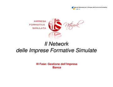 Guida IFSNetwork Il Network delle Imprese Formative Simulate III Fase: Gestione dell’Impresa Banca III Fase: Gestione dell’Impresa. La Banca. In questa area la IFS gestisce le funzioni relative alla Banca. Ha la possibilità di: • aprire un conto corrente • richiedere un fido • disporre della Banca on line • effettuare le operazioni di sportello Cliccare su Apertura di un Conto Corrente III Fase: Gestione dell’Impresa. Banca: apertura di un conto corrente La IFS sceglie dall’elenco visualizzato la Banca nella quale aprire il conto. L’anagrafica delle banche viene gestita dal Simucenter. Cliccare qui per scegliere la Banca III Fase: Gestione dell’Impresa. Banca: apertura di un conto corrente La IFS visualizza le condizioni offerte dalla Banca scelta e ha la possibilità di stampare il modulo di richiesta dell’apertura del conto corrente e di inviarlo. 1.Cliccare modulo qui stampare il 2.Cliccare richiesta qui inviare la III Fase: Gestione dell’Impresa. Banca. Apertura di un conto corrente: modulo per la richiesta Dopo aver valutato le condizioni offerte dalla Banca e aver cliccato su Stampa il modulo di richiesta, la IFS può aprire e scaricare il modulo. III Fase: Gestione dell’Impresa. Banca. Apertura di un conto corrente: modulo per la richiesta Dopo aver compilato il modulo on-line, la IFS provvede ad inviarlo. Dopo aver inserito i dati richiesti, cliccare su Conferma l’invio della richiesta III Fase: Gestione dell’Impresa. Banca: richiesta fido Nell’area della Banca, la IFS può inoltrare una richiesta di fido. Cliccare su Richiesta fido E’ stato generato un Evento. Cliccare qui per visualizzarlo III Fase: Gestione dell’Impresa. Banca: richiesta fido Nella pagina visualizzata, la IFS può procedere a stampare e poi inviare il modulo di richiesta di fido alla Banca. 1.Cliccare su Stampa il modulo di richiesta fido 2.Cliccare su Invia il modulo di richiesta fido III Fase: Gestione dell’Impresa. Banca. Richiesta fido. Stampa modulo Cliccare su Richiesta di fido per aprire/scaricare il modulo III Fase: Gestione dell’Impresa. Banca. Richiesta fido: invio modulo Dopo aver inserito i dati e allegato modulo e analisi, cliccare su Conferma l’invio della richiesta III Fase: Gestione dell’Impresa. Banca:banca on line La funzione Banca on line, permette alla IFS di: • gestire i bonifici • gestire i moduli F24 • presentare RIBA Cliccare su Banca on line III Fase: Gestione dell’Impresa. Banca: banca on line La IFS, a questo punto, può scegliere l’operazione da eseguire. All’interno di ogni operazione sono disponibili diverse funzioni di gestione. Cliccare qui per visualizzare i movimenti del conto corrente Per eseguire la scelta delle operazioni, cliccare sul link III Fase: Gestione dell’Impresa. Banca. Banca on line: gestione dei bonifici Cliccare sulle icone per visualizzare le altre operazioni Sei su Inserimento di un bonifico Dopo aver inserito i dati, cliccare su Salva III Fase: Gestione dell’Impresa. Banca. Banca on line: gestione F24, presentazione RIBA Cliccare su Gestione F24 III Fase: Gestione dell’Impresa. Banca. Banca on line: gestione F24, presentazione RIBA La IFS compila il modello F24 e provvede ad inviarlo. Cliccare su Invia il Modulo III Fase: Gestione dell’Impresa. Banca. Banca on line: gestione F24, presentazione RIBA Dopo aver inserito i dati, cliccare su Preparazione distinta III Fase: Gestione dell’Impresa. Banca: operazioni di sportello Nella funzione Operazioni di sportello, la IFS può: • versare contanti • versare ed emettere assegni • pagare RIBA III Fase: Gestione dell’Impresa. Banca: operazioni di sportello La IFS sceglie l’operazione da effettuare e ha la possibilità di visualizzare i movimenti bancari. Cliccare qui per visualizzare i movimenti Cliccare su Versamento Contanti III Fase: Gestione dell’Impresa. Banca. Operazioni di sportello: versamento contanti Dopo aver inserito l’importo del versamento, cliccare su Salva III Fase: Gestione dell’Impresa. Banca. Operazioni di sportello: versamento assegni Dopo aver inserito i dati cliccare su Salva III Fase: Gestione dell’Impresa. Banca. Operazioni di sportello: emissione assegni Dopo aver inserito i dati cliccare su Salva