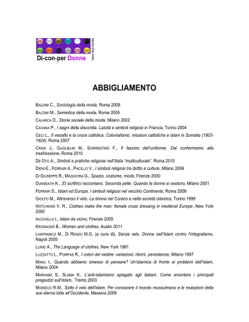 ABBIGLIAMENTO BALDINI C., Sociologia della moda, Roma 2008 BALDINI M., Semiotica della moda, Roma 2005 CALANCA D., Storia sociale della moda, Milano 2002 CAVANA P., I segni della discordia. Laicità e simboli religiosi in Francia, Torino 2004 CECI L., Il vessillo e la croce cattolica. Colonialismo, missioni cattoliche e islam in Somalia (19031924), Roma 2007 CRAIK J., GUGLIELMI M., SORRENTINO F., Il fascino dell’uniforme. Dal conformismo alla trasfressione, Roma 2010 DE OTO A., Simboli e pratiche religiose nell’Italia “multiculturale”, Roma 2010 DIENI E., FERRARI A., PACILLO V., I simboli religiosi tra diritto e culture, Milano 2006 DI GIUSEPPE R., MAGGIORA G., Spazio, costume, moda, Firenze 2000 DUNSEATH K., 33 scrittrici raccontano. Seconda pelle. Quando le donne si vestono, Milano 2001 FERRARI S., Islam ed Europa. I simboli religiosi nel vecchio Continente, Roma 2006 GIOLFO M., Attraverso il velo. La donna nel Corano e nella società islamica, Torino 1999 HOTCHKISS V. R., Clothes make the man: female cross dressing in medieval Europe, New York 2000 IACOVELLA I., Islam da vicino, Firenze 2005 KRONAUER B., Women and clothes, Austin 2011 LANFRANCO M., DI RENZO M.G. (a cura di), Senza velo. Donne nell’Islam contro l’integralismo, Napoli 2005 LURIE A., The Language of clothes, New York 1981 LUZZATTO L., POMPAS R., I colori del vestire: variazioni, ritorni, persistenze, Milano 1997 MANIJ I., Quando abbiamo smesso di pensare? Un’islamica di fronte ai problemi dell’Islam, Milano 2004 MARHABA S., SLAMA K., L’anti-islamismo spiegato agli italiani. Come smontare i principali pregiudizi sull’Islam, Trento 2003 MIGNECO R.M., Sotto il velo dell’Islam. Per conoscere il mondo mussulmano e le mutazioni della sua eterna lotta all’Occidente, Messina 2009 PALUMBO V., Svestite da uomo. Donne in abiti maschili dalla Grecia antica all’Iran di oggi, Milano 2007 PARIS I., Oggetti cuciti. L’abbigliamento pronto in Italia dal primo dopoguerra agli anni Settanta, Milano 2006 PERA M., BENEDETTO XVI (RATZINGER J.), Senza radici. Europa, relativismo, cristianesimo, Islam, Milano 2004 PERKINS GILMAN C., The dress of women. A Critical Introduction to the Symbolism and Sociology of Clothing, Westport 1915 PIERGIOVANNI B., Enciclopedia dell’abbigliamento femminile, Milano 1924 ROCCA G., La sostanza dell’effimero. Gli abiti degli ordini religiosi in Occidente, Roma 2000 SALIN R., Musulmane rivelate. Donne, Islam, modernità, Roma 2008 SGRENA G., Il prezzo del velo. La guerra dell’Islam contro le donne, Milano 2008