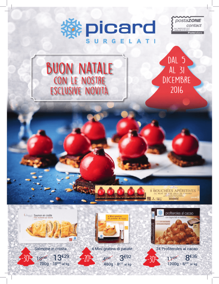 dal 5 al 31 dicembre 2016 buon natale con le nostre esclusive novitÀ Salmone in crosta -30% 18€99 13€29 700g - 18€99 al kg 4 Mini gratins di patate -20% 4€90 3€92 480g - 8€17 al kg 24 Profiteroles al cacao -30 % 11€95 8€36 1200g - 6€97 al kg scopri il gusto del natale con le esclusive specialitÀ picard 8 Palline di Natale al foie gras 9€99 100g 12 Pupazzi aperitivi prosciutto - emmental 4€99 115g 24 Piccoli aperitivi da forno 5€79 20 Aperitivi da forno 350g 12 Mini cappesante assortite 9€99 180g 8€99 190g 2 Terrine ripiene di cappesante e gamberi della Louisiana 9€99 220g 6 Palline di Natale da contorno 4€99 200g 2 Soufflé agli asparagi 4 Mini baguette con mirtillo rosso, albicocca, nocciola 3 €69 8 Macarons al cioccolato 180g 8 Mini funghetti con crema di castagne 7€99 4€29 170g 90g 2 Alci al cioccolato e gelato alla vaniglia 3€99 125g 4€99 85g Tris di carpacci aperitivi antipasti affumicati: Tonno pinne gialle Salmone della Norvegia Pesce spada -20% 20 Nuove tartine assortite 8€99 -20% 7€19 140g - 51€36 al kg 150g - 41 Tentacoli di totano cotti e tagliati 5€56 7€95 800g - 6€95 al kg -30% Panettone gastronomico Panettone gastronomico di pain polaire 9 €99 7 €99 -20% 380g - 21€03 al kg Gran misto per cocktail di mare -20% 4€99 300g - 13 12 Coroncine ai 3 ripieni 5€99 4€79 150g - 31€93 al kg -20 % 3€99 €30 al kg 8 Campanelline di salmone con formaggio -20% 9€99 7€69 7€99 108g - 73€98 al kg 6€15 €00 al kg 12 Lumache alla Bourguignonne medie -20% 3€99 4€99 70g - 57€00 al kg 4 Ventagli di cappesante alla Bretone -20% 7€19 8€99 440g - 16€34 al kg pizze e focacce Erbazzone reggiano 4€95 3€96 500g - 7€92 al kg -20% -20% 2 Quiches lorraines 3€99 3€19 360g - 8€86 al kg Pizza margherita express Pizza margherita Antica tradizione Croque-madame 3 Focacce alla toscana Microonde -20 % 2€70 2€16 660g - 3€27 al kg -20% 3€49 2€79 210g - 13€29 al kg -20 % 3€95 3€16 420g - 7€52 al kg -20% 1€99 185g - 8 1€59 €59 al kg Risotto di mare primi piatti Pennette al salmone affumicato 2 €63 3€29 500g - 5€26 al kg -20% offerta speciale di prova! Le lasagne della domenica 8 porzioni 12€99 Maxi 2coknfg. 10€00 5€00 al kg 1€25 a porzione cucina internazionale -23 % 10 Yakitori spiedini di pollo marinati 5€99 7€49 250g - 23€96 al kg -20% Paella valenciana con pollo €20 6€50 5 900g - 5€78 al kg -20% Gyoza ravioli giapponesi con gamberi -30% 7€98 5€58 400g - 13€95 al kg 6 Pasteis de nata dessert portoghese -20 % 4€89 3€91 360g - 10€86 al kg -20 % 2€50 2€00 300g - 6€67 al kg Arrotolato di faraona farcito con fichi e miele Arrosto di maiale con patatine a spicchi secondi piatti -20 % 4€95 3€96 300g - 13€20 al kg -20% 7€19 8€99 500g - 14 €38 al kg LA RICETTA spezzatino di cinghiale In dispensa Da Picard • 1 confezione di bocconcini di cinghiale •Aromi •Spezie • Vino rosso •Carote •Sedano •Cipolla PREPARAZIONE: Dopo averli fatti scongelare, fai marinare i bocconcini con aromi, spezie e una spruzzata di vino rosso per 2 ore. Prepara un soffritto con carota, sedano, e cipolla. Unisci i bocconcini, aggiungi un litro di brodo vegetale e cuocili a fuoco lento per circa 2 ore. Servili ben caldi e abbinati a polenta o purè di patate. Polpettine svedesi -20 % 3€49 2€79 350g - 7€97 al kg Zuppa di pesce pronta -30 % 5€99 550g - 7 4€19 €62 al kg Impepata di cozze -20 % 5€99 Bocconcini di cinghiale 6€39 7€99 350g - 18€26 al kg -20% Polpo e patate 4€79 500g - 9€58 al kg -30 % 5€99 4€19 500g - 8€38 al kg 11 €72 Trance di pesce 16€75 al kg spada conf. a peso variabile pesce LA RICETTA filetti di tonno in crosta di sesamo nero In dispensa Da Picard • 1 confezione di filetti di tonno pinne gialle • Semi di sesamo nero • olio extra vergine di oliva PREPARAZIONE: Scongela i 2 filetti di Tonno a pinne gialle, disponili su un piatto e passali nei semi di sesamo nero fino e coprili interamente. Cuocili in padella a fiamma viva 7 minuti per lato con 2 cucchiai d’olio extra vergine di oliva, in modo da creare esternamente una sottile crosta croccante e lasciarlo rosato intorno. Servi i due filetti di tonno accompagnati da un’insalata mista con noci e condita con una glassa di aceto balsamico. 4 €79 2 Filetti di tonno 5€99 €97 300g - 15 al kg pinne gialle 2 Porzioni di filetto di salmone senza pelle -20% 5€39 -30% Filetto di merluzzo nordico -20% -20% Sogliole intere pulite -20% 4€31 250g - 17€24 al kg 11€99 9€59 400g - 23€98 al kg Orata intera pulita -20% 13€90 11€12 al kg conf. a peso variabile Filetto di San Pietro 18€25 14€60 al kg conf. a peso variabile -20% 12€69 10€15 al kg conf. a peso variabile Cozze intere precotte pesce 4€95 3€96 1000g - 3€96 al kg Polpo Marocco pulito 14€95 -30% -20% 10€46 al kg conf. a peso variabile Mix frutti di mare (cappesante, vongole e cozze 4 Cappesante con mezzo guscio 12€99 -20% 10€39 320g - 32€47 al kg 4€99 3€99 500g - 798 al kg -20% Code di gamberi Argentini sgusciati 5€99 -30% 4€19 200g - 20€95 al kg -20% Scampi interi 13/16 17€99 14€39 750g - 19€19 al kg Mazzancolle tropicali sgusciate 4€99 3€99 240g - 16€63 al kg -20% Gamberetti boreali già cotti e sgusciati 5€59 4€47 200g - 22€35 al kg -20% Carciofi a spicchi verdure 3€49 450g - 6€20 al kg -30% Punte di asparagi verdi 2€79 5€99 4€19 450g - 9€31 al kg -20% Piselli finissimi 1€19 1€49 -20% 450g - 2€64 al kg Spinaci a cubettini 1€45 1€16 450g - 2€58 al kg Vellutata di carciofi -20% 4€50 600g - 6 3€60 €00 al kg -20% 10 Verdure per minestrone 1€79 1000g - 1 1€25 €25 al kg -30 % Caponatina di melanzane con uvetta e pinoli 3€90 3€12 -20% 400g - 7€80 al kg Melanzane grigliate 1€99 450g - 3 1€59 €53 al kg -20% Patate duchessa 2 Souffles di piselli e feta 3 3 €03 €79 170g - 17 €82 al kg 2€99 2