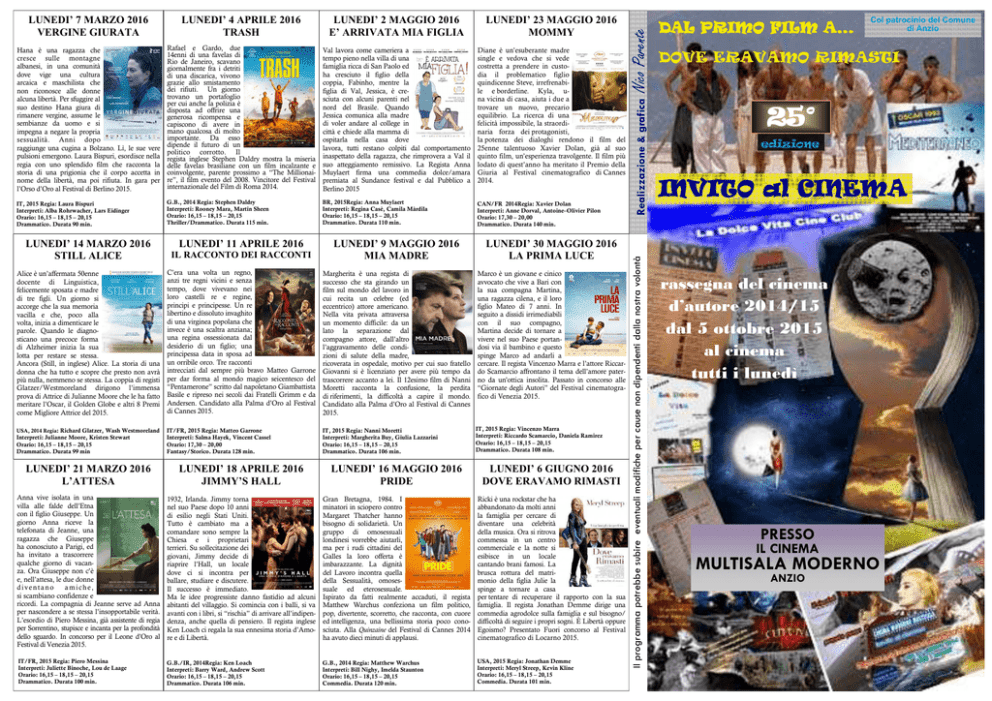 LUNEDI’ 23 MAGGIO 2016 MOMMY Hana è una ragazza che cresce sulle montagne albanesi, in una comunità dove vige una cultura arcaica e maschilista che non riconosce alle donne alcuna libertà. Per sfuggire al suo destino Hana giura di rimanere vergine, assume le sembianze da uomo e si impegna a negare la propria sessualità. Anni dopo raggiunge una cugina a Bolzano. Lì, le sue vere pulsioni emergono. Laura Bispuri, esordisce nella regia con uno splendido film che racconta la storia di una prigionia che il corpo accetta in nome della libertà, ma poi rifiuta. In gara per l’Orso d’Oro al Festival di Berlino 2015. Rafael e Gardo, due 14enni di una favelas di Rio de Janeiro, scavano giornalmente fra i detriti di una discarica, vivono grazie allo smistamento dei rifiuti. Un giorno trovano un portafoglio per cui anche la polizia è disposta ad offrire una generosa ricompensa e capiscono di avere in mano qualcosa di molto importante. Da esso dipende il futuro di un politico corrotto. Il regista inglese Stephen Daldry mostra la miseria delle favelas brasiliane con un film incalzante e coinvolgente, parente prossimo a “The Millionaire”, il film evento del 2008. Vincitore del Festival internazionale del Film di Roma 2014. Val lavora come cameriera a tempo pieno nella villa di una famiglia ricca di San Paolo ed ha cresciuto il figlio della coppia, Fabinho, mentre la figlia di Val, Jessica, è cresciuta con alcuni parenti nel nord del Brasile. Quando Jessica comunica alla madre di voler andare al college in città e chiede alla mamma di ospitarla nella casa dove lavora, tutti restano colpiti dal comportamento inaspettato della ragazza, che rimprovera a Val il suo atteggiamento remissivo. La Regista Anna Muylaert firma una commedia dolce/amara premiata al Sundance festival e dal Pubblico a Berlino 2015 Diane è un’esuberante madre single e vedova che si vede costretta a prendere in custodia il problematico figlio quindicenne Steve, irrefrenabile e borderline. Kyla, una vicina di casa, aiuta i due a trovare un nuovo, precario equilibrio. La ricerca di una felicità impossibile, la straordinaria forza dei protagonisti, la potenza dei dialoghi rendono il film del 25enne talentuoso Xavier Dolan, già al suo quinto film, un’esperienza travolgente. Il film più lodato di quest’anno ha meritato il Premio della Giuria al Festival cinematografico di Cannes 2014. IT, 2015 Regia: Laura Bispuri Interpreti: Alba Rohrwacher, Lars Eidinger Orario: 16,15 – 18,15 – 20,15 Drammatico. Durata 90 min. G.B., 2014 Regia: Stephen Daldry Interpreti: Rooney Mara, Martin Sheen Orario: 16,15 – 18,15 – 20,15 Thriller/Drammatico. Durata 115 min. BR, 2015Regia: Anna Muylaert Interpreti: Regina Casè, Camila Màrdila Orario: 16,15 – 18,15 – 20,15 Drammatico. Durata 110 min. CAN/FR 2014Regia: Xavier Dolan Interpreti: Anne Dorval, Antoine–Olivier Pilon Orario: 17,30 – 20,00 Drammatico. Durata 140 min. LUNEDI’ 14 MARZO 2016 STILL ALICE IL RACCONTO DEI RACCONTI LUNEDI’ 11 APRILE 2016 LUNEDI’ 9 MAGGIO 2016 MIA MADRE LUNEDI’ 30 MAGGIO 2016 LA PRIMA LUCE Alice è un’affermata 50enne docente di Linguistica, felicemente sposata e madre di tre figli. Un giorno si accorge che la sua memoria vacilla e che, poco alla volta, inizia a dimenticare le parole. Quando le diagnosticano una precoce forma di Alzheimer inizia la sua lotta per restare se stessa. Ancora (Still, in inglese) Alice. La storia di una donna che ha tutto e scopre che presto non avrà più nulla, nemmeno se stessa. La coppia di registi Glatzer/Westmoreland dirigono l’immensa prova di Attrice di Julianne Moore che le ha fatto meritare l’Oscar, il Golden Globe e altri 8 Premi come Migliore Attrice del 2015. C’era una volta un regno, anzi tre regni vicini e senza tempo, dove vivevano nei loro castelli re e regine, principi e principesse. Un re libertino e dissoluto invaghito di una virginea popolana che invece è una scaltra anziana; una regina ossessionata dal desiderio di un figlio; una principessa data in sposa ad un orribile orco. Tre racconti intrecciati dal sempre più bravo Matteo Garrone per dar forma al mondo magico seicentesco del “Pentamerone” scritto dal napoletano Giambattista Basile e ripreso nei secoli dai Fratelli Grimm e da Andersen. Candidato alla Palma d’Oro al Festival di Cannes 2015. Margherita è una regista di successo che sta girando un film sul mondo del lavoro in cui recita un celebre (ed eccentrico) attore americano. Nella vita privata attraversa un momento difficile: da un lato la separazione dal compagno attore, dall’altro l’aggravamento delle condizioni di salute della madre, ricoverata in ospedale, motivo per cui suo fratello Giovanni si è licenziato per avere più tempo da trascorrere accanto a lei. Il 12esimo film di Nanni Moretti racconta la confusione, la perdita di riferimenti, la difficoltà a capire il mondo. Candidato alla Palma d’Oro al Festival di Cannes 2015. Marco è un giovane e cinico avvocato che vive a Bari con la sua compagna Martina, una ragazza cilena, e il loro figlio Mateo di 7 anni. In seguito a dissidi irrimediabili con il suo compagno, Martina decide di tornare a vivere nel suo Paese portandosi via il bambino e questo spinge Marco ad andarli a cercare. Il regista Vincenzo Marra e l’attore Riccardo Scamarcio affrontano il tema dell’amore paterno da un’ottica insolita. Passato in concorso alle “Giornate degli Autori” del Festival cinematografico di Venezia 2015. USA, 2014 Regia: Richard Glatzer, Wash Westmoreland Interpreti: Julianne Moore, Kristen Stewart Orario: 16,15 – 18,15 – 20,15 Drammatico. Durata 99 min IT/FR, 2015 Regia: Matteo Garrone Interpreti: Salma Hayek, Vincent Cassel Orario: 17,30 – 20,00 Fantasy/Storico. Durata 128 min. IT, 2015 Regia: Nanni Moretti Interpreti: Margherita Buy, Giulia Lazzarini Orario: 16,15 – 18,15 – 20,15 Drammatico. Durata 106 min. IT, 2015 Regia: Vincenzo Marra Interpreti: Riccardo Scamarcio, Daniela Ramirez Orari