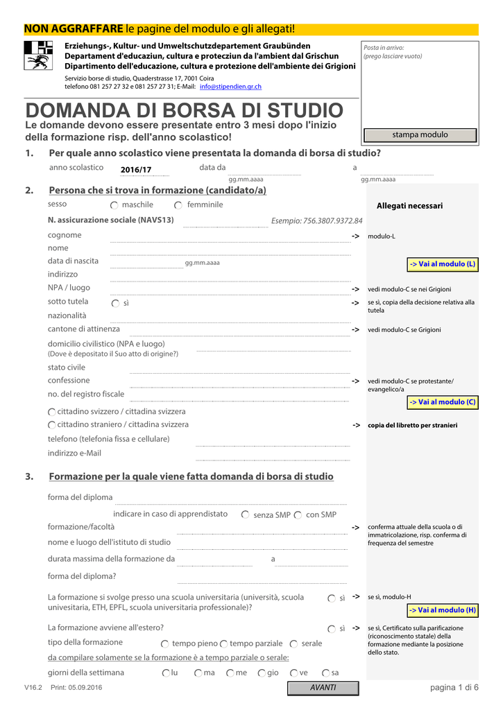 NON AGGRAFFARE le pagine del modulo e gli allegati! Erziehungs-, Kultur- und Umweltschutzdepartement Graubünden Departament d'educaziun, cultura e protecziun da l'ambient dal Grischun Dipartimento dell'educazione, cultura e protezione dell'ambiente dei Grigioni Posta in arrivo: (prego lasciare vuoto) Servizio borse di studio, Quaderstrasse 17, 7001 Coira telefono 081 257 27 32 e 081 257 27 31; E-Mail: [email protected] DOMANDA DI BORSA DI STUDIO Le domande devono essere presentate entro 3 mesi dopo l'inizio della formazione risp. dell'anno scolastico! 1. stampa modulo Per quale anno scolastico viene presentata la domanda di borsa di studio? anno scolastico data da 2016/17 a gg.mm.aaaa 2. gg.mm.aaaa Persona che si trova in formazione (candidato/a) sesso maschile femminile Allegati necessari N. assicurazione sociale (NAVS13) Esempio: 756.3807.9372.84 cognome -> modulo-L nome data di nascita gg.mm.aaaa -> Vai al modulo (L) indirizzo NPA / luogo sotto tutela sì -> vedi modulo-C se nei Grigioni -> se sì, copia della decisione relativa alla tutela -> vedi modulo-C se Grigioni -> vedi modulo-C se protestante/ evangelico/a nazionalità cantone di attinenza domicilio civilistico (NPA e luogo) (Dove è depositato il Suo atto di origine?) stato civile confessione no. del registro fiscale -> Vai al modulo (C) cittadino svizzero / cittadina svizzera cittadino straniero / cittadina svizzera -> copia del libretto per stranieri -> conferma attuale della scuola o di immatricolazione, risp. conferma di frequenza del semestre telefono (telefonia fissa e cellulare) indirizzo e-Mail 3. Formazione per la quale viene fatta domanda di borsa di studio forma del diploma indicare in caso di apprendistato con SMP senza SMP formazione/facoltà nome e luogo dell'istituto di studio durata massima della formazione da a forma del diploma? La formazione si svolge presso una scuola universitaria (università, scuola univesitaria, ETH, EPFL, scuola universitaria professionale)? sì -> La formazione avviene all'estero? sì -> tipo della formazione tempo pieno tempo parziale -> Vai al modulo (H) serale da compilare solamente se la formazione è a tempo parziale o serale: giorni della settimana V16.2 Print: 05.09.2016 lu ma me gio ve se sì, modulo-H se sì, Certificato sulla parificazione (riconoscimento statale) della formazione mediante la posizione dello stato. sa AVANTI pagina 1 di 6 4. Genitori della persona che si trova in formazione i genitori sono Allegati necessari sposati assieme divorziati separati mai stati sposati assieme vedovi (un genitore è defunto) i genitori sono defunti i genitori sono sconosciuti attuale risp. ultimo titolare dell'autorità parentale padre e madre padre madre sotto tutela alimenti -> -> accordo di separazione -> copia del decreto sulla tutela la persona che si trova in form. non riceve alimenti il padre paga gli alimenti la madre paga gli alimenti il padre e la madre pagano gli alimenti gli alimenti vengono anticipati dal comune Padre residente nel Canton GR cognome nome stato civile del padre celibe indirizzo sposato vedovo nazione divorziato -> copia della sentenza di divorzio NPA / luogo lingua -> copia dell'accordo di separazione data di nascita separato risposato defunto -> copie delle decisioni di rendita Nuovo no. AVS sconosciuto -> conferma del comune solamente se il padre è sconosciuto o se la sua residenza è sconosciuta -> copie delle decisioni di rendita (genitori e figli) no. der registro fiscale ' privato ' lavoro Il padre riceve una rendita AVS AI cassa pensioni assicurazioni altri -> prestazioni complementari (PC) Il padre è cittadino straniero E vive in Svizzera E NON è in possesso -> del permesso di soggiorno C (dimicilio) residente nel Canton GR Madre nubile inidirzzo vedova nazione divorziata NPA / luogo lingua separata data di nascita defunta Nuovo no. AVS sconosciuta copia del conteggio dell'imposta alla fonte (Ammin. cant. delle imposte) E copie dei giustificativi relativi alla sostanza e proprietà immobiliare sposata risposata ' privato -> copia della sentenza di divorzio -> copia dell'accordo di separazione -> copie delle decisioni di rendita -> conferma del comune solamente se il padre è sconosciuto o se la sua residenza è sconosciuta -> copie delle decisioni di rendita (genitori e figli) ' lavoro La madre riceve una rendita AVS copia decisione PC stato civile della madre cognome nome no. del registro fiscale AI cassa pensioni assicurazioni altri prestazioni complementari (PC) -> La madre è cittadina straniera E vive in Svizzera E NON è in possesso -> del permesso di soggiorno C (dimicilio) V16.2 sentenza di divorzio Print: 05.09.2016 INDIETRO AVANTI copia decisone PC copia del conteggio dell'imposta alla fonte (Ammin. cant. delle imposte) E copie dei giustificativi relativi alla sostanza e proprietà immobiliare pagina 2 di 6 5. Fratelli o sorelle della persona che si trova in formazione Ha dei fratelli o delle sorelle che non hanno ancora concluso l'obbligo scolastico (scuola popolare) o si trovano in una formazione postobbligatoria? 6. no Allegati necessari sì -> se sì, modulo-G -> Vai al modulo(G) Coniuge della persona che si trova in formazione È sposato/sposata (persona che si trova in formazione)? no sì -> se sì, modulo-V -> Vai al modulo (V) 7. Figli della persona che si trova in formazione Ha dei figli (persona che si trova in formazione)? no sì -> se sì, modulo-K -> Vai al modulo (K) 8. Indirizzo per i pagamenti cognome nome NPA / luogo genere di pagamento posta banca nome della banca numero clearing numero del conto numero IBAN -> Senza numero IBAN non possono essere effetuati pagamenti! Se il numero IBAN non è noto, si informi presso la Sua banca. -> se sì, allegare dichiarazione di cessione firmata Esempio: CH17 0077 4110 0000 0000 0 Pagamenti all'estero e pagamenti in contanti non sono possibili! Un'eventuale borsa di studio va versata a un comune o a un servizio sociale, ecc.? 9. no sì Domande sull'anno di formazione corrente 