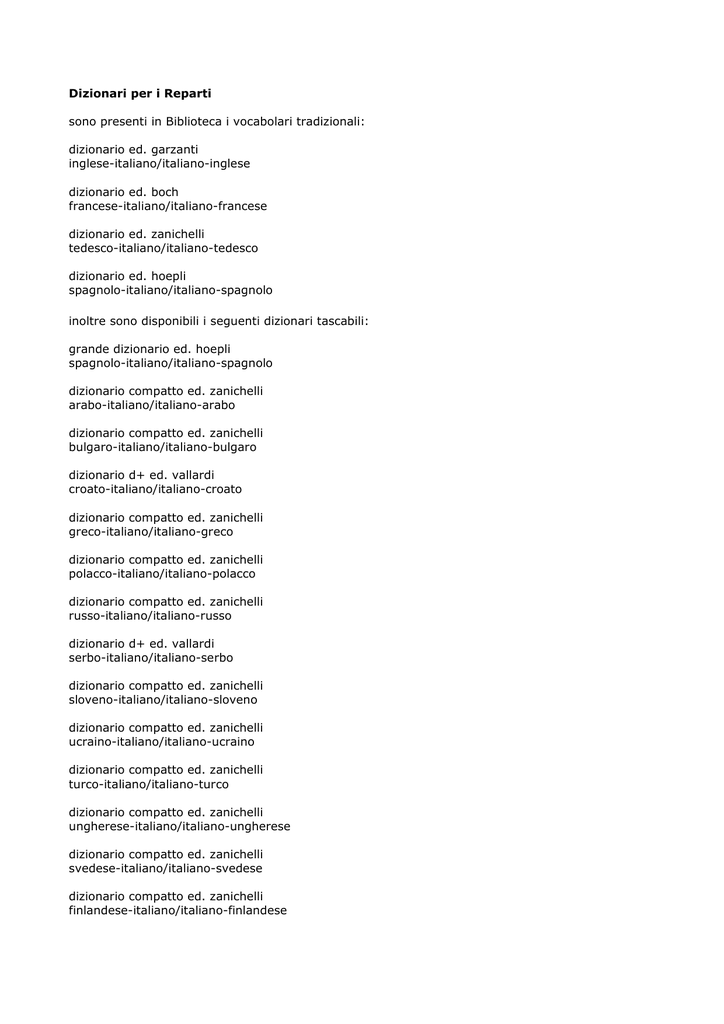Dizionari per i Reparti sono presenti in Biblioteca i vocabolari