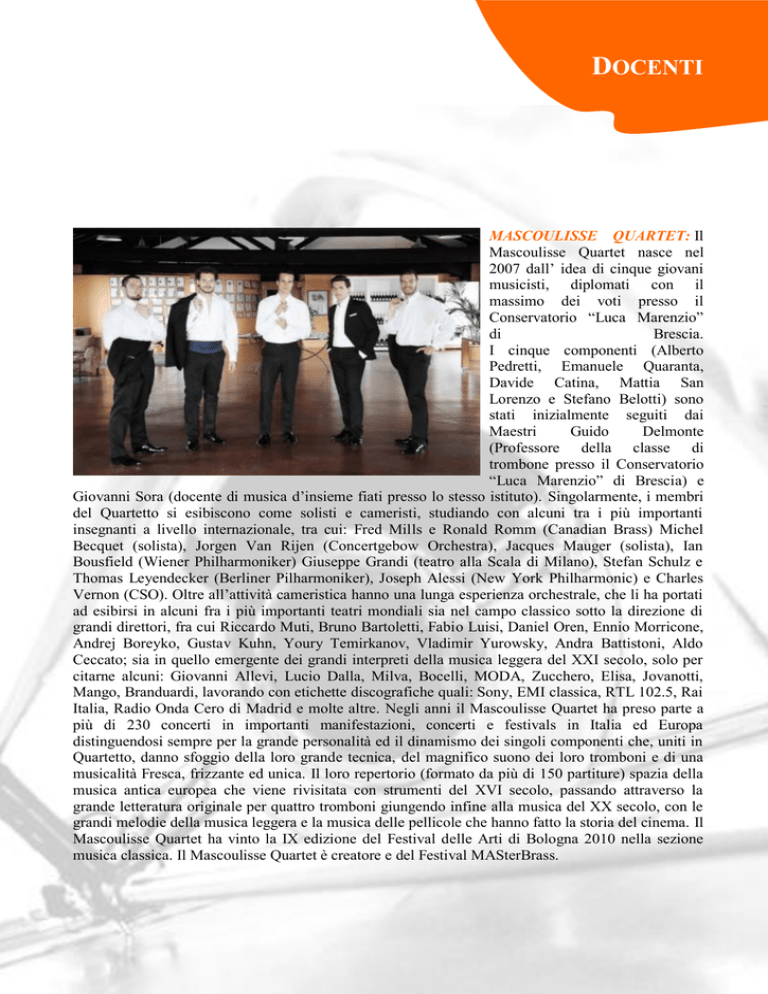 DOCENTI MASCOULISSE QUARTET: Il Mascoulisse Quartet nasce nel 2007 dall‟ idea di cinque giovani musicisti, diplomati con il massimo dei voti presso il Conservatorio “Luca Marenzio” di Brescia. I cinque componenti (Alberto Pedretti, Emanuele Quaranta, Davide Catina, Mattia San Lorenzo e Stefano Belotti) sono stati inizialmente seguiti dai Maestri Guido Delmonte (Professore della classe di trombone presso il Conservatorio “Luca Marenzio” di Brescia) e Giovanni Sora (docente di musica d‟insieme fiati presso lo stesso istituto). Singolarmente, i membri del Quartetto si esibiscono come solisti e cameristi, studiando con alcuni tra i più importanti insegnanti a livello internazionale, tra cui: Fred Mills e Ronald Romm (Canadian Brass) Michel Becquet (solista), Jorgen Van Rijen (Concertgebow Orchestra), Jacques Mauger (solista), Ian Bousfield (Wiener Philharmoniker) Giuseppe Grandi (teatro alla Scala di Milano), Stefan Schulz e Thomas Leyendecker (Berliner Pilharmoniker), Joseph Alessi (New York Philharmonic) e Charles Vernon (CSO). Oltre all‟attività cameristica hanno una lunga esperienza orchestrale, che li ha portati ad esibirsi in alcuni fra i più importanti teatri mondiali sia nel campo classico sotto la direzione di grandi direttori, fra cui Riccardo Muti, Bruno Bartoletti, Fabio Luisi, Daniel Oren, Ennio Morricone, Andrej Boreyko, Gustav Kuhn, Youry Temirkanov, Vladimir Yurowsky, Andra Battistoni, Aldo Ceccato; sia in quello emergente dei grandi interpreti della musica leggera del XXI secolo, solo per citarne alcuni: Giovanni Allevi, Lucio Dalla, Milva, Bocelli, MODA, Zucchero, Elisa, Jovanotti, Mango, Branduardi, lavorando con etichette discografiche quali: Sony, EMI classica, RTL 102.5, Rai Italia, Radio Onda Cero di Madrid e molte altre. Negli anni il Mascoulisse Quartet ha preso parte a più di 230 concerti in importanti manifestazioni, concerti e festivals in Italia ed Europa distinguendosi sempre per la grande personalità ed il dinamismo dei singoli componenti che, uniti in Quartetto, danno sfoggio della loro grande tecnica, del magnifico suono dei loro tromboni e di una musicalità Fresca, frizzante ed unica. Il loro repertorio (formato da più di 150 partiture) spazia della musica antica europea che viene rivisitata con strumenti del XVI secolo, passando attraverso la grande letteratura originale per quattro tromboni giungendo infine alla musica del XX secolo, con le grandi melodie della musica leggera e la musica delle pellicole che hanno fatto la storia del cinema. Il Mascoulisse Quartet ha vinto la IX edizione del Festival delle Arti di Bologna 2010 nella sezione musica classica. Il Mascoulisse Quartet è creatore e del Festival MASterBrass. VINCENT LEPAPE: Primo trombone dell‟Orchestra del Teatro Regio di Torino e docente di trombone del biennio superiore di II livello presso il Conservatorio di musica di Aosta. Solista, commissario di giurie di concorsi per solisti, orchestrale e camerista. Una straordinaria carriera articolata fra le più importanti orchestre europee, fra cui: Orchestre National de France, Orchestre de Paris, Operà de Lyon, Operà de Paris, Orchestra di Mosca, Orchestre National de Lyon Palau de les Arts (Valencia), Orchestra del San Carlo di Napoli e molte altre. È un membro fondatore dal 1998 del quintetto di ottoni Pentabrass, (www.pentabrass.it) con i quali ha inciso due CD. I Pentabrass sono stati invitati nei maggiori Festivals e Stagioni concertistiche italiane: Festival di Ottoni di Bagnolo Mela (BS), Festival di Ottoni di Mendicino (CS), Festival Internazionale dí organo di Cuneo, Stagione concertistica ìI Venerdi del Corelli, Stagione concertistica di Asti , Stagione concertistica di Monterubiano e Montegorgio (AP) Festival di Ottoni di Quart (Aosta), Regio Itinerante. I Pentabrass hanno al loro attivo una tournèe in Germania (Castelli Bavaresi) concerti in Francia ed in Svizzera. Sono stati invitati a rappresentare il Piemonte al Conservatorio Royal de Bruxelles in presenza della famiglia Reale Belga e dell‟Ambasciatore Italiano in Belgio. Sono stati invitati dall‟Università della Georgia (USA) per una serie di concerti ed hanno effettuato una tournèe in Georgia, si sono esibiti al Spanish Brass Festival ad Alzira (Spagna). A Jeju (Corea) sono stati invitati a far parte della giuria del Concorso Internazionale per Ottoni e ad una serie di concerti in Corea. Nel 2008 hanno effettuato una tournèe in Russia esibendosi al Conservatorio Tchaikovski ed al Museo Puskin. Nel 2008 hanno organizzato il ” Pentabrass Festival ” con la collaborazione di Fred Mills ( ex CanadianBrass), Phil Smith ( Tromba Solista N. Y.Philarmonic), Andrei Ikov (Tromba Solista Bolshoi) , Franck LLoyd ( Solista Internazionale e professore di Corno Hochschule Essen), Michel Becquet ( Solista Internazionale e professore diTrombone al Conservatorio Superiore di Lione e Losanna) James Gourlay ( Solista Internazionale di Tuba) e I‟ensemble “Epsilon”. I Pentabrass hanno al loro attivo più di 250 concerti. Per informazioni www.pentabrass.it. Il 23 Marzo 2002 Vincent Lepape ad eseguito in prima esecuzione Italiana la “Symphonia per trombone e orchestra” di Ernest Bloch con l‟Orchestra del Teatro Regio di Torino diretto dal Maestro Aleksandr Anissimov. MATTEO DE LUCA: nato a Magenta nel 1985. All‟età di nove anni inizia a prendere lezioni di solfeggio e successivamente di trombone presso la scuola di musica della banda del suo paese, ed entra qualche anno più tardi a studiare al Conservatorio “G. Verdi” di Milano, diplomandosi nel 2005.Studia nei due anni successivi con il Maestro Corrado Colliard presso il Conservatorio “G. Cantelli” di Novara.Consegue nel 2010 il master de soliste presso la Haute Ecole de Musique di Ginevra sotto la guida del Maestro Andrea Bandini. Dal 2007 al 2009 ricopre il ruolo di primo trombone presso la UBS Verbier Festival Orchestra (Conductor Laureate: James Levine), nel 2009 vince il concorso per pr