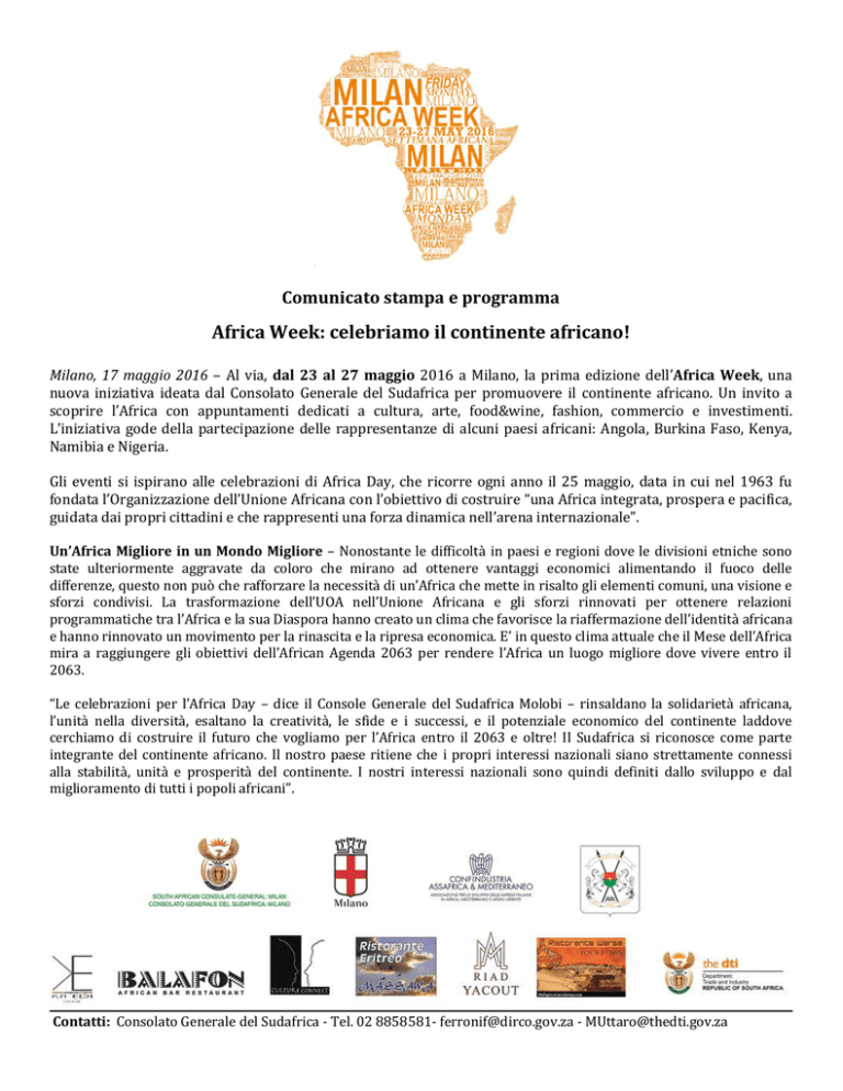 Comunicato stampa e programma Africa Week: celebriamo il continente africano! Milano, 17 maggio 2016 – Al via, dal 23 al 27 maggio 2016 a Milano, la prima edizione dell’Africa Week, una nuova iniziativa ideata dal Consolato Generale del Sudafrica per promuovere il continente africano. Un invito a scoprire l’Africa con appuntamenti dedicati a cultura, arte, food&wine, fashion, commercio e investimenti. L’iniziativa gode della partecipazione delle rappresentanze di alcuni paesi africani: Angola, Burkina Faso, Kenya, Namibia e Nigeria. Gli eventi si ispirano alle celebrazioni di Africa Day, che ricorre ogni anno il 25 maggio, data in cui nel 1963 fu fondata l’Organizzazione dell’Unione Africana con l’obiettivo di costruire “una Africa integrata, prospera e pacifica, guidata dai propri cittadini e che rappresenti una forza dinamica nell’arena internazionale”. Un’Africa Migliore in un Mondo Migliore – Nonostante le difficoltà in paesi e regioni dove le divisioni etniche sono state ulteriormente aggravate da coloro che mirano ad ottenere vantaggi economici alimentando il fuoco delle differenze, questo non può che rafforzare la necessità di un’Africa che mette in risalto gli elementi comuni, una visione e sforzi condivisi. La trasformazione dell’UOA nell’Unione Africana e gli sforzi rinnovati per ottenere relazioni programmatiche tra l’Africa e la sua Diaspora hanno creato un clima che favorisce la riaffermazione dell’identità africana e hanno rinnovato un movimento per la rinascita e la ripresa economica. E’ in questo clima attuale che il Mese dell’Africa mira a raggiungere gli obiettivi dell’African Agenda 2063 per rendere l’Africa un luogo migliore dove vivere entro il 2063. “Le celebrazioni per l’Africa Day – dice il Console Generale del Sudafrica Molobi – rinsaldano la solidarietà africana, l’unità nella diversità, esaltano la creatività, le sfide e i successi, e il potenziale economico del continente laddove cerchiamo di costruire il futuro che vogliamo per l’Africa entro il 2063 e oltre! Il Sudafrica si riconosce come parte integrante del continente africano. Il nostro paese ritiene che i propri interessi nazionali siano strettamente connessi alla stabilità, unità e prosperità del continente. I nostri interessi nazionali sono quindi definiti dallo sviluppo e dal miglioramento di tutti i popoli africani”. Contatti: Consolato Generale del Sudafrica - Tel. 02 8858581- [email protected] - [email protected] PROGRAMMA 23 maggio 2016 SEMINARIO L’integrazione regionale: un passaggio essenziale per generare opportunità di investimento in Africa Secondo il rapporto della Banca Mondiale “Doing Business 2016” l’Africa SubSahariana nel periodo 2014/15 ha realizzato da sola il 30% delle riforme per migliorare il business climate. Tra i primi dieci paesi in classifica, cinque si trovano nell’Africa Sub Sahariana. Le riforme hanno permesso maggiore accesso al credito, una più facile fornitura di elettricità e lo snellimento delle procedure burocratiche per la registrazione degli immobili e delle società. Ma per beneficiare appieno della crescita regionale e accedere a mercati più vasti bisogna anche costruire infrastrutture regionali più forti, specialmente per i quindici paesi africani che non hanno accesso al mare, creando corridoi di trasporto per permettere alla merce di raggiungere i mercati e le popolazioni. Non solo: l’Africa ha anche bisogno di gestire al meglio risorse idriche, produzione elettrica per l’agricoltura, l’industria, l’estrazione e le comunicazioni, potenziali catalizzatori della crescita del commercio inter-regionale e di accelerazione dell’integrazione del continente. In questo modo l’Africa potrà accrescere la sua attrattività per le imprese come destinazione di investimenti e commercio e, grazie ad una maggiore integrazione regionale, promuovere progetti interregionali e fornire l’accesso ai molti mercati che ne fanno parte. Quali progetti di investimento intra-regionali sono quindi più necessari per accelerare la crescita e i partenariati economici ed industriali? Cosa stanno facendo i paesi africani per promuovere ed attirare l’interesse delle imprese sia a livello nazionale che regionale? Questo argomento verrà affrontato durante il Seminario insieme al Direttore Generale di Confindustria Assafrica & Mediterraneo e i rappresentanti diplomatici di Angola, Burkina Faso, Kenya, Namibia, Nigeria e Sudafrica. L’iniziativa è rivolta alle aziende italiane interessate a investire e fare business con l’Africa, consulenti, esperti rappresentanti istituzionali. Fondazione Stelline, corso Magenta 61 – Milano. Per registrarsi: [email protected] In collaborazione con: Confindustria Assafrica & Mediterraneo 24 maggio 2016 – 3 giugno 2016 MOSTRA FOTOGRAFICA “Designing Africa 3.0” Selezione di immagini dalla mostra “Designing Africa 3.0” presentata a Milano da LagosPhoto in occasione della 26a edizione del Festival del Cinema Africano, d'Asia e America Latina, nell’ambito della XXI Triennale. Gli artisti ribaltano l'immaginario comune dell'Africa come scenario di guerre, fame e malattie e ci trasportano in una nuova dimensione, in cui l'Africa rappresenta una fonte di creazione artistica, innovazione e possibilità. La selezione, curata da Martina Olivetti, comprende i seguenti fotografi: Bruno Morais (Brasile); Owise Abuzaid (Egitto); Ima Mfon (Nigeria); Andile Buka (Sudafrica); Nobukho Nqaba (Sudafrica); Chris Saunders (Sudafrica). In collaborazione con: Comune di Milano, CoeWeb, Festival Cinema Africa, Asia e America Latina, African Artists Foundation, LagosPhoto, MarieClaire, PixarPrinting Biblioteca Dergano-Bovisa, via Baldinucci 76 – Milano – Ingresso libero – Info: 02 88465807 Inaugurazione 24 maggio 2016 ore 18:00 23-27 maggio 2016 ITINERARIO FOOD&WINE Alla scoperta della cucina africana con un menù speciale Africa Week La cucina africana è estremamente va