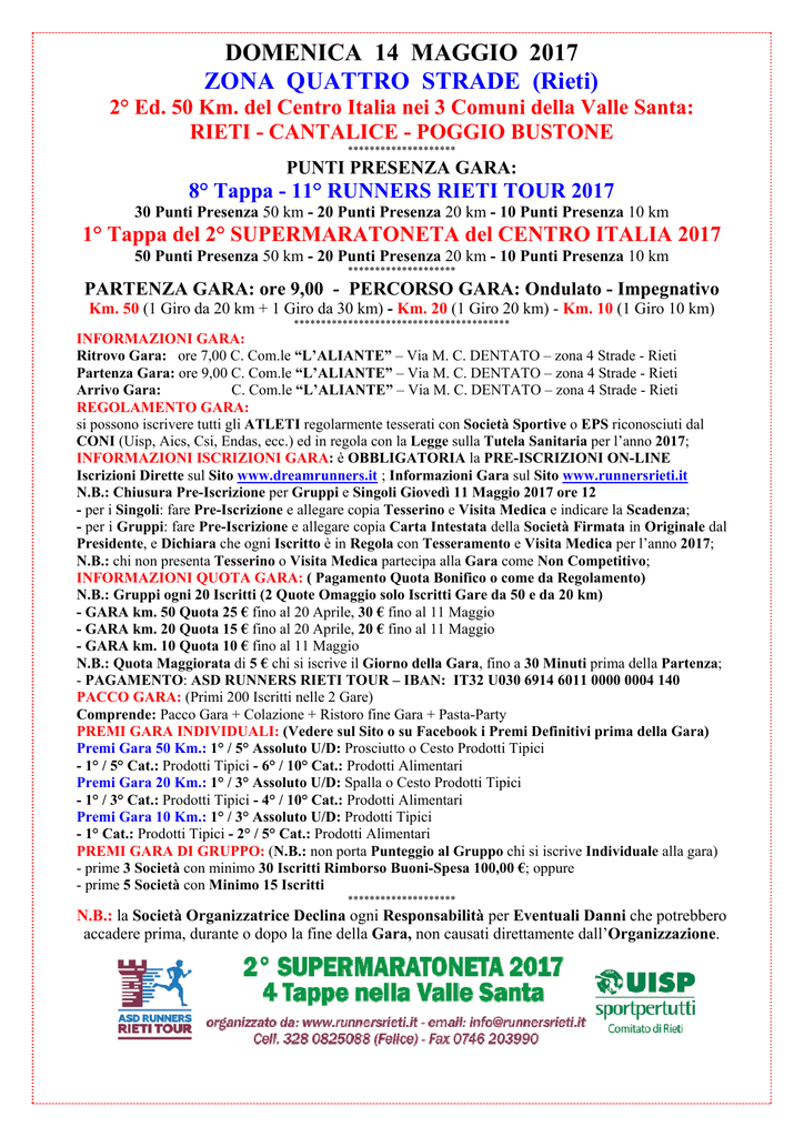 DOMENICA 14 MAGGIO 2017 ZONA QUATTRO STRADE (Rieti) 2° Ed. 50 Km. del Centro Italia nei 3 Comuni della Valle Santa: RIETI - CANTALICE - POGGIO BUSTONE ******************** PUNTI PRESENZA GARA: 8° Tappa - 11° RUNNERS RIETI TOUR 2017 30 Punti Presenza 50 km - 20 Punti Presenza 20 km - 10 Punti Presenza 10 km 1° Tappa del 2° SUPERMARATONETA del CENTRO ITALIA 2017 50 Punti Presenza 50 km - 20 Punti Presenza 20 km - 10 Punti Presenza 10 km ******************** PARTENZA GARA: ore 9,00 - PERCORSO GARA: Ondulato - Impegnativo Km. 50 (1 Giro da 20 km + 1 Giro da 30 km) - Km. 20 (1 Giro 20 km) - Km. 10 (1 Giro 10 km) **************************************** INFORMAZIONI GARA: Ritrovo Gara: ore 7,00 C. Com.le “L’ALIANTE” – Via M. C. DENTATO – zona 4 Strade - Rieti Partenza Gara: ore 9,00 C. Com.le “L’ALIANTE” – Via M. C. DENTATO – zona 4 Strade - Rieti Arrivo Gara: C. Com.le “L’ALIANTE” – Via M. C. DENTATO – zona 4 Strade - Rieti REGOLAMENTO GARA: si possono iscrivere tutti gli ATLETI regolarmente tesserati con Società Sportive o EPS riconosciuti dal CONI (Uisp, Aics, Csi, Endas, ecc.) ed in regola con la Legge sulla Tutela Sanitaria per l’anno 2017; INFORMAZIONI ISCRIZIONI GARA: è OBBLIGATORIA la PRE-ISCRIZIONI ON-LINE Iscrizioni Dirette sul Sito www.dreamrunners.it ; Informazioni Gara sul Sito www.runnersrieti.it N.B.: Chiusura Pre-Iscrizione per Gruppi e Singoli Giovedì 11 Maggio 2017 ore 12 - per i Singoli: fare Pre-Iscrizione e allegare copia Tesserino e Visita Medica e indicare la Scadenza; - per i Gruppi: fare Pre-Iscrizione e allegare copia Carta Intestata della Società Firmata in Originale dal Presidente, e Dichiara che ogni Iscritto è in Regola con Tesseramento e Visita Medica per l’anno 2017; N.B.: chi non presenta Tesserino o Visita Medica partecipa alla Gara come Non Competitivo; INFORMAZIONI QUOTA GARA: ( Pagamento Quota Bonifico o come da Regolamento) N.B.: Gruppi ogni 20 Iscritti (2 Quote Omaggio solo Iscritti Gare da 50 e da 20 km) - GARA km. 50 Quota 25 € fino al 20 Aprile, 30 € fino al 11 Maggio - GARA km. 20 Quota 15 € fino al 20 Aprile, 20 € fino al 11 Maggio - GARA km. 10 Quota 10 € fino al 11 Maggio N.B.: Quota Maggiorata di 5 € chi si iscrive il Giorno della Gara, fino a 30 Minuti prima della Partenza; - PAGAMENTO: ASD RUNNERS RIETI TOUR – IBAN: IT32 U030 6914 6011 0000 0004 140 PACCO GARA: (Primi 200 Iscritti nelle 2 Gare) Comprende: Pacco Gara + Colazione + Ristoro fine Gara + Pasta-Party PREMI GARA INDIVIDUALI: (Vedere sul Sito o su Facebook i Premi Definitivi prima della Gara) Premi Gara 50 Km.: 1° / 5° Assoluto U/D: Prosciutto o Cesto Prodotti Tipici - 1° / 5° Cat.: Prodotti Tipici - 6° / 10° Cat.: Prodotti Alimentari Premi Gara 20 Km.: 1° / 3° Assoluto U/D: Spalla o Cesto Prodotti Tipici - 1° / 3° Cat.: Prodotti Tipici - 4° / 10° Cat.: Prodotti Alimentari Premi Gara 10 Km.: 1° / 3° Assoluto U/D: Prodotti Tipici - 1° Cat.: Prodotti Tipici - 2° / 5° Cat.: Prodotti Alimentari PREMI GARA DI GRUPPO: (N.B.: non porta Punteggio al Gruppo chi si iscrive Individuale alla gara) - prime 3 Società con minimo 30 Iscritti Rimborso Buoni-Spesa 100,00 €; oppure - prime 5 Società con Minimo 15 Iscritti ******************** N.B.: la Società Organizzatrice Declina ogni Responsabilità per Eventuali Danni che potrebbero accadere prima, durante o dopo la fine della Gara, non causati direttamente dall’Organizzazione.