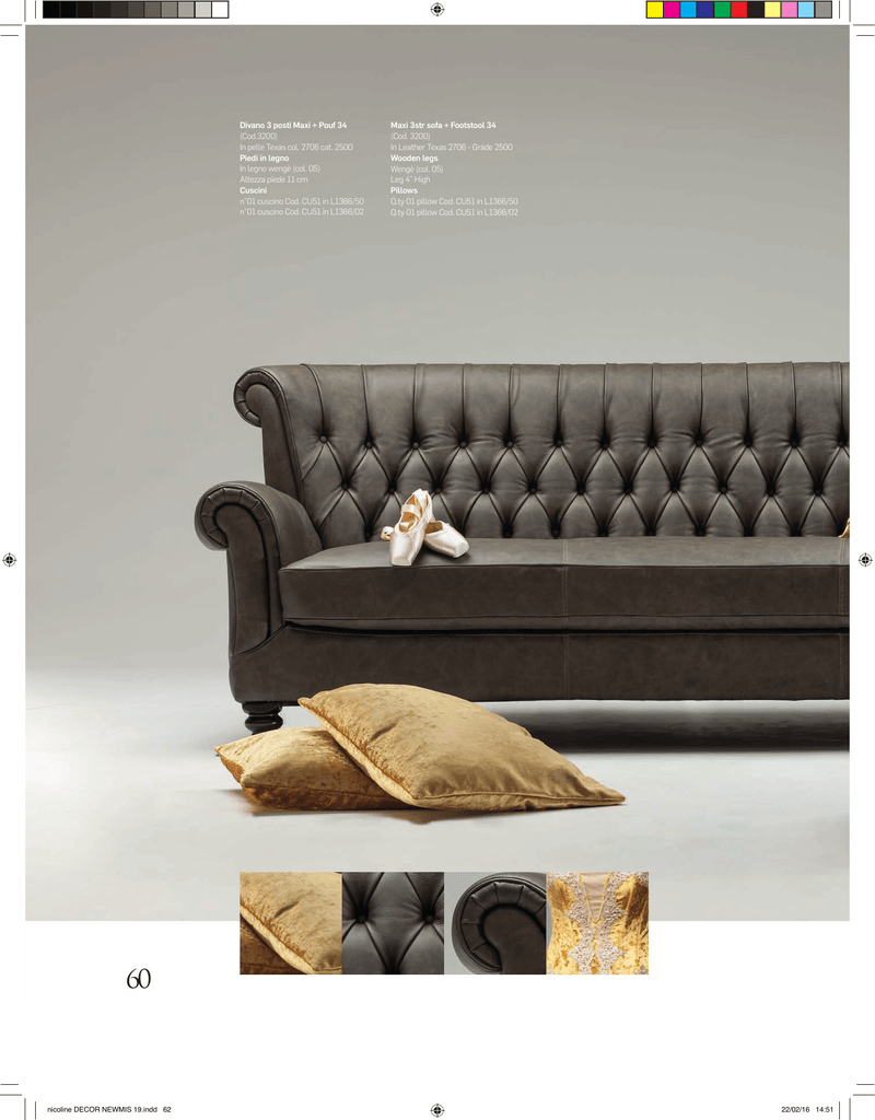 Divano 3 posti Maxi + Pouf 34 (Cod.3200) In pelle Texas col. 2706 cat. 2500 Piedi in legno In legno wengè (col. 05) Altezza piede 11 cm Cuscini n°01 cuscino Cod. CU51 in L1366/50 n°01 cuscino Cod. CU51 in L1366/02 Maxi 3str sofa + Footstool 34 (Cod. 3200) In Leather Texas 2706 - Grade 2500 Wooden legs Wengè (col. 05) Leg 4” High Pillows Q.ty 01 pillow Cod. CU51 in L1366/50 Q.ty 01 pillow Cod. CU51 in L1366/02 60 nicoline DECOR NEWMIS 19.indd 62 22/02/16 14:51 WINDSOR Un modello dalla grande personalità. Il divano Windsor è un altro modello di punta della collezione ”Decor”. A model with a great personality. The Windsor sofa is another model of the collection “Decor”. nicoline DECOR NEWMIS 19.indd 63 61 22/02/16 14:51 Divano 3 posti Maxi (Cod.3200) In pelle Golf col. 2045 cat. 2000 Piedi in legno In legno Noce antico (Cod. 04) Altezza piede 11 cm Cuscini n°01 cuscino Cod. CU51 in L1366/03 n°01 cuscino Cod. CU53 in L1366/01 Maxi 3str sofa (Cod.3200) In Leather Golf 2045 - Grade 2000 Wooden legs Old walnut (Cod. 04) Leg 4” High Pillows Q.ty 01 pillow Cod. CU51 in L1366/03 Q.ty 01 pillow Cod. CU53 in L1366/01 64 nicoline DECOR NEWMIS 19.indd 66 22/02/16 14:51 CAMBRIDGE Il modello Cambridge vanta un’importante spalliera con lavorazione “capitonnè” perfettamente integrata nel suo concept tra antico e moderno. The Cambridge model boasts an important quilted back cushion perfectly integrated in its concept of old and new. nicoline DECOR NEWMIS 19.indd 67 65 22/02/16 14:51 28 nicoline DECOR NEWMIS 19.indd 30 22/02/16 14:48 CHIO nicoline DECOR NEWMIS 19.indd 31 22/02/16 14:48 Divano 3 posti Maxi (Cod.3200) In pelle Royal 2330 cat. 2000 Piedi in legno Rivestiti in pelle Royal 2330 Altezza piede 5 cm Cuscini n°01 cuscino Cod. CU53 in L1366/01 n°01 cuscino Cod. CU50 in L1340/13 n°01 cuscino Cod. CU51 in L1366/20 Maxi 3str sofa (Cod.3200) In Leather Royal 2330 - Grade 2000 Wooden legs Covered with leather Royal 2330 Leg 2” High Pillows Q.ty 01 pillow Cod. CU53 in L1366/01 Q.ty 01 pillow Cod. CU50 in L1340/13 Q.ty 01 pillow Cod. CU51 in L1366/20 42 nicoline DECOR NEWMIS 19.indd 44 22/02/16 14:49 NETTUNO Nella versione in pelle bianca il Nettuno esprime il meglio di sè. Prezioso, elegante, trapuntato, confortevole, ma soprattutto artigianale. In this white leather version the Nettuno “shows off”. Precious, elegant, quilted, comfortable, and above all handmade. nicoline DECOR NEWMIS 19.indd 45 43 22/02/16 14:49