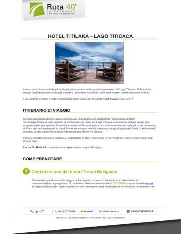 HOTEL TITILAKA - LAGO TITICACA Lusso, turismo sostenibile ed ecologia si incontrano sulla sponda peruviana del Lago Titicaca. Stile sobrio, design contemporaneo e dettagli moderni (pavimenti riscaldati, Ipod dock station, tende oscuranti e wi-fi). Il più recente premio: è stato riconosciuto nella Gold List di Condé Nast Traveler per il 2017. ITINERARIO DI VIAGGIO Servizio personalizzato ed escursioni incluse nella tariffa del programma "esperienza andina". 18 camere dotate di ogni comfort, di un'incantevole vista sul Lago Titicaca e numerose attività legate alla scoperta delle sue sponde. Il servizio è impeccabile: una guida con autista privato accoglie gli ospiti nel centro di Puno per accompagnarli in Land Rover ed in barca veloce (mezzora circa) all'appartato hotel. Gastronomia eccelsa, curata dalla chef di fama internazionale María Fe García. Firma e garanzia Relais & Chateaux, indicato tra le Best Adventure in the World da Tatler e nella Hot List di Condé Nast. Focus On Ruta 40: Location unica: splendore e magia del Lago... COME PRENOTARE Contattare uno dei nostri Travel Designers Se desideri pianificare il tuo viaggio sulla base di un preciso itinerario o, in alternativa, di interessi/desideri ti preghiamo di contattarci telefonicamente allo 011 7718046 oppure tramite e-mail. In caso di utilizzo del nostro modulo on-line un'esperto della destinazione ti contatterà via telefono per valutare insieme le tue esigenze. Conoscere le esigenze del cliente I nostri Travel Designers (specialisti della destinazione) hanno una conoscenza diretta dei luoghi e sono a disposizione per trasformare le richieste del cliente in un tour personalizzato. Sono in grado di rispondere ad ogni domanda, dare suggerimenti e consigli per soddisfare al meglio i tuoi desideri e disponibilità di budget. Affinare l'itinerario su misura Lo specialista dedicato elaborerà accuratamente il tuo itinerario, creando un Travel Plan (programma di viaggio) dettagliato che ti sarà inviato tramite e-mail. Sarà, inoltre, a tua completa disposizione per ulteriori chiarimenti e per perfezionare il tour in caso di successive richieste. Modalità di conferma Una volta elaborato l'itinerario finale che risponde completamente alle tue esigenze, ti chiediamo di inviarcelo via fax o email, controfirmato per accettazione; una volta ricevuto procederemo con la prenotazione ed appena avremo la conferma di tutti i servizi/voli ti verrà inviato l'estratto conto con le modalità di pagamento. A completa disposizione Successivamente alla conferma di prenotazione, ti invitiamo a contattarci per qualsiasi domanda relativa alla destinazione prescelta. La tua pratica sarà interamente seguita da uno specialista dedicato a cui potrai rivolgerti in caso di necessità e/o consigli. #scegli #rilassati #cipensiamonoi