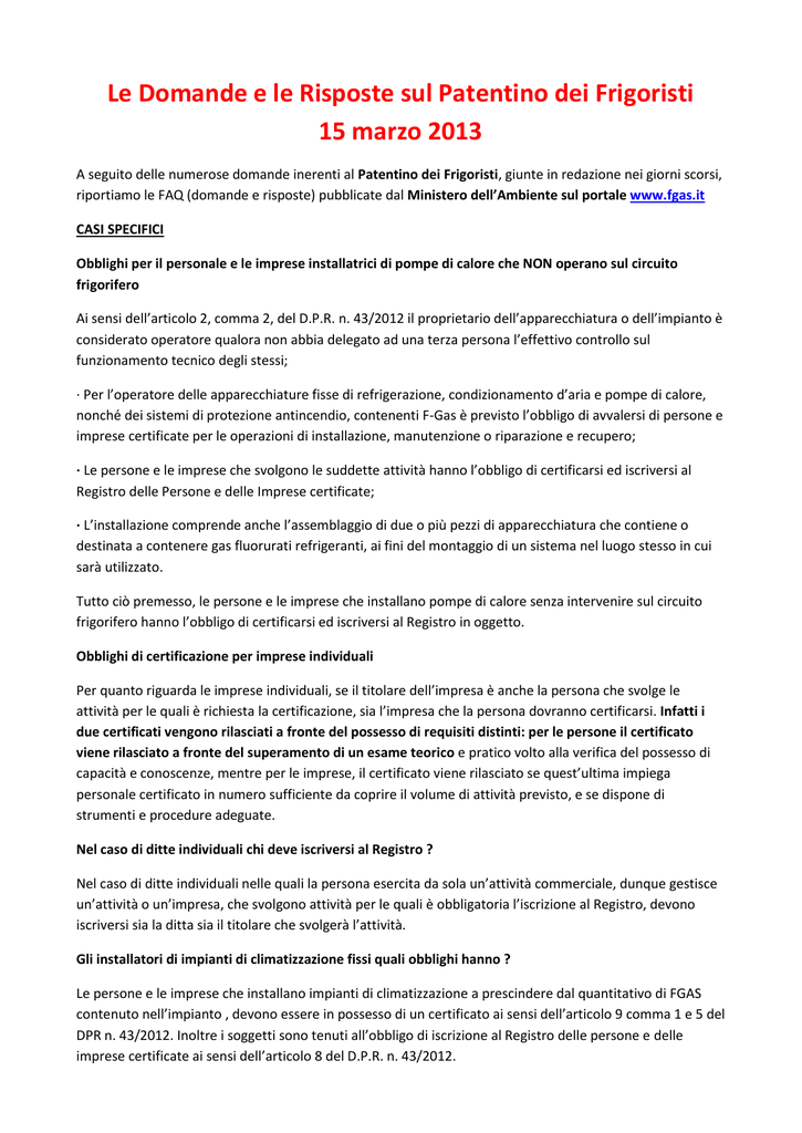 Le Domande e le Risposte sul Patentino dei Frigoristi 15 marzo 2013 A seguito delle numerose domande inerenti al Patentino dei Frigoristi, giunte in redazione nei giorni scorsi, riportiamo le FAQ (domande e risposte) pubblicate dal Ministero dell’Ambiente sul portale www.fgas.it CASI SPECIFICI Obblighi per il personale e le imprese installatrici di pompe di calore che NON operano sul circuito frigorifero Ai sensi dell’articolo 2, comma 2, del D.P.R. n. 43/2012 il proprietario dell’apparecchiatura o dell’impianto è considerato operatore qualora non abbia delegato ad una terza persona l’effettivo controllo sul funzionamento tecnico degli stessi; · Per l’operatore delle apparecchiature fisse di refrigerazione, condizionamento d’aria e pompe di calore, nonché dei sistemi di protezione antincendio, contenenti F-Gas è previsto l’obbligo di avvalersi di persone e imprese certificate per le operazioni di installazione, manutenzione o riparazione e recupero; · Le persone e le imprese che svolgono le suddette attività hanno l’obbligo di certificarsi ed iscriversi al Registro delle Persone e delle Imprese certificate; · L’installazione comprende anche l’assemblaggio di due o più pezzi di apparecchiatura che contiene o destinata a contenere gas fluorurati refrigeranti, ai fini del montaggio di un sistema nel luogo stesso in cui sarà utilizzato. Tutto ciò premesso, le persone e le imprese che installano pompe di calore senza intervenire sul circuito frigorifero hanno l’obbligo di certificarsi ed iscriversi al Registro in oggetto. Obblighi di certificazione per imprese individuali Per quanto riguarda le imprese individuali, se il titolare dell’impresa è anche la persona che svolge le attività per le quali è richiesta la certificazione, sia l’impresa che la persona dovranno certificarsi. Infatti i due certificati vengono rilasciati a fronte del possesso di requisiti distinti: per le persone il certificato viene rilasciato a fronte del superamento di un esame teorico e pratico volto alla verifica del possesso di capacità e conoscenze, mentre per le imprese, il certificato viene rilasciato se quest’ultima impiega personale certificato in numero sufficiente da coprire il volume di attività previsto, e se dispone di strumenti e procedure adeguate. Nel caso di ditte individuali chi deve iscriversi al Registro ? Nel caso di ditte individuali nelle quali la persona esercita da sola un’attività commerciale, dunque gestisce un’attività o un’impresa, che svolgono attività per le quali è obbligatoria l’iscrizione al Registro, devono iscriversi sia la ditta sia il titolare che svolgerà l’attività. Gli installatori di impianti di climatizzazione fissi quali obblighi hanno ? Le persone e le imprese che installano impianti di climatizzazione a prescindere dal quantitativo di FGAS contenuto nell’impianto , devono essere in possesso di un certificato ai sensi dell’articolo 9 comma 1 e 5 del DPR n. 43/2012. Inoltre i soggetti sono tenuti all’obbligo di iscrizione al Registro delle persone e delle imprese certificate ai sensi dell’articolo 8 del D.P.R. n. 43/2012. CERTIFICATO Il certificato rilasciato in Italia a persone o imprese è valido anche negli altri stati membri ? L’articolo 5, paragrafo 2 del Regolamento (CE) n. 842/2006 stabilisce che “Gli Stati membri riconoscono i certificati rilasciati negli altri Stati membri e si astengono dal limitare la libera prestazione di servizi e la libertà di stabilimento per motivi connessi al rilascio dei certificati in un altro Stato membro”. Quindi se la persona o l’impresa ottengono il certificato o l’attestato in Italia, potranno utilizzarlo anche in altri stati membri. Le modalità con le quali far valere in altro stato membro l’attestato ottenuto in Italia devono però essere richieste all’autorità dell’altro stato membro. Per fare un esempio: il riconoscimento in Italia di un certificato / attestato rilasciato da altro stato membro è subordinato alla trasmissione al Registro Nazionale del certificato ottenuto e di una sua traduzione giurata. Quindi è necessario che l’impresa o la persona interessate comprendano come procedere per far riconoscere il certificato rilasciato in Italia negli altri stati membri. Quali imprese devono ottenere il certificato ? Dopo l’iscrizione al Registro devono ottenere il certificato rilasciato dagli organismi di certificazione, le imprese che svolgono le seguenti attività : a) installazione, manutenzione o riparazione di apparecchiature fisse di refrigerazione, condizionamento d’aria e pompe di calore contenenti gas fluorurati ad effetto serra; b) installazione, manutenzione o riparazione di impianti fissi di protezione antincendio e di estintori contenenti gas fluorurati ad effetto serra; Le imprese possono prendere in consegna gas fluorurati ad effetto serra solo se in possesso del certificato . Per ottenere il certificato l’impresa deve soddisfare i seguenti requisiti –> deve impiegare personale certificato, ai sensi dell’Art. 9 comma 1 del DPR, per le attività che richiedono una certificazione in numero sufficiente da coprire il volume d’attività previsto. A tal fine l’impresa dovrà indicare i nominativi e il numero di certificato del suddetto personale; –> deve dimostrare che il personale impegnato nelle attività per cui è richiesta la certificazione abbia a disposizione gli strumenti e le procedure necessari per svolgerle. Le imprese devono conseguire il certificato entro sei mesi dal rilascio del certificato provvisorio di cui all’articolo 10, comma 2. Che differenza c’è tra il “certificato provvisorio” e il “certificato” ? Il certificato provvisorio viene rilasciato dalla Camera di commercio sulla base di una autocertificazione del possesso dei requisiti e consente alla persona e all’impresa di svolgere l’attività sino al conseguimento del certificato, che deve avvenire entro 6 mesi dal rilascio del provvi