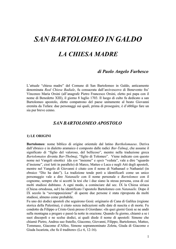 SAN BARTOLOMEO IN GALDO LA CHIESA MADRE di Paolo Angelo Furbesco L’attuale “chiesa madre” del Comune di San Bartolomeo in Galdo, anticamente denominata Real Chiesa Badiale, fu consacrata dall’arcivescovo di Benevento fra’ Vincenzo Maria Orsini (all’anagrafe Pietro Francesco Orsini, eletto poi papa con il nome di Benedetto XIII), il giorno 8 luglio 1703. Il luogo di culto fu dedicato a san Bartolomeo apostolo, eletto compatrono del paese unitamente al beato Giovanni eremita da Tufara: due personaggi sui quali, prima di proseguire, è d’obbligo fare un sia pur breve cenno. SAN BARTOLOMEO APOSTOLO 1) LE ORIGINI Bartolomeo: nome biblico di origine orientale dal latino Bartholomaeus. Deriva dall’ebraico e in dialetto aramaico è composto dalle radici Bar-Talmaj, che assume il significato di “figlio del valoroso, del bellicoso”, mentre nella traduzione greca Bartolomaios diventa Bar-Tholmaj, “figlio di Tolomeo”. Viene indicato con questo nome nei Vangeli sinottici (da syn “insieme” e opsis “veduta”, vale a dire “sguardo d’insieme”, cioè letti in parallelo) di Marco, Matteo e Luca e negli Atti degli apostoli, mentre nel Vangelo di Giovanni è citato con il nome di Nathanael o Nathaniel (in ebraico “Dio ha dato”). La tradizione tende però a identificarli come un unico personaggio vale a dire Natanaéle con il nome personale e Bartolomeo con il cognome, sempre che si accetti la tesi che i due siano la stessa persona, cosa di cui molti studiosi dubitano. A ogni modo, a cominciare dal sec. IX la Chiesa siriaca (Chiesa ortodossa, ndr) ha identificato l’apostolo Bartolomeo con Natanaéle. Dopo il IX secolo la “sovrapposizione” di queste due persone è stata riproposta da molti studiosi, almeno come probabile. Fu uno dei dodici apostoli che seguirono Gesù: originario di Cana di Galilea (regione storica della Palestina), è citato senza indicazioni sulle date di nascita e di morte. Fu condotto da Filippo a Cristo Gesù presso il Giordano: «In quei giorni Gesù se ne andò sulla montagna a pregare e passò la notte in orazione. Quando fu giorno, chiamò a se i suoi discepoli e ne scelse dodici, ai quali diede il nome di apostoli: Simone che chiamò Pietro, Andrea suo fratello, Giacomo, Giovanni, Filippo, Bartolomeo, Matteo, Tommaso, Giacomo d’Alfeo, Simone soprannominato Zelota, Giuda di Giacomo e Giuda Iscariota, che fu il traditore» (Lc 6, 12-16). 1 Le notizie sulla sua figura sono piuttosto scarse e la sua passione contiene molte incertezze in quanto la storia della sua vita, delle opere e del martirio è frammentata da innumerevoli eventi leggendari, forse storicamente inattendibili. Crebbe all’ombra di Gesù e assieme ai suoi discepoli vide miracoli (fu testimone del primo, alle nozze in Cana di Galilea) e guarigioni e assise nel cenacolo all’ultima sua cena. Fu presente all’ascensione di Gesù che dalla cima del monte si sollevò al cielo dopo aver detto agli apostoli: «Andate in tutto il mondo e predicate il vangelo ad ogni creatura e battezzate nel nome del Padre e del Figlio e dello Spirito Santo, insegnando ad osservare tutto ciò che vi ho comandato. Ecco, io sono con voi tutti i giorni, fino alla fine del mondo». Fu accanto a Maria nel cenacolo, ove gli apostoli raccolti in preghiera ricevettero la Spirito Santo in forma di tremolanti fiammelle sopra ciascuno di loro. Il suo nome compare nell’elenco dei dodici inviati da Cristo a predicare e, ancora, negli Atti degli apostoli, dove viene elencato assieme ad altri dopo la sua resurrezione. Null’altro si conosce delle sue origini all’infuori di quanto testé citato dai Vangeli, che pur narrando fatti storici e interpretando quanto è accaduto non sono biografie di Gesù in senso proprio, perché la finalità che si propongono è soprattutto formativa, educativa e testimoniale; per questo i Vangeli sono fedeli alla storia e alla tradizione che si riferisce a Gesù, ma lo fanno tenendo presente gli interessi e i bisogni dei loro destinatari. Da quei momenti più nulla: solo la tradizione della sua vita missionaria in varie regioni del Medio Oriente. Nella storia della Chiesa cattolica si accenna che predicò in Armenia, India e Mesopotamia, senza peraltro lasciare memorie specifiche o leggende che raccontino tale missione nei particolari. È definito da Benedetto XVI «un esempio di viva e profonda adesione a Cristo». In merito, ecco la conclusione del Santo Padre nell’udienza generale del 4 ottobre 2006: «La figura di san Bartolomeo, pur nella scarsità delle informazioni che lo riguardano, resta comunque davanti a noi per dirci che l’adesione a Gesù può essere vissuta e testimoniata anche senza il compimento di opere sensazionali. Straordinario è e resta Gesù stesso, a cui ciascuno di noi è chiamato a consacrare la propria vita e la propria morte». 2) MISSIONE E MARTIRIO Come abbiamo già riferito, dopo la Pentecoste (festa ebraica celebrata cinquanta giorni dopo la Pasqua), l’apostolato di Bartolomeo fu attivissimo: pur non potendo stabilire nulla di preciso, la tradizione posteriore gli attribuì lunghi viaggi missionari. Anche la morte è affidata al racconto che lo vuole ucciso da parte del re dei Medi secondo alcune fonti nella regione della Siria, mentre altre fonti parlano dell’Armenia. In Oriente si ritiene che egli sia stato crocifisso, mentre nell’Occidente cristiano si tramandano altre due varianti: quelle della morte per decapitazione o per scuoiamento. In merito, mentre sant’ Ippolito martire, teologo e scrittore cristiano, asserisce che «fu crocefisso con il capo all’ingiù, e sotto il capo furono bruciati cumuli di erbe verdi e fetide per soffocarlo col fumo che a grandi volute si sprigionava e lo investiva», nei Martirologi (libri liturgici formati dalla raccolta dei nomi di più santi) di Rabano, Adone e Usuardo si afferma che «predicò nell’India il vangelo di Cristo e recatosi nell’Armenia maggiore, avendo convertito moltissimi 