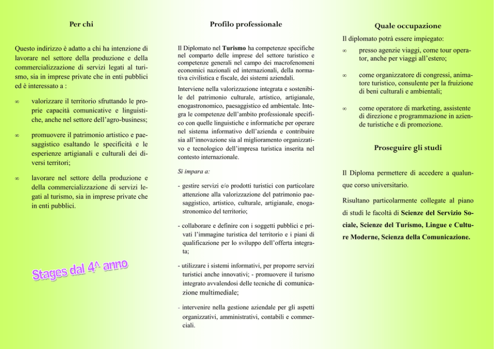 Per chi Profilo professionale Quale occupazione Il diplomato potrà essere impiegato: Questo indirizzo è adatto a chi ha intenzione di lavorare nel settore della produzione e della commercializzazione di servizi legati al turismo, sia in imprese private che in enti pubblici ed è interessato a : • • • valorizzare il territorio sfruttando le proprie capacità comunicative e linguistiche, anche nel settore dell’agro-business; promuovere il patrimonio artistico e paesaggistico esaltando le specificità e le esperienze artigianali e culturali dei diversi territori; lavorare nel settore della produzione e della commercializzazione di servizi legati al turismo, sia in imprese private che in enti pubblici. Il Diplomato nel Turismo ha competenze specifiche nel comparto delle imprese del settore turistico e competenze generali nel campo dei macrofenomeni economici nazionali ed internazionali, della normativa civilistica e fiscale, dei sistemi aziendali. Interviene nella valorizzazione integrata e sostenibile del patrimonio culturale, artistico, artigianale, enogastronomico, paesaggistico ed ambientale. Integra le competenze dell’ambito professionale specifico con quelle linguistiche e informatiche per operare nel sistema informativo dell’azienda e contribuire sia all’innovazione sia al miglioramento organizzativo e tecnologico dell’impresa turistica inserita nel contesto internazionale. • presso agenzie viaggi, come tour operator, anche per viaggi all’estero; • come organizzatore di congressi, animatore turistico, consulente per la fruizione di beni culturali e ambientali; • come operatore di marketing, assistente di direzione e programmazione in aziende turistiche e di promozione. Proseguire gli studi Si impara a: Il Diploma permettere di accedere a qualun- - gestire servizi e/o prodotti turistici con particolare attenzione alla valorizzazione del patrimonio paesaggistico, artistico, culturale, artigianale, enogastronomico del territorio; que corso universitario. - collaborare e definire con i soggetti pubblici e privati l’immagine turistica del territorio e i piani di qualificazione per lo sviluppo dell’offerta integrata; ciale, Scienze del Turismo, Lingue e Cultu- - utilizzare i sistemi informativi, per proporre servizi turistici anche innovativi; - promuovere il turismo integrato avvalendosi delle tecniche di comunica- zione multimediale; - intervenire nella gestione aziendale per gli aspetti organizzativi, amministrativi, contabili e commerciali. Risultano particolarmente collegate al piano di studi le facoltà di Scienze del Servizio So- re Moderne, Scienza della Comunicazione. Quadro orario settimanale Via Cortivo,30/32 - 24067 SARNICO Come raggiungerci tel. 035-914290 / 035-4261452 fax 035-911236 indirizzo e-mail: [email protected] sito web: www.istitutoriva.it Siamo anche su 1° biennio 2° biennio 5° 1° 2° 3° 4° 5° Lingua e Lett. Italiana 4 4 4 4 4 Storia 2 2 2 2 2 Lingua Inglese 3 3 3 3 3 Matematica 4 4 3 3 3 Diritto /economia 2 2 Scienze della terra e biologia 2 2 Scienze motorie e sportive 2 2 2 2 2 IRC o attività alternativa 1 1 1 1 1 DISCIPLINE Istruzione Tecnica Turismo Attività ed insegnamenti di indirizzo Fisica Un indirizzo per la cultura, la professione, la vita. 2 2 Chimica Geografia 3 3 Informatica 2 2 Seconda lingua comunitaria 3 3 Economia aziendale 2 2 3 3 3 Terza lingua straniera 3 3 3 Discipline turistiche e aziendali 4 4 4 Geografia Turistica 2 2 2 Diritto e legislazione 3 3 3 Arte e territorio 2 2 2 32 32 32 32 32