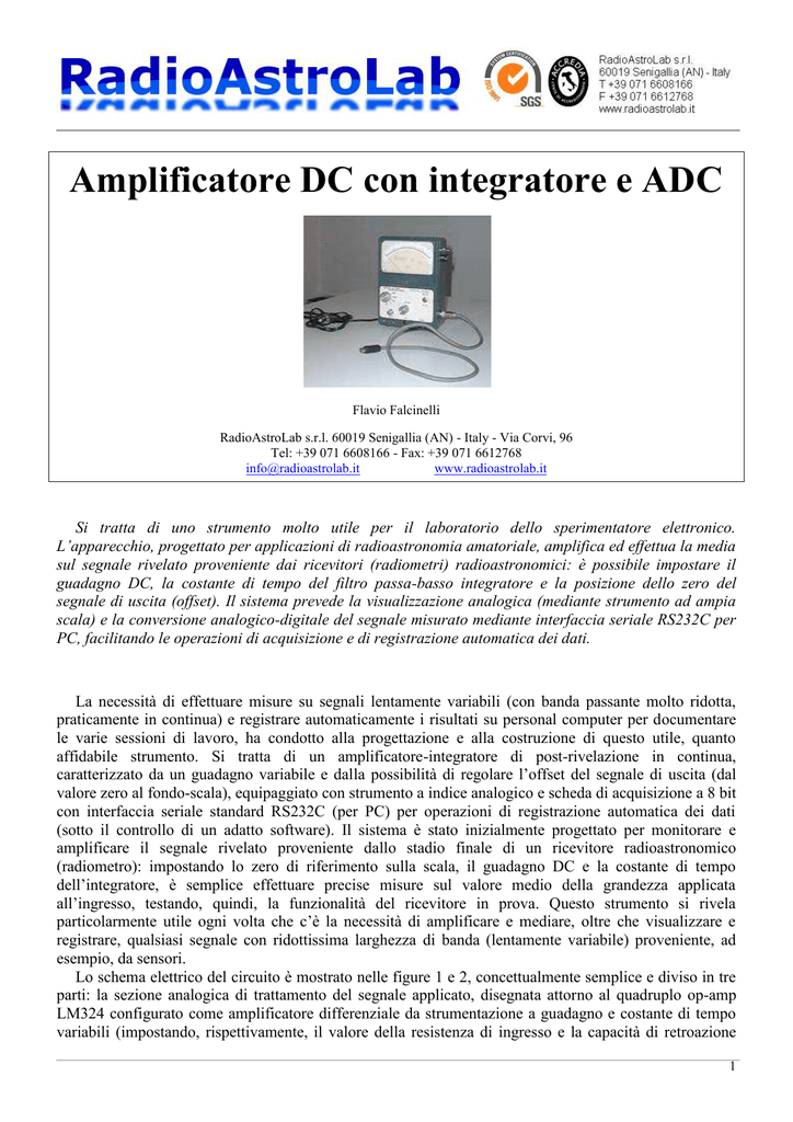 Amplificatore DC con integratore e ADC Flavio Falcinelli RadioAstroLab s.r.l. 60019 Senigallia (AN) - Italy - Via Corvi, 96 Tel: +39 071 6608166 - Fax: +39 071 6612768 [email protected] www.radioastrolab.it Si tratta di uno strumento molto utile per il laboratorio dello sperimentatore elettronico. L’apparecchio, progettato per applicazioni di radioastronomia amatoriale, amplifica ed effettua la media sul segnale rivelato proveniente dai ricevitori (radiometri) radioastronomici: è possibile impostare il guadagno DC, la costante di tempo del filtro passa-basso integratore e la posizione dello zero del segnale di uscita (offset). Il sistema prevede la visualizzazione analogica (mediante strumento ad ampia scala) e la conversione analogico-digitale del segnale misurato mediante interfaccia seriale RS232C per PC, facilitando le operazioni di acquisizione e di registrazione automatica dei dati. La necessità di effettuare misure su segnali lentamente variabili (con banda passante molto ridotta, praticamente in continua) e registrare automaticamente i risultati su personal computer per documentare le varie sessioni di lavoro, ha condotto alla progettazione e alla costruzione di questo utile, quanto affidabile strumento. Si tratta di un amplificatore-integratore di post-rivelazione in continua, caratterizzato da un guadagno variabile e dalla possibilità di regolare l’offset del segnale di uscita (dal valore zero al fondo-scala), equipaggiato con strumento a indice analogico e scheda di acquisizione a 8 bit con interfaccia seriale standard RS232C (per PC) per operazioni di registrazione automatica dei dati (sotto il controllo di un adatto software). Il sistema è stato inizialmente progettato per monitorare e amplificare il segnale rivelato proveniente dallo stadio finale di un ricevitore radioastronomico (radiometro): impostando lo zero di riferimento sulla scala, il guadagno DC e la costante di tempo dell’integratore, è semplice effettuare precise misure sul valore medio della grandezza applicata all’ingresso, testando, quindi, la funzionalità del ricevitore in prova. Questo strumento si rivela particolarmente utile ogni volta che c’è la necessità di amplificare e mediare, oltre che visualizzare e registrare, qualsiasi segnale con ridottissima larghezza di banda (lentamente variabile) proveniente, ad esempio, da sensori. Lo schema elettrico del circuito è mostrato nelle figure 1 e 2, concettualmente semplice e diviso in tre parti: la sezione analogica di trattamento del segnale applicato, disegnata attorno al quadruplo op-amp LM324 configurato come amplificatore differenziale da strumentazione a guadagno e costante di tempo variabili (impostando, rispettivamente, il valore della resistenza di ingresso e la capacità di retroazione 1 sullo stadio di uscita), la sezione digitale di conversione analogico-digitale e di formazione della parola seriale RS232 per il trasferimento dei dati verso il PC, il modulo alimentatore rappresentato dallo schema di figura 2. Come si vede, si sono utilizzati componenti economici e facilmente reperibili, evitando volutamente l’impiego di microcontrollori per facilitare la costruzione del dispositivo, pur garantendo prestazioni interessanti in termini di stabilità e precisione della misura. Fig. 1: Schema elettrico dell’amplificatore-integratore. 2 In appendice è riportato un semplice esempio di routine software per la gestione dello strumento, scritta in QBasic e “ridotta all’osso”: è lasciata al lettore ampia libertà di realizzare programmi funzionali e sofisticati, in modo che si adattino perfettamente alle personali esigenze applicative. La risoluzione del convertitore analogico-digitale è di 8 bit, con baud rate impostato a 4800 bit/sec.: il software di gestione dovrà essere sviluppato per ottimizzare il campionamento del segnale ricevuto e la successiva memorizzazione sul disco fisso del PC in base al tipo di segnale e di ricerca da svolgere. La scheda funziona come trasmettitore dati a ciclo continuo, a tutto vantaggio della velocità di acquisizione e della semplicità di connessione. Il campionamento e la conversione del segnale analogico sono affidati al circuito integrato ADC0804, facilmente reperibile anche nel mercato surplus, che fornisce (in un tempo appena superiore a 100 msec.) il codice a 8 bit paralleli relativi alla conversione di ogni campione di segnale acquisito. La successiva implementazione della parola seriale richiede la conversione parallela/seriale con l’aggiunta dei bit di start e di stop. Queste operazioni sono svolte dallo shift-register a 8 bit 4021 (sostituibile con il 4014): dopo che l’ADC ha reso disponibile il byte relativo a un campione avviene il suo caricamento parallelo nel registro a scorrimento. Successivamente, sincrona con il segnale di clock fornito dal 4060, é disponibile al pin 11 del 4011 la parola seriale da inviare al PC. Il segnale è, infine, adattato alla linea seriale dal noto circuito integrato driver MAX232. La temporizzazione e la generazione dei segnali di controllo del sistema é affidata al 4060, funzionante come generatore di clock quarzato (con possibilità di selezionare il baud rate a 150, 300, 600, 2400, 4800 baud) e al contatore decimale 4017 (figura 3). Una volta costruito, il sistema richiede alcune semplici operazioni di taratura: occorre regolare il trimmer sul pin 3 del LM324 in modo che sia nulla la tensione sul pin 8 in assenza di segnale applicato e regolare il trimmer in serie allo strumento indicatore analogico per adattare il valore di fondo-scala alla sua sensibilità. Il trimmer posto fra il pin 2 e 13 del LM324 serve per impostare il guadagno minimo del sistema, che sarà successivamente variato commutando i valori delle resistenze poste in serie al pin 6. Come per tutte le realizzazioni proposte, nella progettazione si è seguito un criterio di modularità del sistema per consentire allo sperimentatore di modificare le varie parti dello schema in b