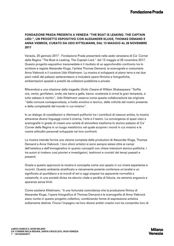 FONDAZIONE PRADA PRESENTA A VENEZIA “THE BOAT IS LEAKING. THE CAPTAIN LIED.”, UN PROGETTO ESPOSITIVO CON ALEXANDER KLUGE, THOMAS DEMAND E ANNA VIEBROK, CURATO DA UDO KITTELMANN, DAL 13 MAGGIO AL 26 NOVEMBRE 2017 Venezia, 25 gennaio 2017 - Fondazione Prada presenterà nella sede veneziana di Ca’ Corner della Regina “The Boat is Leaking. The Captain Lied.” dal 13 maggio al 26 novembre 2017. Questo progetto espositivo transmediale è il risultato di un approfondito confronto tra lo scrittore e regista Alexander Kluge, l’artista Thomas Demand, la scenografa e costumista Anna Viebrock e il curatore Udo Kittelmann. La mostra si svilupperà al piano terra e nei due piani nobili del palazzo settecentesco e includerà opere filmiche e fotografiche, ambientazioni spaziali e prestiti da collezioni pubbliche e private. Riferendosi a una citazione dalla tragedia Giulio Cesare di William Shakespeare “Soffia ora, vento; gonfiatevi, onde; sta bene a galla, barca: scatenata è ormai la gran tempesta, e tutto adesso è rischio”, Udo Kittelmann osserva come questa collaborazione sia originata “dalla comune consapevolezza, a livello emotivo e teorico, delle criticità del nostro presente e della complessità del mondo in cui viviamo”. In un dialogo di costellazioni e riferimenti polifonici tra i contributi di ciascun artista, la mostra attraversa diversi linguaggi come il cinema, l’arte e il teatro. La convergenza di spazi visivi e scenografie in grado di creare una varietà di atmosfere trasforma lo storico palazzo di Ca’ Corner della Regina in un luogo metaforico nel quale scoprire i mondi in cui viviamo e le nostre attitudini personali sviluppate nei loro confronti. La mostra intende fornire una visione completa delle produzioni di Alexander Kluge, Thomas Demand e Anna Viebrock. I loro sforzi artistici si sono sempre estesi oltre ai campi dell’estetica e dell’immaginativo in quanto concepiti con chiare intenzioni storico-politiche. I tre autori si rivelano così pionieri e investigatori, testimoni e cronisti dei tempi passati e presenti. Grazie a questo approccio la mostra è concepita come uno spazio in cui vivere esperienze e incontri. Questo ambiente stratificato e visivamente potente conferisce un’analisi e un significato al quotidiano e ai mondi di ieri e oggi sospesi tra apparente normalità e catastrofe, in una società divisa tra slancio vitale e perdita di fiducia, tra estrema angoscia e speranza senza limiti. Come sostiene Kittelmann, “è una fortunata coincidenza che la produzione filmica di Alexander Kluge, l’opera fotografica di Thomas Demand e le scenografie di Anna Viebrock siano riunite in questo progetto collettivo, combinando forme di espressione artistica solitamente distinte. Finora l’impegno nei loro diversi ambiti creativi non ha consentito loro di creare una collaborazione così simbiotica, nonostante si conoscano personalmente e abbiano spesso messo a confronto le loro idee”. La mostra “The Boat is Leaking. The Captain Lied.” sarà accompagnata da una pubblicazione illustrata curata da Udo Kittelmann ed edita dalla Fondazione Prada. Contatti stampa Fondazione Prada T +39 02 56 66 26 34 [email protected] fondazioneprada.org Note biografiche Alexander Kluge (Halberstadt, Germania, 1932) è uno scrittore, regista e laureato in legge. È uno dei pionieri del Nuovo cinema tedesco e nel 1966 è il primo tedesco del dopoguerra a ricevere il Leone d’argento al Festival di Venezia per Abschied von Gestern (La ragazza senza storia). Nel 1968 vince il Leone d’oro con Artisten in der Zirkuskuppel: ratlos (Artisti sotto la tenda del circo: perplessi) e nel 1982 il Leone d’oro alla carriera per la sua attività cinematografica. Dal 1988 la casa di produzione DCTP (Development Company for Television Program), che Kluge ha cofondato, gira migliaia di ore di programmi indipendenti. Kluge è anche ideatore della trasmissione televisiva “Kulturmagazine”. La sua attività televisiva si rifà alla tradizione del cinema d’autore, sviluppando forme inedite di dialogo del genere di “Facts & Fakes”. I più recenti lavori cinematografici di Kluge includono i “Minutenfilme” (cortometraggi di qualche minuto) e i “10-Stunden-Programme” (programmi di dieci ore), in continuità con gli albori della storia del cinema. I libri di Kluge come Geschichte und Eigensinn (scritto con Oskar Negt), Chronik der Gefühle e il più recente L’ora di Kong. Cronaca della correlazione appartengono allo stesso contesto della sua produzione per il cinema e la televisione. Kluge ha vinto il Büchner Preis e il Theodor W. Adorno Preis. Ancora oggi il suo lavoro cinematografico e letterario affascina per il carattere sperimentale e l’indagine sulla storia del XX e XXI secolo. Thomas Demand (Monaco di Baviera, Germania, 1964) è uno degli artisti più influenti nel campo della fotografia. Le sue opere fanno parte di numerose collezioni museali in tutto il mondo, inclusi il MoMA di New York, il Guggenheim Museum di New York, il Centre Pompidou di Parigi, la Tate Modern di Londra e la Nationalgalerie di Berlino. Prestigiose istituzioni internazionali hanno dedicato al suo lavoro importanti mostre personali: Modern Art Museum, Fort Worth, Texas (2016); Graham Foundation, Chicago (2013); DHC Art Center, Montréal (2013); National Gallery, Victoria, Melbourne (2012); Museum of Modern Art, Tokyo (2012); Kaldor Public Arts Project #25, Sydney (2012); Museum Boijmans Van Beuningen, Rotterdam (2010); Neue Nationalgalerie, Berlino (2009); Fondazione Prada, Venezia (2007); Serpentine Gallery, Londra (2006); Museum of Modern Art, New York (2005); Kunsthaus Bregenz, Bregenz, Austria (2004). L’artista ha inoltre rappresentato la Germania alla 26esima Bienal de São Paulo. Attraverso i suoi lavori fotografici Demand indaga la cultura, la società e la contemporaneità. La sua opera multiforme mette lo spettatore di fronte a una realtà che non è quella che sembra. Demand è do