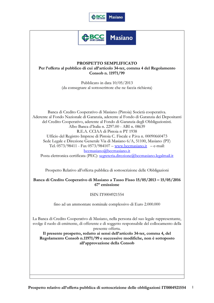 PROSPETTO SEMPLIFICATO Per l’offerta al pubblico di cui all’articolo 34-ter, comma 4 del Regolamento Consob n. 11971/99 Pubblicato in data 10/05/2013 (da consegnare al sottoscrittore che ne faccia richiesta) Banca di Credito Cooperativo di Masiano (Pistoia) Società cooperativa. Aderente al Fondo Nazionale di Garanzia, aderente al Fondo di Garanzia dei Depositanti del Credito Cooperativo, aderente al Fondo di Garanzia degli Obbligazionisti. Albo Banca d’Italia n. 2297.00 - ABI n. 08639 R.E.A. CCIAA di Pistoia n PT 1938 Ufficio del Registro Imprese di Pistoia C. Fiscale e P.iva n. 00090660473 Sede Legale e Direzione Generale Via di Masiano 6/A, 51100, Masiano (PT) Tel. 0573/98411 - Fax 0573/984107 – www.bccmasiano.it – e-mail: [email protected] Posta elettronica certificata (PEC): [email protected] Prospetto Relativo all’offerta pubblica di sottoscrizione delle Obbligazioni Banca di Credito Cooperativo di Masiano a Tasso Fisso 15/05/2013 – 15/05/2016 67ª emissione ISIN IT0004921554 fino ad un ammontare nominale complessivo di Euro 2.000.000 La Banca di Credito Cooperativo di Masiano, nella persona del suo legale rappresentante, svolge il ruolo di emittente, di offerente e di soggetto responsabile del collocamento della presente offerta. Il presente prospetto, redatto ai sensi dell’articolo 34-ter, comma 4, del Regolamento Consob n.11971/99 e successive modifiche, non è sottoposto all’approvazione della Consob Prospetto relativo all’offerta pubblica di sottoscrizione delle obbligazioni IT0004921554 1 INFORMAZIONI SULL’EMITTENTE DENOMINAZIONE E FORMA GIURIDICA SEDE LEGALE E AMMINISTRATIVA GRUPPO BANCARIO DI APPARTENENZA DATI FINANZIARI SELEZIONATI La denominazione legale dell’emittente è Banca di Credito Cooperativo di Masiano (Pistoia)-S.C., mentre la denominazione commerciale è BCC Masiano, di seguito “Banca”. La Banca di Credito Cooperativo di Masiano è una società cooperativa a mutualità prevalente. L’emittente è sottoposto a vigilanza prudenziale da parte di Banca d’Italia. La Banca ha sede legale e amministrativa in Masiano, via di Masiano 6/A, 51100 Pistoia (PT), tel. 0573/98411. La Banca non appartiene a nessun gruppo bancario ai sensi dell’art. 60 del D.Lgs. 385/93. La Banca è iscritta all’Albo delle banche tenuto dalla Banca d’Italia al numero 2297.00; Codice ABI 08639. Dati finanziari1 2012 2011 Patrimonio di vigilanza Core Tier One Capital Ratio Tier One Capital Ratio Total Capital Ratio Sofferenze lorde/impieghi lordi Sofferenze nette/impieghi netti Partite anomale lorde/impieghi lordi 35.321 12,39 % 12,39 % 12,89 % 9,09 % 5,62 % 19,88 % 37.297 13,76 % 13,76 % 14,29 % 7,13 % 4,21 % 13,36 % INFORMAZIONI SULLE OBBLIGAZIONI PREZZO DI EMISSIONE E VALORE NOMINALE UNITARIO PREZZO E MODALITA’ DI RIMBORSO DATA DI EMISSIONE DATA DI SCADENZA CEDOLE LORDE Il prezzo di offerta delle obbligazioni è pari al 100% del valore nominale, corrispondente ad un importo minimo di sottoscrizione di 10.000 euro e con valore nominale unitario di 1.000 euro, con l’aumento dell’eventuale rateo di interessi qualora la sottoscrizione avvenga in data successiva alla data di godimento del prestito, senza aggravio di spese ed imposte o altri oneri a carico dei sottoscrittori. Le obbligazioni saranno rimborsate al 100% del valore nominale in unica soluzione alla scadenza. Il pagamento delle cedole scadute ed il rimborso a scadenza avverrà mediante accredito in conto. Qualora il pagamento cadesse in un giorno non lavorativo per il sistema bancario, lo stesso verrà eseguito il primo giorno lavorativo successivo, senza che ciò dia diritto a maggiori interessi. Non è previsto il rimborso anticipato del prestito. L’emissione delle obbligazioni è stata deliberata dal Consiglio di amministrazione in data 29/04/2013. La data di godimento delle obbligazioni è il 15/05/2013 Le obbligazioni scadono in data 15/05/2016 e da tale data cesseranno di produrre interessi. Il prestito sarà fruttifero di interessi nella misura del 2,70% lordo su base annua. Gli interessi, calcolati secondo la convenzione 1 I dati finanziari sono riferiti all’ultima semestrale 2012 e all’ultimo bilancio 2011 approvato. I dati sono espressi in migliaia. Prospetto relativo all’offerta pubblica di sottoscrizione delle obbligazioni IT0004921554 2 ACT/ACT, saranno pagati posticipatamente con rate semestrali il 15 maggio e il 15 novembre di ogni anno. Qualora il pagamento degli interessi cada in un giorno non lavorativo per il sistema bancario, lo stesso sarà eseguito il primo giorno lavorativo successivo, senza che ciò dia luogo a maggiori interessi. Calcolo degli interessi lordi Il calcolo degli interessi è effettuato secondo la seguente formula: per le cedole semestrali: I = VN x (T/2) dove I = interessi VN = Valore Nominale Sottoscritto T = tasso lordo su base annua RENDIMENTO EFFETTIVO SU BASE ANNUA E CONFRONTO CON QUELLO DI UN TITOLO DI STATO Il tasso annuo lordo di rendimento effettivo del titolo, calcolato in regime di capitalizzazione composta, è pari al 2,7156% ed il rendimento effettivo netto è pari al 2,1696% Confrontando il rendimento delle obbligazioni con quello di un BTP (Buono del Tesoro Poliennale) di similare scadenza, ad esempio il BTP 15.05.2016 2,25% (IT0004917792) con riferimento ai prezzi del 04/05/2013 (Fonte: “Il Sole 24 Ore” e “Borsa Italiana”), i relativi rendimenti annui a scadenza lordi e netti, considerando le cedole future pari a quella in corso, vengono di seguito rappresentati: Caratteristiche BTP 15.05.2016 IT0004917792 15.05.2016 101,3563 1,7930% BCC Tasso Fisso 67° Emissione Scadenza 15.05.2016 Prezzo di acquisto 100 Rendimento effettivo 2,7156% annuo lordo Rendimento effettivo 1,5084% 2,1696% annuo netto fonte “Il Sole 24 ore” del 04.05.2013 GARANZIE CONDIZIONI DI LIQUIDITA’ E LIQUIDABILITA’ Le obbligazioni non rientrano tra gli strumenti di raccolta assistiti dal Fondo di Garanzia dei Depositanti del Credito Cooperativo. Il pr