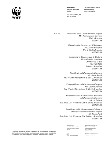 WWF Italia Sezione regionale Molise Tel e Fax: 0865415519 [email protected] sito: www.wwf.it Via Giovani XXIII, 38 86170 Isernia Alla c.a. Presidente della Commissione Europea Mr. José Manuel Barroso 1049, Brussels BELGIUM Commissario Europeo per l’Ambiente Mr. Janez Potočnik DG B-1049, Brussels BELGIUM Commissario Europeo per la Cultura Ms Androulla Vassiliou 200 Rue de la Loi (Berl 10/110) B-1049, Bruxelles BELGIUM Presidente del Parlamento Europeo Mr. Jerzy Buzek Rue Wiertz-Wiertzstraat B-1047, Bruxelles BELGIUM Vicepresidente del Parlamento Europeo Mr. Gianni Pittella Rue Wiertz-Wiertzstraat B-1047, Bruxelles BELGIUM Presidente della Commissione Ambiente del Parlamento Europeo Mr. Jo Leinen Rue de la Loi- Wetstraat 200 B-1049, Bruxelles BELGIUM Presidente della Commissione Cultura e Istruzione del Parlamento Europeo Ms Doris Pack Rue de la Loi- Wetstraat 200 B-1049, Bruxelles BELGIUM Lo scopo finale del WWF è fermare e far regredire il degrado dell’ambiente naturale del nostro pianeta e contribuire a costruire un futuro in cui l’umanità possa vivere in armonia con la natura. Registrato come: Ente morale riconosciuto con Associazione Italiana per il Decreto Presidente della World Wide Fund For Nature Repubblica Italiana n. 493 ONLUS Del 4 aprile 1974. C.F.80078430586 Schedario Anagrafe Nazionale Ricerche N. H 1890AD2 Corte di Giustizia Europea Boulevard Konrad Adenauer L-2925, LUXEMBOURG Comitato delle Regioni Commissione Ambiente, Cambiamenti Climatici ed Energia Mr Ilmaar REEPALU Bâtiment Jacques Delors Rue Belliard 99-101, B – 1040, Brussels BELGIUM Agenzia Europea per l’Ambiente Mr Soren NIELSEN Kongens Nytorv 6 1050, København DANEMARK Commissione Petizioni del Parlamento Europeo Rue Wertz B-1047 Bruxelles BELGIUM Sede Internazionale UNESCO Rue Miollis, 1 75732 PARIS Cedex 15 FRANCE e p.c. Al Presidente della Camera dei Deputati del Governo Italiano On. Gianfranco Fini Palazzo Montecitorio 00186 Roma ITALIA Presidente del Senato della Repubblica Sen. Renato Schifani Palazzo Madama 00186 Roma ITALIA Ministro dell’Ambiente e della Tutela del Territorio e del Mare On. Stefania Prestigiacomo Via Cristoforo Colombo, 44 00147 Roma ITALIA Ministro per i Beni e le Attività Culturali Sen. Giancarlo Galan Via del Collegio Romano, 27 00186 Roma ITALIA Ministro dello Sviluppo Economico On. Paolo Romani Via Molise, 2 00187 Roma ITALIA Dipartimento per le Politiche Comunitarie Piazza Nicosia, 20 00186 Roma ITALIA Presidente della Regione Molise Sen. Angelo Michele Iorio via Genova, 11 86100 Campobasso ITALIA Egregi rappresentanti dei cittadini europei, la presente comunicazione è per mettervi a conoscenza di un fenomeno che desta crescente preoccupazione in Molise. Il Molise è una piccola regione dell’Italia centro-meridionale che possiede un significativo patrimonio di diversità biologica: la sua posizione nella penisola, la variabilità geomorfologica e litologica regionale, la sua complessità fitoclimatica, gli eventi biogeografici e l’uso del territorio hanno determinato il verificarsi di condizioni atte ad ospitare una considerevole diversificazione in specie ed habitat. Nella regione sono stati censiti 85 Siti di Importanza Comunitaria (per una copertura di quasi 98ha, corrispondenti al 22% della regione) e 12 Zone di Protezione Speciale (che coprono 66ha, il 14.9% del territorio). Inoltre, in Molise si conservano ancora integre testimonianze storico-archeologiche di ogni epoca della civiltà umana, dal Paeolitico superiore (accampamento di Homo erectus di Isernia La Pineta) all’Alto Medioevo (abbazia benedettina di San Vincenzo al Volturno) solo per citare due degli esempi più conosciuti; molto preziose sono le tracce della civiltà preromana dei Sanniti, caratterizzata da una concezione ed un uso del territorio e da una cultura materiale sensibilmente diversa da quella degli altri popoli italici e dal modello romano poi divenuto dominante ed ampiamente testimoniato. Purtroppo negli ultimi anni il Molise è stato interessato da un vero e proprio “assalto” da parte delle società che realizzano impianti eolici. Tale assalto è consentito, anzi disciplinato, dalla Legge Regionale n. 22 del 7 agosto 2009 che abroga la precedente legge rendendo “conseguentemente inefficaci” le linee guida che erano state adottate dal Consiglio Regionale. Nella nuova legge è stato eliminato il limite massimo di aerogeneratori installabili sul territorio molisano, cosicché ad oggi sono stati presentati progetti per l’installazione complessiva di 5000 aerogeneratori sul suolo della regione, numero indicato più volte dall’Assessore all’Ambiente della Regione Molise. A seguito di una grande mobilitazione del popolo molisano, con rilevanza a livello nazionale, il 14 dicembre scorso, i Consiglieri Regionali hanno approvato all’unanimità una proposta di legge che, almeno in piccola parte, contribuisce a tutelare le aree archeologiche, culturali e paesaggistiche del Molise, integrando la legge n. 22 del 7 agosto 2009. Tuttavia, il Consiglio dei Ministri, nella seduta del 23 febbraio scorso, ha deciso di proporre l’impugnativa di questa legge dinanzi alla Corte Costituzionale. L’interesse delle società che realizzano impianti eolici, unitamente alle condizioni non floride di questa regione, ha fatto sì che nel corso degli ultimi anni tutti i comuni molisani abbiano avanzato regolare richiesta per l’installazione di aerogeneratori sul proprio territorio. In alcuni casi si è verificata la realizzazione di impianti eolici all’interno di IBA (Important Bird Areas), nonché dentro aree SIC e ZPS e al loro margine. A causa dell’esistenza delle direttive europee (Direttiva Habitat e Direttiva Uccelli), che rendono problematico realizzare infrastrutture nelle aree della Rete Natura 2000, il fenomeno si sta rapidamente riversando all’esterno della rete, interessando anche coltivi ed ex-coltivi. Ultimamente, ad essere minacciate dall’installazione di decine di 