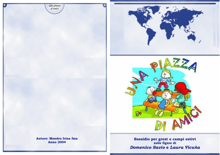 Una piazza Una piazza di amici di amici Una piazza di amici 40 1 Autore: Mandro Irina fma Anno 2004 Sussidio per grest e campi estivi sulle figure di Domenico Savio e Laura Vicuña Una piazza di amici Una piazza di amici 2 39 Una piazza di amici Una piazza di amici 38 3 al momento della preghiera quotidiana. Con la speranza di riuscire a mantenere queste promesse, Ti voglio dire ancora Grazie, Gesù, perché ci sei. a i r o t S a L 15°giorno Dal vangelo secondo Luca (17,11-19) 11 Durante il viaggio verso Gerusalemme, Gesù attraversò la Samaria e la Galilea. 12 Entrando in un villaggio, gli vennero incontro dieci lebbrosi i quali, fermatisi a distanza, 13alzarono la voce, dicendo: «Gesù maestro, abbi pietà di noi!». 14Appena li vide, Gesù disse: «Andate a presentarvi ai sacerdoti». E mentre essi andavano, furono sanati. 15Uno di loro, vedendosi guarito, tornò indietro lodando Dio a gran voce; 16e si gettò ai piedi di Gesù per ringraziarlo. Era un Samaritano. 17Ma Gesù osservò: «Non sono stati guariti tutti e dieci? E gli altri nove dove sono? 18Non si è trovato chi tornasse a render gloria a Dio, all'infuori di questo straniero?». E gli disse: 19«Alzati e và; la tua fede ti ha salvato!». Signore Gesù, nostro fratello, concedici di lodarTi e ringraziarTi per il dono di questo Grest; per il dono di tanti amici con i quali ci siamo impegnati e ci siamo divertiti. Grazie perché siamo cresciuti e grazie perché Tu ci hai accompagnato in questi giorni. Dacci occhi per poter cogliere la tua presenza fra noi, che ci guida e ci accompagna con cuore gioioso. Aiutaci a portare la nostra felicità a tutti coloro che ci circondano perché il nostro ambiente diventi sempre più umano e accogliente. Grazie Signore, sei proprio nostro amico e nostro fratello. RIASSUNTO Ci sono tre amici (Davide, Gigi e Federica) che, finita la scuola, cominciano a ritrovarsi durante l’estate, nella piazza di un paesino della Valle d’Aosta. Un giorno arriva in paese un nuovo ragazzo, Mimmo, che si inserisce nel gruppetto di amici e con loro vive diverse avventure. Un giorno Davide, riceve una telefonata al suo cell. E conosce così una ragazza argentina, Laura, che racconterà ai ragazzi alcune cose che le capitano. Le avventure che vengono raccontate ogni giorno sono riprese dalla vita di Domenico Savio (Mimmo) e di Laura Vicuña (Laura). Una piazza di amici Una piazza di amici 4 37 1^ Settimana Settimana dell’AMICIZIA 1°giorno Ormai le scuole sono finite e, come ogni estate, Davide ed i suoi amici (Federica e Gigi), cominciano a incontrarsi ogni giorno nella piazza del loro paese per divertirsi assieme. Davide è un ragazzo carino, con i capelli castani chiari e gli occhi azzurri. Ha 13 anni e la sua famiglia possiede un negozio nel paese vicino, perciò non ha mai fatto mancare niente a D., che è sempre vestito e accessoriato all’ultima moda. Federica ha i capelli lunghi, biondi. Ha 12 anni ed è la più piccola di 3 fratelli, perciò è sempre stata coccolata dai suoi. Gigi abita invece nel paese vicino, ma essendo compagno di classe di Davide, è diventato suo amico e i 2 sono inseparabili. Gigi ha i capelli castani a spazzola ed è esuberante, sempre allegro, molto vivo e soprattutto… curiosissimo. 2°giorno Un giorno, mentre i 3 amici si trovano come al solito seduti su una panchina della piazza a decidere cosa fare quel pomeriggio, Gigi dice: «Sapete che oggi, quando sono andato a prendere il pane, ho visto in panificio un ragazzo nuovo. E’ mingherlino, capelli scuri ed occhi marroni, non mi sembra di averlo mai visto prima. Probabilmente è uno dei tanti che vengono a passarsi le ferie da queste parti.» «E’ uno dei tanti – esclama Davide un po’ rabbioso – che vengono qui per un periodo durante l’estate e che vuole sentirsi padrone a casa nostra.» «E’ arrivata l’estate per tutti. – afferma Federica con grazia – Anche loro hanno il diritto di riposarsi dove vogliono. Non essere così cattivo nei loro confronti, Davide.» «Questo ragazzo non mi sembra come tutti gli altri. – riprende Gigi – Ha qualcosa di diverso che non so spiegare, è come se mi avesse messo dentro un senso di meno falsità tra piccoli e grandi: tutti questi "meno", Signore, sono altrettanti ostacoli in meno sulla strada della felicità! Più comprensione verso gli altri, più amore nel mondo, più condivisione con i poveri, più verità nel nostro parlare con gli altri, tutti questi "più", Signore, sono dei passi in più sulla strada verso la felicità! Tu, Signore, lavori con noi e cerchi collaboratori come Maria, tua Madre, come gli Apostoli, come Domenico Savio e Laura Vicuña, che ha scoperto che “c’è più gioia nel dare che nel ricevere”. 14°giorno Dal Vangelo secondo Marco (16,15-20) 15Gesù disse loro: “Andate in tutto il mondo e predicate il vangelo ad ogni creatura. 16Chi crederà e sarà battezzato sarà salvo, ma chi non crederà sarà condannato. 17E questi saranno i segni che accompagneranno quelli che credono: nel mio nome scacceranno i demòni, parleranno lingue nuove, 18 prenderanno in mano i serpenti e, se berranno qualche veleno, non recherà loro danno, imporranno le mani ai malati e questi guariranno”. 19Il Signore Gesù, dopo aver parlato con loro, fu assunto in cielo e sedette alla destra di Dio. 20Allora essi partirono e predicarono dappertutto, mentre il Signore operava insieme con loro e confermava la parola con i prodigi che l’accompagnavano. In questi giorni, Signore, Tu mi sei stato vicino più che mai, ed io ne sono felice. Mi hai illuminato con la Tua luce, mi hai scaldato con il Tuo affetto, mi hai fatto sentire voluto con la Tua accoglienza. Di questo non ti posso che dire un immenso grazie. Mi vedrai più attento a Te, alla Tua Parola, all’entrata nella Tua casa, Una piazza di amici Una piazza di amici 36 5 rifonderò il debito. 30Ma egli non volle esaudirlo, andò e lo fece gettare in carcere, fino a che non avesse pagato il debito.