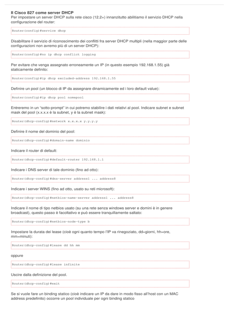 Il Cisco 827 come server DHCP Per impostare un server DHCP sulla rete cisco (12.2+) innanzitutto abilitiamo il servizio DHCP nella configurazione del router: Router(config)#service dhcp Disabilitare il servizio di riconoscimento dei conflitti fra server DHCP multipli (nella maggior parte delle configurazioni non avremo più di un server DHCP): Router(config)#no ip dhcp conflict logging Per evitare che venga assegnato erroneamente un IP (in questo esempio 192.168.1.55) già staticamente definito: Router(config)#ip dhcp excluded-address 192.168.1.55 Definire un pool (un blocco di IP da assegnare dinamicamente ed i loro default value): Router(config)#ip dhcp pool nomepool Entreremo in un “sotto-prompt” in cui potremo stabilire i dati relativi al pool. Indicare subnet e subnet mask del pool (x.x.x.x è la subnet, y è la subnet mask): Router(dhcp-config)#network x.x.x.x y.y.y.y Definire il nome del dominio del pool: Router(dhcp-config)#domain-name dominio Indicare il router di default: Router(dhcp-config)#default-router 192.168.1.1 Indicare i DNS server di tale dominio (fino ad otto): Router(dhcp-config)#dns-server address1 ... address8 Indicare i server WINS (fino ad otto, usato su reti microsoft): Router(dhcp-config)#netbios-name-server address1 ... address8 Indicare il nome di tipo netbios usato (su una rete senza windows server e domini è in genere broadcast), questo passo è facoltativo e può essere tranquillamente saltato: Router(dhcp-config)#netbios-node-type b Impostare la durata dei lease (cioè ogni quanto tempo l’IP va rinegoziato, dd=giorni, hh=ore, mm=minuti): Router(dhcp-config)#lease dd hh mm oppure Router(dhcp-config)#lease infinite Uscire dalla definizione del pool. Router(dhcp-config)#exit Se si vuole fare un binding statico (cioè indicare un IP da dare in modo fisso all’host con un MAC address predefinito) occorre un pool individuale per ogni binding statico Router(cnfig)#ip dhcp pool nomepool Indicare la subnet e la subnet mask (come sopra): Router(dhcp-config)#network x.x.x.x y.y.y.y (opzionale) Indicare il tipo di piattaforma, i possibili valori sonoieee802 o ethernet, ma per noi è sempre il default (ethernet);questa parte può essere quindi saltata Router(dhcp-config)#hardware-address ethernet Indicare il MAC address (xx.xxxx.xxxx.xx) del client, yy è 01 per Ethernet e 06 per ieee802: Router(dhcp-config)#client-identifier yyxx.xxxx.xxxx.xx (opzionale) Indicare il nome del client: Router(dhcp-config)#client-name nome Uscire dalla definizione del pool: Router(dhcp-config)#exit Nel caso di DHCP multipli e reti congestionate o molto lente per evitare conflitti è utile alzare il numero (x) di ping da fare per verificare che l’IP non sia già utilizzato, impostando il ping a zero invece non viene effettuato nessun controllo preventivo sull’assegnamento. In generale per gli usi “domestici” evitare il controllo è abbastanza “sicuro”, a patto di non dover fare i conti con gente che assegna staticamente (ed indiscriminatamente) gli IP alle macchine. Router(config)#ip dhcp ping packets x Anche il tempo di timeout (mm) può essere cambiato in base alle necessità (è in millisecondi): Router(config)#ip dhcp timeout mm Per ulteriori informazioni su come impostare il DHCP sui router Cisco in genere potete consultare http://www.cisco.com/en/US/products/sw/iosswrel/ps1835/products_configuration_guide_chapter09186a00800