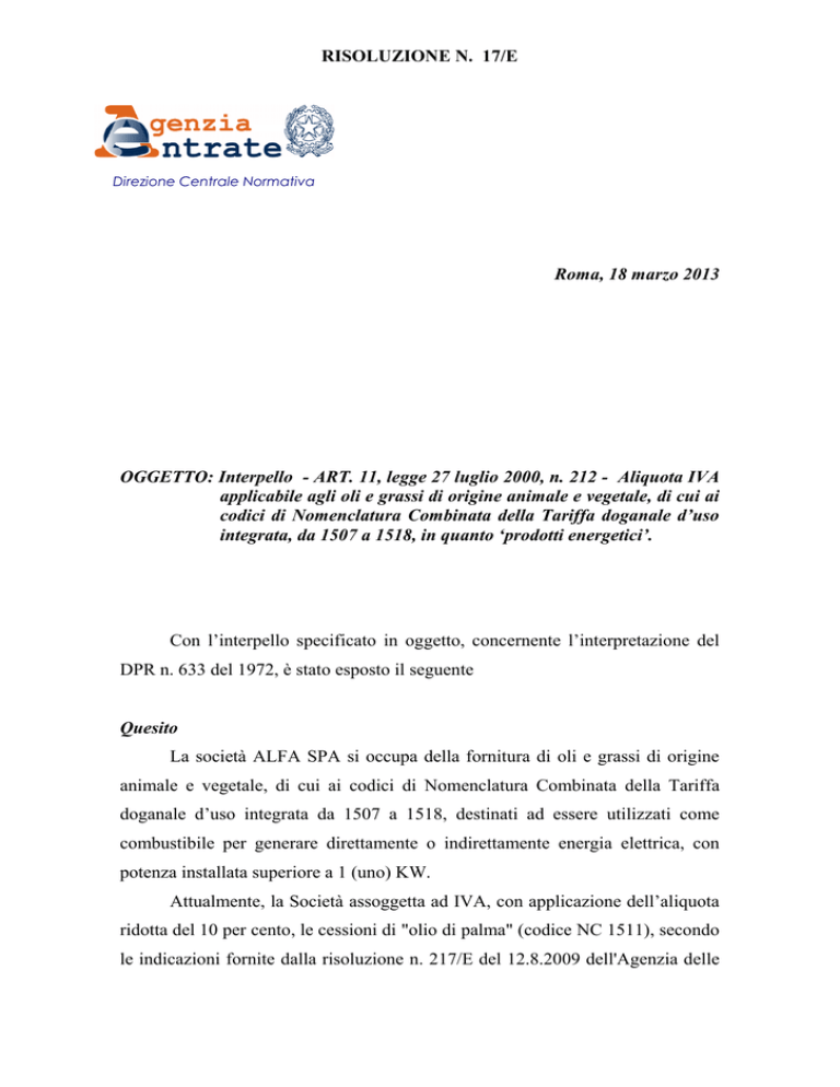 RISOLUZIONE N. 17/E Direzione Centrale Normativa Roma, 18 marzo 2013 OGGETTO: Interpello - ART. 11, legge 27 luglio 2000, n. 212 - Aliquota IVA applicabile agli oli e grassi di origine animale e vegetale, di cui ai codici di Nomenclatura Combinata della Tariffa doganale d’uso integrata, da 1507 a 1518, in quanto ‘prodotti energetici’. Con l’interpello specificato in oggetto, concernente l’interpretazione del DPR n. 633 del 1972, è stato esposto il seguente Quesito La società ALFA SPA si occupa della fornitura di oli e grassi di origine animale e vegetale, di cui ai codici di Nomenclatura Combinata della Tariffa doganale d’uso integrata da 1507 a 1518, destinati ad essere utilizzati come combustibile per generare direttamente o indirettamente energia elettrica, con potenza installata superiore a 1 (uno) KW. Attualmente, la Società assoggetta ad IVA, con applicazione dell’aliquota ridotta del 10 per cento, le cessioni di "olio di palma" (codice NC 1511), secondo le indicazioni fornite dalla risoluzione n. 217/E del 12.8.2009 dell'Agenzia delle 2 Entrate, [mentre assoggetta ad IVA, con applicazione dell’aliquota ordinaria del 21 per cento, i “grassi ed oli animali o vegetali” (codice NC 1518)], stante quanto previsto dal punto 104 della Tabella A, Parte III, allegata al DPR 633/72 che prevede l'aliquota IVA del 10 per cento per le sole cessioni di "oli combustibili ed estratti aromatici impiegati per generare, direttamente o indirettamente, energia elettrica, purché la potenza installata non sia inferiore ad 1KW". Tutto ciò premesso, la società istante, ai fini dell'applicazione dell’aliquota ridotta del 10 per cento, chiede di poter equiparare tutti i prodotti di cui ai codici di nomenclatura combinata da 1507 a 1518 agli oli combustibili indicati al n. 104 della Tabella A, parte III, allegata al DPR 633 del 1972. Soluzione interpretativa prospettata dal contribuente La società istante, mutuando quanto affermato dall'Agenzia delle Dogane nella nota 95159 del 17/7/2009 (cfr. risoluzione dell'Agenzia delle Entrate n. 217/E del 12/8/2009), con riferimento all'olio di palma, ritiene che analoghe considerazioni possano essere svolte anche per tutti gli altri prodotti di cui ai codici di NC da 1507 a 1518, espressamente richiamati dalla lettera a) dell'articolo 21 del D.Lgs. 504/1995, utilizzati come combustibile per la produzione di energia elettrica. Al riguardo, la citata risoluzione ha infatti affermato che "l'olio di palma utilizzato come olio combustibile per generare energia elettrica in un impianto avente una potenza installata superiore ad 1 (uno) Kw sia equiparabile agli oli indicati al numero 104 della Parte III della Tabella A allegata al DPR n. 633 del 1972, per cui alla cessione dello stesso, così come all'estrazione da un deposito IVA di cui al citato articolo 50-bis del decreto-legge n. 331 del 1993, è applicabile l'aliquota IVA ridotta del 10 per cento". Tutto ciò premesso, la società istante ritiene che la fornitura di oli e grassi vegetali non modificati chimicamente (codici di NC da 1507 a 1515) e di grassi ed oli animali o vegetali specificatamente ricompresi dalle classi da NC 1516 a 1518, nei confronti dei propri clienti, che utilizzino tali prodotti come 3 combustibili per generare energia elettrica in impianti aventi una potenza installata superiore ad 1 (uno) Kw (previa apposita dichiarazione in merito), vada fatturata applicando l’aliquota agevolata del 10 per cento, ai sensi del disposto del numero 104 della Parte III della Tabella A allegata al DPR n. 633 del 1972. Ritiene inoltre di poter procedere, ai sensi dell'art. 26, terzo comma, del DPR 633/1972, all’emissione di note di variazione dell’IVA versata con riferimento alle operazioni eventualmente effettuate nel corso dei dodici mesi precedenti. Parere dell’Agenzia delle entrate Il numero 104 della Tabella A, Parte III, allegata al DPR n. 633 del 1972, prevede, tra l’altro, l’applicazione dell’aliquota IVA ridotta del 10 per cento alla cessione di “oli minerali greggi, oli combustibili ed estratti aromatici impiegati per generare, direttamente o indirettamente, energia elettrica, purché la potenza installata non sia inferiore ad 1 Kw”. In proposito, la risoluzione n. 217 del 2009 ha specificato, con riferimento all'olio di palma (codice NC 1511) utilizzato come olio combustibile per generare energia elettrica in un impianto avente una potenza installata superiore ad 1 (uno) Kw, che lo stesso è equiparabile agli oli indicati al numero 104 della Parte III della Tabella A allegata al DPR n. 633 del 1972, per cui alla relativa cessione dello stesso è applicabile l'aliquota IVA ridotta del 10 per cento. La soluzione si fonda sul parere tecnico emesso dall’Agenzia delle Dogane con la nota 95159 del 17 luglio 2009, integralmente riportato nella risoluzione cui si rinvia. Tale nota, per quel che qui rileva, ha evidenziato che, per effetto del recepimento della direttiva 2003/96/CE (concernente la tassazione dei prodotti energetici e dell’elettricità), il D.Lgs. 2.2.2007 n. 26 ha apportato numerose modifiche al Testo Unico delle imposte sulla produzione e sui consumi (D.Lgs. 26.10.1995 n. 504), disponendo, tra l’altro, la sostituzione delle parole "oli minerali" con "prodotti energetici" e la modifica dell'articolo 21, rubricato "Prodotti soggetti ad accisa", che riporta ora l'elencazione dei prodotti 4 energetici, tra i quali sono ricompresi, alla lettera a), i prodotti "di cui ai codici NC da 1507 a 1518", se destinati a essere utilizzati come combustibile per riscaldamento o come carburante per motori. Il successivo comma 9 dell'articolo 21 citato prevede altresì che "i prodotti energetici di cui al comma 1, qualora siano utilizzati per la produzione di energia elettrica, sono sottoposti ad accisa per motivi di politica ambientale, con l'applicazione delle aliquote stabilite nella tabella A". L’Agenzia delle Dogane, ha precisato dunque che, sotto il profilo