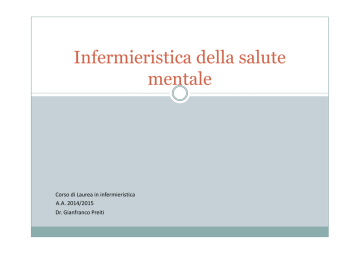 Infermieristica della salute mentale Corso di Laurea in infermieristica A.A. 2014/2015 Dr. Gianfranco Preiti Assistenza Infermieristica nei disturbi d’ansia ANSIA: sentimento penoso che invade tutto l’individuo con un vissuto di minaccia e pericolo incombente, che pone il soggetto in uno stato di allerta e tensione generalizzata ESPERIENZA CHE OGNUNO DI NOI HA PROVATO NELLA VITA ANSIA FISIOLOGICA: S T I M O L O PER MIGLIORARE LE PRESTAZIONI Ansia patologica: insorge in assenza di minaccia oggettiva oppure assume un’entità sproporzionata rispetto al pericolo causando grave sofferenza e blocco delle risorse ANSIA o NEVROSI D’ANSIA Buon contatto con la realtà Consapevolezza di malattia: riconosce i vissuti o comportamenti come disturbi Buon livello di comunicazione Mantiene adattamento sociale Disturbi d’ansia Disturbo d’ansia generalizzato Attacchi di panico e fobie Disturbo ossessivo – compulsivo Disturbo da stress post traumatico Disturbo d’ansia generalizzata Quadro clinico: Apprensività immotivata o eccessiva Sensazione di confusione Difficoltà di concentrazione Tensione diffusa Sonno disturbato Manifestazioni somatiche Irritabilità Disturbo d’ansia generalizzata: Diagnosi Infermieristiche Ansia: senso di turbamento (apprensione), unito all’attivazione del sistema nervoso autonomo, in risposta ad una minaccia vaga ed immotivata Correlata a minaccia reale o presunta al concetto di sé secondaria a: Perdita di cose ritenute importanti Modificazioni dello status e del prestigio Fallimento Gravidanza Ruolo genitoriale Cambiamenti legati al pensionamento Correlata a perdita reale o percepita di persone significative secondaria a: Morte Divorzio Disoccupazione Disturbo d’ansia generalizzata: Diagnosi Infermieristiche CARATTERISTICHE DEFINENTI Fisiche EMOZIONALI Cognitive •Insonnia •Aumento della frequenza cardiaca •Pressione arteriosa elevata •Aumento della frequenza respiratoria •Sudorazione •Affaticamento e astenia •Dolore (torace e collo) •Agitazione •Palpitazione •Apprensione •Senso di impotenza •Mancanza di fiducia in sé •Tensione o agitazione •Incapacità a rilassarsi •Irritabilità/impazienza •Pianto •Atteggiamento di critica verso sé e gli altri •Chiusura in sé •Mancanza di iniziative •Disapprovazione nei propri confronti •Incapacità di concentrarsi •Dimenticanze •Tendenza a rimuginare •Scarsa consapevolezza dell’ambiente •Orientamento al passato piuttosto che al futuro Disturbo d’ansia generalizzata Assistenza: Atteggiamento calmo, comprensivo e rassicurante, • aiutarlo a riconoscere l’ansia ed i fattori scatenanti • Rispetto • Disponibilità all’ascolto • Correttezza e professionalità • Attenzione al contesto familiare • Prevenire la manipolazione terapeutica (abuso/rifiuto) e nomadismo terapeutico • Favorire l’acquisizione di metodi di adattamento allo stress per bloccare l’ansia • Disturbo d’ansia generalizzata Trattamento : Terapia farmacologica • Ansiolitici (benzodiazepine). Efficaci, relativamente sicuri, abuso, dipendenza • • Neurolettici Antidepressivi Psicoterapia Attacchi di panico Quadro clinico: Tachicardia con dispnea Senso di costrizione al torace, dolori precordiali Formicolii alle estremità Sudorazioni, fenomeni neurovegetativi Tremori Vertigini, testa confusa, sbandamento Paura di svenire, perdere il controllo di sé Incapacità di proseguire ogni attività Attacchi di panico Insorgenza improvvisa Senza causa scatenante Durata tra i 20 minuti /2 ore Stato discreto tra una crisi e l’altra (minima depressione o ansia) Paura di uscire (segno e sintomo dell’ansia grave) Attacchi di panico Assistenza: Atteggiamento calmo, fermo Allontanare le persone intorno Rassicurare sull’incolumità e guarigione Attenzione al controllo dell’ansia Assicurare la sicurezza personale Aiutare ad individuare precocemente i segni premonitori e risposte alternative Desensibilizzare il paziente alla situazione o all’oggetto colpevole del panico Educare i familiari ad aiutare il congiunto Attacchi di panico Trattamento : Terapia farmacologica • • Antidepressivi triciclici Antidepressivi serotoninergici a piccole dosi Fobie Sentimento spiacevole di paura nei confronti di qualcosa di per sé innocuo o che non rappresenta un pericolo paragonato alla paura Quadro clinico: Ansia anticipatoria Condotte di evitamento con le quali si protegge dal manifestarsi dell’angoscia (diagnosi differenziale tra fobia e ossessione) Fobie Manifestazioni dell’ansia fobica: Vissuto di minaccia: timore di aggressioni, inerzia di fronte a eventi incontrollabili Vissuti di contagio e di contaminazione: fobie per le malattie, sporco (possono portare ai disturbi ossessivo - compulsivo) Vissuti di repulsione: fobie per piccoli animali (topi, ragni ..) Vissuti di disgusto: ansia di contaminazione, impurità (sangue, ferite, atti sessuali..).Implicazioni relazionali Vissuti di soffocamento: sentimenti di costrizione e impotenza (claustrofobia, agarofobia) Fobie Assistenza: Atteggiamento calmo, fermo, rassicurante per governare l’ansia anticipatoria Educare il paziente a riconoscere la fobia e fermare le condotte di evitamento Individuare risposte alternative (rilassamento, comportamenti di controllo) Sostenere il paziente nel programma di desensibilizzazione alla situazione o all’oggetto scatenante la fobia Fobie Trattamento : Terapia farmacologica • • • Benzodiazepine Antidepressivi triciclici Tecniche comportamentiste: esposizione allo stimolo fobico Disturbo ossessivo - compulsivo Quadro clinico: Ossessioni: pensieri, immagini, ricordi, impulsi, dubbi che si impongono al soggetto in modo coercitivo, intrusivo e ricorrente Compulsioni: comportamenti, eseguiti secondo schemi prefissati e ripetitivi, che il soggetto si sente costretto a mettere in atto, senza desiderarlo Gli atti compulsivi (rituali o cerimoniali) sono la risposta ad una ossessione, leniscono l’angoscia ma ost