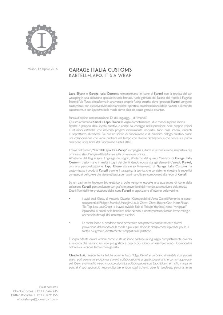 Milano, 12 Aprile 2016 GARAGE ITALIA CUSTOMS KARTELL+LAPO. IT’s A WRAP Lapo Elkann e Garage Italia Customs reinterpretano le icone di Kartell con la tecnica del car wrapping in una collezione speciale in serie limitata. Nelle giornate del Salone del Mobile il Flagship Store di Via Turati si trasforma in una vera e propria fucina creativa dove i prodotti Kartell vengono customizzati con esclusive rivisitazioni artistiche, ispirate ai colori tradizionali delle Nazioni e al mondo automotive, e con i pattern della moda come pied de poule, gessato e tartan. Parola d’ordine: contaminazione. Di stili, linguaggi… di “mondi”. Questo accomuna Kartell a Lapo Elkann: la voglia di contaminare i due mondi in piena libertà. Perché è proprio dalla libertà creativa e anche dal coraggio nell’espressione delle proprie visioni e intuizioni estetiche, che nascono progetti radicalmente innovativi, fuori dagli schemi, vincenti e, soprattutto, divertenti. Da questo spirito di condivisione e di disinibito dialogo creativo nasce una collaborazione che vuole protrarsi nel tempo con diverse declinazioni e che con la sua prima collezione ispira l’idea del Fuorisalone Kartell 2016. Il tema dell’evento, “Kartell+Lapo. It’s aWrap”, campeggia su tutte le vetrine e viene associato a pay off incentrati sull’artigianalità italiana e sulla dimensione onirica. All’interno del Flag si apre il “garage dei sogni”, all’interno del quale i Maestros di Garage Italia Customs trasformano in realtà i sogni dei clienti, dando nuova vita agli elementi d’arredo Kartell, con una personalizzazione. Lapo Elkann attraverso l’intervento di Garage Italia Customs ha customizzato i prodotti Kartell tramite il wrapping, la tecnica che consiste nel rivestire le superfici con speciali pellicole e che viene utilizzata per la prima volta sui componenti d’arredo di Kartell. Su un pavimento linoleum blu elettrico a bolle vengono esposte una quarantina di icone della collezione Kartell, personalizzate con grafiche provenienti dal mondo automotive e della moda. Due i filoni dell’interpretazione delle icone Kartell in esposizione all’interno delle vetrine: • i tavoli ovali Glossy di Antonio Citterio, i Componibili di Anna Castelli Ferrieri o le icone trasparenti di Philippe Starck (Uncle Jim, Louis Ghost, Ghost Buster, One More Please, Tip Top, Lou Lou Ghost o i tavoli Invisible Side di Tokujin Yoshioka) sono “wrappati” ispirandosi ai colori delle bandiere delle Nazioni e reinterpretano famose livree racing o anche solo dettagli dei loro motivi e colori. • Le stesse icone di prodotto sono presentate con pattern completamente diversi provenienti dal mondo della moda e più legati al textile design come il pied de poule, il tartan o il gessato, direttamente wrappati sulle plastiche. È sorprendente quindi vedere come le stesse icone parlino un linguaggio completamente diverso a seconda che vestano un look più grafico e pop o più sobrio: un esempio sono i Componibili nell’ironica versione bicolor o in gessato. Claudio Luti, Presidente Kartell, ha commentato: “Oggi Kartell è un brand di lifestyle così globale che si può permettere di portare avanti collaborazioni e progetti speciali anche con un approccio più libero e disinvolto verso i suoi prodotti. La collaborazione con Lapo Elkann è molto intrigante perché il suo approccio imprenditoriale è fuori dagli schemi, oltre le tendenze, genuinamente Press contacts Roberto Corona +39 335.5267246 Matteo Boccolini + 39 333.8594156 [email protected] Milano, 12 Aprile 2016 GARAGE ITALIA CUSTOMS KARTELL+LAPO. IT’s A WRAP creativo e supportato da grandi intuizioni commerciali. E la combinazione delle due creatività Lapo e Kartell fa scaturire nuove opportunità di evoluzione del concetto stesso di prodotto industriale personalizzato. Oggi i consumatori vogliono sentirsi sempre più parte integrante dei loro acquisti guidandoli a monte da un punto di vista creativo (dall’auto, alla casa, all’arredo). Ho trovato particolarmente stimolante fare interpretare le nostre icone con nuovi pattern e colori in limited edition e penso che questa collezione possa essere un nuovo modo di interpretare le potenzialità dei prodotti Kartell, anche se sempre in linea con il nostro approccio industriale”. Lapo Elkann, aggiunge: “Quando ho creato Garage Italia Customs sapevo che il nostro obiettivo non era quello di limitare la personalizzazione al mondo automotive, ma di traslare il suo potenziale creativo in molti altri settori. Per la nostra prima contaminazione con il mondo dell’arredamento e del design non potevamo trovare un partner migliore di Kartell. Azienda simbolo di progettualità creata e concepita in Italia, Kartell ha al suo attivo vere e proprie icone del design contemporaneo oltre a condividere con Garage Italia Customs una ricerca di continua sperimentazione e innovazione, coniugata all’uso di tecnologie avanzate. La perfetta sinergia che si è creata tra le nostre due realtà ha permesso di fondere design, auto e lifestyle in elementi d’arredo fuori da ogni schema, con una nuova ed unica personalità”. L’insieme dei progetti dà vita dunque ad una collaborazione che avrà continuità nel tempo e che esordisce con una prima collezione in vendita da settembre a dicembre in edizione limitata nei negozi Kartell e on line sul sito Kartell.com. 13-16 Aprile dalle 10 alle 21 domenica 17 Aprile dalle 11 alle 19 Press preview 12/04 ore 18.00 Cocktail 12/04 solo su invito dalle 19.00 Kartell Flagship Store Via Turati ang. Via Carlo Porta, 1 - Milano Per maggiori informazioni Ufficio Stampa Garage Italia Customs – Burner Communication [email protected] Tel. 02 400 30 746 www.garageitaliacustoms.com Ufficio stampa Kartell [email protected] Tel. 02 900 12 268 www.kartell.com Press contacts Roberto Corona +39 335.5267246 Matteo Boccolini + 39 333.8594156 [email protected] Milano, 12 Aprile 2016 GARAGE ITALIA CUSTOMS KARTELL+LAPO. IT’s A WRAP