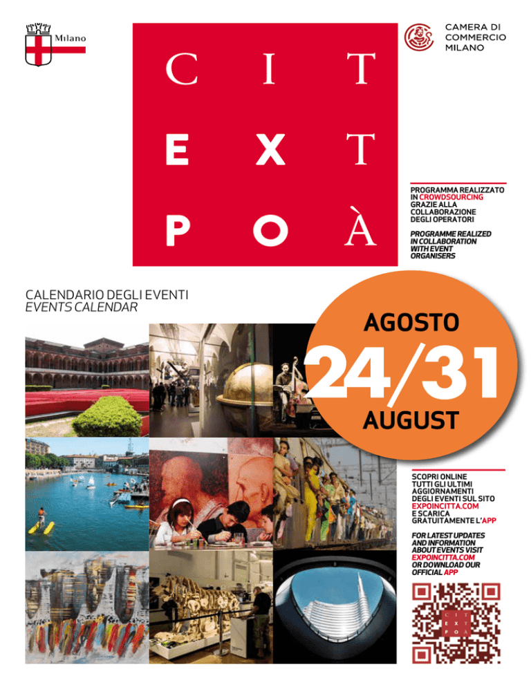 PROGRAMMA REALIZZATO IN CROWDSOURCING GRAZIE ALLA COLLABORAZIONE DEGLI OPERATORI PROGRAMME REALIZED IN COLLABORATION WITH EVENT ORGANISERS CALENDARIO DEGLI EVENTI EVENTS CALENDAR AGOSTO 24/31 AUGUST SCOPRI ONLINE TUTTI GLI ULTIMI AGGIORNAMENTI DEGLI EVENTI SUL SITO EXPOINCITTA.COM E SCARICA GRATUITAMENTE L’APP FOR LATEST UPDATES AND INFORMATION ABOUT EVENTS VISIT EXPOINCITTA.COM OR DOWNLOAD OUR OFFICIAL APP Agosto finisce ma ExpoinCittà continua! August is over but ExpoinCittà continues! ExpoinCittà è il progetto di Comune e Camera di Commercio che coordina, incentiva e promuove l’offerta di eventi che avranno luogo all’interno dell’area metropolitana tra il 1° maggio e il 31 ottobre: un grande cartellone in cui si succederanno migliaia di appuntamenti, scanditi mese dopo mese da sei icone artistiche della città e suddivisi in dieci keywords, per una proposta multidisciplinare senza precedenti e in continuo arricchimento, realizzata grazie alle energie di tutti i promotori delle iniziative. Queste pagine rappresentano una “bussola” per orientarsi nella vastità di un’offerta che abbraccia l’intera città e l’area extra urbana: dai concerti agli eventi di moda e design, dalle mostre agli show cooking passando per lo sport, gli spettacoli nei teatri e le attività per i più piccoli, Milano si scopre ancor più attraente e pronta ad accogliere il mondo. Milano, a place to BE. ExpoinCittà is a project managed by Milan Municipality and Milan Chamber of Commerce which coordinates and promotes all the events which will take place within the metropolitan area from 1 May to 31 October. Over the six months of the Exposition thousands of events will take place, following a narrative path composed of six artistic symbols of the city and subdivided in ten keywords, offering an unprecedented programme that has been made possible thanks to the energy of all of the stakeholders involved and still keeps growing. ExpoinCittà calendar will be your “compass”, guiding you through a multitude of experiences in Milan metropolitan area. From open air concerts to theatrical productions, from art exhibitions to show cooking, sport events and activities for younger visitors, Milan is more enticing than ever, and more than ever ready to welcome the world. Milano, a place to BE. IL CALENDARIO Questo programma completo e dettagliato è stato realizzato in crowdsourcing grazie alle informazioni che i diversi organizzatori dei singoli eventi hanno inserito sul portale expoincitta. com relativamente alle proprie iniziative; date, luoghi e orari potrebbero pertanto subire variazioni indipendenti dalla nostra responsabilità. EXPOINCITTÀ CALENDAR It is a comprehensive and detailed programme created thanks to all event organisers around Milan. They registerd on expoincitta.com and provided us with information regarding their events. Please note that locations, dates and times may vary due to reasons beyond our control. GLI AGGIORNAMENTI Consulta il calendario online o scarica l’app ExpoinCittà per essere sempre aggiornato in tempo reale sull’evoluzione o le possibili modifiche degli eventi in programma. UPDATES Check out our online calendar or download ExpoinCittà official app for the latest updates. Un’altra estate sta finendo, ma non finisce il divertimento con #ExpoinCittà! Si parte con un invito particolare, A cena con il principe: al Museo del Castello Sforzesco fasti e musiche, suonate con gli strumenti progettati da Leonardo realizzati per l’occasione! Voglia di paesi lontani? Alle Ex Officine Comunali, con l’israeliana Vertigo Dance Company, o alla Pinacoteca Ambrosiana con Dialogues by Ai Jing, dove le opere dell’artista cinese dialogano con i capolavori della Pinacoteca. Tanti appuntamenti con il cinema, un po’ dappertutto: nei luoghi tradizionali come il MIC - Museo Interattivo del Cinema e lo Spazio Oberdan, ma anche al Nuovo Cinema Rovello del Piccolo Teatro o all’Estathè Market Sound con la sua rassegna all’aperto, e all’ExpoinCittà Lounge con una selezione vintage! A Palazzo Reale inaugurazione della mostra La Grande Madre a cura di Massiliano Gioni. Domenica, il caratteristico Mercatone dell’Antiquariato per Expo sui Navigli. Per i musicofili, all’Edison Open Garden, Alexi Murdoch. In cerca di qualcosa per i piccoli? Children Design Week by ADI, Kids Lab Ekeko al Mudec e Spazio 0-3, 4-8 o 9-12 a Vaprio D’Adda! E allora… buona settimana a #MilanoaplacetoBE! GUIDA ALLA LETTURA Il programma comprende, per ogni giorno, due sezioni: Opening del giorno elenca gli eventi che iniziano nel giorno stesso e proseguono nei successivi; Gli appuntamenti del giorno riporta invece le attività che si svolgono esclusivamente in quella giornata. Gli eventi già in corso durante il periodo di riferimento del calendario sono invece inclusi nell’apposita sezione che precede il primo giorno del calendario. Another summer draws to a close, but entertainment and fun continue with #ExpoinCittà! Let’s start with a unique invite, A dinner with the Prince. At Castello Sforzesco Museum music and dances are organised using instruments designed by Leonardo! Longing for a trip to an exotic country? Try Ex Officine Comunali, Vertigo Dance Company, an Israeli theatre company that takes us to another dimension! You may also want to visit Dialogues by Ai Jing at Pinacoteca Ambrosiana, an extraordinary exhibition where artworks by the Chinese artist dialogue with masterpieces from the Pinacoteca, going beyond time and space. There will be many appointments with cinema too! You will find them at MIC Museo Interattivo del Cinema and Spazio Oberdan, but also at Nuovo Cinema Rovello by Piccolo Teatro or at ExpoinCittà Lounge with vintage films! Palazzo Reale inaugurates exhibition La Grande Madre, curated by Massiliano Gioni. Moreover, on Sunday don’t miss Mercatone dell’Antiquariato per Expo in Navigli district. If you love music, at Edison Open Garden plays Alexi Murdoch.