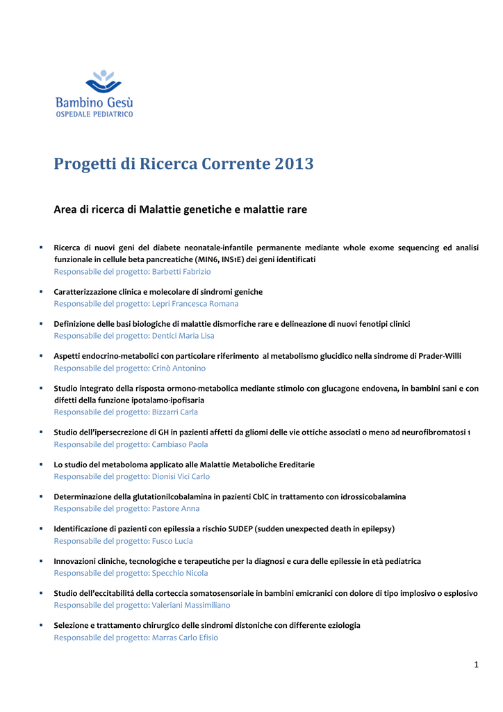 Progetti di Ricerca Corrente 2013 Area di ricerca di Malattie genetiche e malattie rare Ricerca di nuovi geni del diabete neonatale‐infantile permanente mediante whole exome sequencing ed analisi funzionale in cellule beta pancreatiche (MIN6, INS1E) dei geni identificati Responsabile del progetto: Barbetti Fabrizio Caratterizzazione clinica e molecolare di sindromi geniche Responsabile del progetto: Lepri Francesca Romana Definizione delle basi biologiche di malattie dismorfiche rare e delineazione di nuovi fenotipi clinici Responsabile del progetto: Dentici Maria Lisa Aspetti endocrino‐metabolici con particolare riferimento al metabolismo glucidico nella sindrome di Prader‐Willi Responsabile del progetto: Crinò Antonino Studio integrato della risposta ormono‐metabolica mediante stimolo con glucagone endovena, in bambini sani e con difetti della funzione ipotalamo‐ipofisaria Responsabile del progetto: Bizzarri Carla Studio dell’ipersecrezione di GH in pazienti affetti da gliomi delle vie ottiche associati o meno ad neurofibromatosi 1 Responsabile del progetto: Cambiaso Paola Lo studio del metaboloma applicato alle Malattie Metaboliche Ereditarie Responsabile del progetto: Dionisi Vici Carlo Determinazione della glutationilcobalamina in pazienti CblC in trattamento con idrossicobalamina Responsabile del progetto: Pastore Anna Identificazione di pazienti con epilessia a rischio SUDEP (sudden unexpected death in epilepsy) Responsabile del progetto: Fusco Lucia Innovazioni cliniche, tecnologiche e terapeutiche per la diagnosi e cura delle epilessie in età pediatrica Responsabile del progetto: Specchio Nicola Studio dell’eccitabilitá della corteccia somatosensoriale in bambini emicranici con dolore di tipo implosivo o esplosivo Responsabile del progetto: Valeriani Massimiliano Selezione e trattamento chirurgico delle sindromi distoniche con differente eziologia Responsabile del progetto: Marras Carlo Efisio 1 Determinanti molecolari delle malattie neurodegenerative Responsabile del progetto: Bertini Enrico Silvio Screening di farmaci per il trattamento terapeutico della cistinosi nefropatica Responsabile del progetto: Emma Francesco Valutazione del rischio di sviluppo di anticorpi citossici donatore specifici nel bambino portatore di trapianto renale dopo vaccinazione antiinfluenzale Responsabile del progetto: Dello Strologo Luca L’ipotermia indotta dalla terapia dialitica continua (CRRT) nel paziente pediatrico critico di peso molto basso Responsabile del progetto: Picca Stefano Malattia Policistica Autosomica Dominante (ADPKD) in età pediatrica: indagine di prevalenza per ipertensione arteriosa Responsabile del progetto: Massella Laura Glomerulopatie immunomediate: studio di marker prognostici e diagnostici Responsabile del progetto: Vivarelli Marina Studio morfologico e microbiochimico del glicogeno nel Carcinoma Epatocellulare Responsabile del progetto: Callea Francesco Valutazione funzionale in pazienti affetti da patologia neuromuscolare Responsabile del progetto: Cutrera Renato Genodermatosi: patogenesi molecolare, diagnosi e correlazioni genotipo‐fenotipo Responsabile del progetto: El Hachem May Diagnosi molecolare della malattia di Wilson: nuove modalità d’analisi del gene ATP7B Responsabile del progetto: Francalanci Paola Studio integrato del metagenoma e del metaproteoma in patologie pediatriche associate ad alterazioni del microbiota intestinale Responsabile del progetto: Putignani Lorenza Implementazione di Orphanet e sviluppo di altre applicazioni Responsabile del progetto: Mingarelli Rita Dyscerne e RDDR: Network elettronici per la diagnosi e la presa in carico di difetti congeniti e sindromi dismorfiche Responsabile del progetto: Dentici Maria Lisa Creazione di un archivio competente per il confronto di immagini istologiche. Microscopia in rete (MIR) Responsabile del progetto: Callea Francesco Il ruolo emergente della proteomica traslazionale nello studio e nella diagnostica delle malattie infettive Responsabile del progetto: Putignani Lorenza 2 Area di ricerca di Malattie multifattoriali e fenotipi complessi Danno polmonare dopo interventi cardiochirurgici in circolazione extracorporea Responsabile del progetto: Cogo Paola Procedure ibride nel trattamento delle cardiopatie congenite complesse Responsabile del progetto: Guccione Paolo Caratterizzazione microbiologica delle infezioni da Bordetella spp in età pediatrica Responsabile del progetto: Tozzi Alberto Eugenio Sorveglianza sindromica attraverso Internet delle malattie acute respiratorie in età pediatrica Responsabile del progetto: Tozzi Alberto Eugenio La rigidità arteriosa quale indicatore precoce di disfunzione endoteliale in pazienti ad aumentato rischio cardiovascolare Responsabile del progetto: Manco Melania Lo studio delle abilità di apprendimento per osservazione nei Disturbi dello Sviluppo: protocolli di ricerca a confronto Responsabile del progetto: Vicari Stefano Danno epatico ed induzione del fenotipo pro‐fibrogenico e pro‐carcinogenico nella NAFLD: meccanismi molecolari in vitro ed in vivo Responsabile del progetto: Alisi Anna Eziopatogenesi della steatosi e della steatoepatite non alcoolica e della sindrome metabolica: analisi del ruolo dei fattori di genetici ed ambientali nel soggetto pediatrico Responsabile del progetto: Nobili Valerio Nuovi orizzonti terapeutici per la NAFLD nel soggetto pediatrico: trial e sperimentazione pre‐clinica Responsabile del progetto: Nobili Valerio Studio per l’utilizzo dei polimorfismi a singolo nucleotide (SNPs) e dei microRNA circolanti (miRNAs) quali potenziali nuovi biomarcatori diagnostici e/o prognostici di patologie pediatriche Responsabile del progetto: Masotti Andrea 3 Area di ricerca di Immunologia e farmacoterapia Strategie vaccinali per la prevenzione delle infezioni da batteri capsulati nei pazienti splenectomizzati e nei neonati Responsabile del progetto: Carsetti Rita Sviluppo di strategie di predizione delle poliendocrinopa