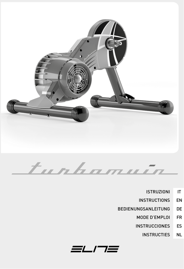 ISTRUZIONI IT INSTRUCTIONS EN BEDIENUNGSANLEITUNG DE MODE D’EMPLOI FR INSTRUCCIONES ES INSTRUCTIES NL A B C D H F G L I E A E D 1 2 C H G H B G 3 4 I 5 6 L I 7 8 9 10 11 12 F 13 14 0 mm 0 inch 15 16 6 mm 0,23 inch 3 mm 0,11 inch 17 18 NO 19 max 3 mm max 0,11 inch max 6 mm max 0,23 inch 20 D E 22 23 I I H H I H G 24 G 25 26 27 CLICK 28 29 x1 30 31 x1 32 33 IT - ITALIANO INTRODUZIONE AVVERTENZE GENERALI DI SICUREZZA DISCLAIMER NOME E LISTA DEI COMPONENTI ATTENZIONE ASSEMBLAGGIO TURBO MUIN INSTALLAZIONE CASSETTA PIGNONI SUL TURBO MUIN ASSEMBLAGGIO DELLA BICI SUL TURBO MUIN RIMOZIONE DELLA BICICLETTA 9 9 9 10 10 10 10 11 11 CONSIGLI DI UTILIZZO ISTRUZIONI INSTALLAZIONE CORPETTO RUOTA LIBERA COMPATIBILE CON CASSETTE PIGNONI CAMPAGNOLO® 9/10/11 VELOCITÀ MANUTENZIONE ATTENZIONI INFORMAZIONI SULLO SMALTIMENTO DEL PRODOTTO GARANZIA 11 12 12 12 13 39 EN - ENGLISH INTRODUCTION GENERAL SAFETY WARNINGS DISCLAIMER NAME AND LIST OF COMPONENTS CAUTION ASSEMBLING YOUR TURBO MUIN INSTALLING THE CASSETTE ON TURBO MUIN INSTALLING THE BICYCLE ON TURBO MUIN 14 14 14 15 15 15 15 16 REMOVING THE BICYCLE RECOMMENDATIONS FOR USE INSTALLATION OF CAMPAGNOLO® 9/10/11 SPEED COMPATIBLE CASSETTE FREEHUB BODY MAINTENANCE WARNINGS INFORMATION ON PRODUCT DISPOSAL GARANZIA 16 16 16 17 17 18 39 DE - DEUTSCH EINLEITUNG ALLGEMEINE SICHERHEITSHINWEISE HAFTUNGSAUSCHLUSS NAME UND LISTE DER KOMPONENTEN ACHTUNG! MONTAGE TURBO MUIN MONTAGE DER KASSETTE AUF DEM TURBO MUIN MONTAGE DES FAHRRADS AUF DEM TURBO MUIN 19 19 19 20 20 20 21 21 DEMONTAGE DES FAHRRADS EMPFEHLUNGEN ZUR BENUTZUNG MONTAGEANWEISUNG DES LOSRADKÖRPER MIT 9-/10-/11-FACH KASSETTE VON CAMPAGNOLO® WARTUNG ACHTUNG HINWEISE ZUR ENTSORGUNG DES PRODUKTS GARANZIA 21 22 22 22 23 23 39 FR - FRANÇAIS INTRODUCTION AVERTISSEMENTS GENERAUX EN MATIERE DE SECURITE CLAUSE DE NON-GARANTIE NOM ET LISTE DES PIECES ATTENTION ASSEMBLAGE DU TURBO MUIN INSTALLATION DE LA CASSETTE SUR LE TURBO MUIN ASSEMBLAGE DE LA BICYCLETTE AU TURBO MUIN COMMENT RETIRER LA BICYCLETTE 24 24 24 25 25 25 26 26 26 CONSEILS D’UTILISATION INSTRUCTIONS D’INSTALLATION DU CORPS DE ROUE LIBRE COMPATIBLE AVEC DES CASSETTES CAMPAGNOLO® 9/10/11 VITESSES ENTRETIEN AVERTISSEMENTS INFORMATIONS SUR LA DESTRUCTION DU PRODUIT GARANZIA 26 27 27 27 28 39 ES - ESPAÑOL INTRODUCCIÓN ADVERTENCIAS GENERALES DE SEGURIDAD EXENCIÓN DE RESPONSABILIDAD NOMBRE Y RELACION DE COMPONENTES ATENCIÓN ENSAMBLAJE DE TURBO MUIN INSTALACIÓN DEL CASSETTE DE PIÑONES EN EL TURBO MUIN MONTAJE DE LA BICICLETA EN EL TURBO MUIN RETIRAR LA BICICLETA 29 29 29 30 30 30 30 31 31 CONSEJOS DE UTILIZACIÓN 31 INSTRUCCIONES DE INSTALACIÓN RUEDA LIBRE COMPATIBLE CON CASSETTE DE PIÑONES 32 CAMPAGNOLO® 9/10/11 VELOCIDADES MANTENIMIENTO 32 ATENCIÓN 32 INFORMACIONES ACERCA DE LA ELIMINACIÓN DEL PRODUCTO 33 GARANZIA 40 NL - DUTCH INLEIDING ALGEMENE VEILIGHEIDSMEDEDELINGEN DISCLAIMER BENAMING EN LIJST VAN DE ONDERDELEN OPGELET! TURBO MUIN ASSEMBLEREN CASSETTE OP TURBO MUIN INSTALLEREN DE FIETS OP TURBO MUIN ASSEMBLEREN DE FIETS DEMONTEREN 34 34 34 35 35 35 35 36 36 GEBRUIKSTIPS INSTALLATIEAANWIJZINGEN BEHUIZING BODY COMPATIBEL MET CASSETTEEN CAMPAGNOLO® SNELHEID 9/10/11 ONDERHOUD OPGELET INFORMATIE OVER DE VERWIJDERING VAN HET PRODUCT GARANZIA 36 37 37 37 38 40 IT ITALIANO Molte grazie per avere acquistato il rullo Turbo Muin Elite INTRODUZIONE Questo rullo permette di allenarsi con efficacia e semplicità aiutando il miglioramento delle prestazioni di utilizzatori di qualsiasi livello. Turbo Muin è caratterizzato dalla trasmissione diretta della potenza erogata dall’atleta in quanto il sistema è collegato direttamente alla catena della bicicletta. Tramite un sistema a pulegge con cinghia di trasmissione di ultimissima generazione progettato da Elite, lo sforzo applicato ai pedali si trasferisce sempre e in modo omogeneo all’unità di resistenza garantendo così l’ottimizzazione dell’allenamento indoor. La resistenza alla pedalata viene generata da una integrata unità frenante a tecnologia fluida che garantisce la massima silenziosità durante l’allenamento. Tale resistenza fluida, simile ma potenziata rispetto a quella che offre l’aria all’avanzare della bicicletta nell’utilizzo su strada, aumenta automaticamente con la velocità e si possono usare i rapporti lunghi del cambio per i lavori di potenza e i rapporti corti per i lavori di agilità. Il campo di resistenze realizzabile è molto ampio, utile sia al neofita del ciclismo che all’atleta professionista. Turbo Muin è stato progettato, sviluppato e realizzato sulla base di anni di studi e sperimentazioni su atleti professionisti, amatori, praticanti o neofiti del ciclismo (strada, mountain bike, pista) per permettere di effettuare allenamenti indoor di alto livello in base alle esigenze specifiche individuali o test di valutazione delle performance. 2. Scegliete una modalità di allenamento che sia compatibile con le Vostre condizioni di salute e capacità di resistenza fisica. 3. In ogni caso utilizzate il rullo di allenamento adeguando il programma di allenamento scelto alle Vostre condizioni di salute e capacità di resistenza fisica. 4. Se durante l’allenamento avvertite sensazioni di particolare affaticamento o di dolore, interrompete immediatamente l’utilizzo del rullo e consultate il Vostro medico. Le avvertenze sopra elencate hanno carattere generale e non esaustivo di tutte le cautele che devono essere adottate per un utilizzo corretto e sicuro del rullo di allenamento, di cui l’utente è responsabile in via esclusiva. DISCLAIMER Elite S.r.l. non è responsabile di eventuali danni temporanei o permanenti all’integrità fisica dell’utente che siano conseguenza diretta o indiretta dell’utilizzo del rullo di allenamento. AVVERTENZE GENERALI DI SICUREZZA Prima di iniziare ad utilizzare il rullo di allenamento, leggete attentamente le avvertenze di seguito elencate per la vostra salute e sicurezza. 1. Prima di iniziare l’allenamento sottoponetevi ad 