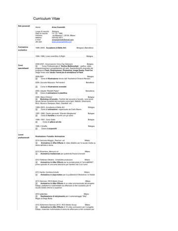 Currículum Vitae Dati personali Formazione Nome: Anna Ciammitti Luogo di nascita: Data di nascita: Indirizzo: telefono: e-mail: sito web: Bologna 13 / 12 / 1980 via Messina 1, 20154, Milano 339 622 0671 [email protected] www.annaciammitti.com 1999–2004, Accademia di Belle Arti Bologna e Barcellona scolastica 1994–1999, Liceo scientifico A.Righi Corsi specializzati Bologna 2006-2007, Associazione Cnos-Fap Salesiani Bologna ! Corso Professionale di “Grafico Multimediale” : grafica, video, programmazione e progettazione siti web. Apprendimento avanzato dei programmi Flash, Dreamweaver, Photoshop, Image Ready, Final Cut. Stage finale nello studio ToonsLab di animazione in Flash. 2006-2007 Bologna ! Corso di Illustrazione tenuto dall’ illustratrice Octavia Monaco 2004, Escuela Massana Permanent ! Barcellona Corso di illustrazione avanzata 2003, Estudio “Rodolfo Pastor” ! Corso di animazione in plastilina Barcellona 2000, Mano Edizioni Bologna ! Workshop di fumetto –Territori del racconto a fumetti– corsi tenuti dai più famosi fumettisti del momento come Igort, Mattotti, Ghermandi, Ricci, Munoz e Sampayo, Barù, Giandelli, etc... Lavori professionali 1999–2003, Accademia di Belle Arti ! Corso di animazione -organizzato da Carlo Mauro- Bologna 1997–1998, Centro giovanile “Giardini Margherita” ! Corso di fumetto e incontri con gli autori Bologna 1996–1997, Casa Gialla ! Corso di pittura ad olio Bologna 1996, Il Graffio ! Corso di acquerelli Bologna Illustrazione- Fumetto- Animazione 2014 Gennaio-Maggio_Pearson ed. Milano ! Animatrice in After Effects di video didattici per le scuole medie su storia dell'arte e storia 2013 Dicembre_Mercurio srl Milano ! Animatrice tradizionale per pubblicità Flexia-Unicredit 2013 Febbraio-Ottobre- Cinedokke produzioni Milano ! Animatrice in After Effects per la puntata pilota di "animaBIRIKI", primo episodio di una serie televisiva per bambini dai 0 ai 4 anni. 2013 Aprile- Combocut studio Milano ! Animatrice in stop-motion per la pubblicità di Moleskine- lo Hobbit 2013 Gennaio- RCS Media Group Milano ! Animatrice in After Effects di un video promozionale del progetto Edapp, piattaforma multimediale da affiancare ai libri scolastici per le scuole medie inferiori e superiori 2012 settembre Milano ! Realizzazione di storyboards per il cortometraggio "Mia". Regia di Diego Botta 2012 Settembre-Gennaio 2013- RCS Media Group Milano ! Animatrice in After Effects di 15 video animazioni per il progetto Edapp, materiale multimediale di storia da affiancare ai libri scolastici per le scuole medie inferiori 2012 Dicembre_Gennaio 2013- Pratibianchi edizioni Milano ! Realizzazione di un libro illustrato sulla vita di Georges Ohsawa 2012 Novembre- Withstand srl ! Animatrice in stop-motion per uno spot pubblicitario Milano 2012 settembre Milano ! Realizzazione di storyboards per il cortometraggio "Mia". Regia di Diego Botta 2012 Settembre-Gennaio 2013- RCS Media Group Milano ! Animatrice in After Effects di 15 video animazioni per il progetto Edapp, materiale multimediale di storia da affiancare ai libri scolastici per le scuole medie inferiori 2012 Dicembre_Gennaio 2013- Pratibianchi edizioni Milano ! Realizzazione di un libro illustrato sulla vita di Georges Ohsawa 2012 Novembre- Withstand srl ! Animatrice in stop-motion per uno spot pubblicitario commissionato da Smythson per i cento anni di azienda. Milano 2012 Ottobre- Comune di Cremona Cremona ! "VIDEO TRICKS. L' animazione sperimentale nella Videoarte" Laboratorio di animazione in collaborazione con l'artista Andreco all'interno del Centro Fumetto Andrea Pazienza nell'ambito del programma dedicato all'arte contemporanea: "Municity e Arte contemporanea e territorio" . 2012 Giugno- Bastardi Dentro e Mammafotogramma Milano ! Animatrice in stop-motion dello spot pubblicitario per l'agenda Bastardi Dentro 2013 2012 Aprile- Oxfam Italia Milano ! Realizzazione di una animazione cut out e post produzione in After Effect per la pubblicità "Coltiva" di Oxfam Italia 2012 Marzo- Cromazoo e Mammafotogramma Milano ! Animatrice in After Effect per la pubblicità "Spuma di Sciampagna" 2012 2011, 2012 Aprile- gennaio- Conflictivos productions Valencia ! Animatrice, modellatrice, attrezzista per il lungometraggio in stop- motion "Pos Eso", prodotto da Basque Films 2009, 2010 Gennaio- Novembre – Studio Fusako Yusaki Milano ! Animatrice, modellatrice e scenografa per le serie televisive in plastilina “Peo Gallery” distribuita in Svizzera, “Polis” in coproduzione con la RAI e “Inai Inai Ba” per il Giappone 2010 Febbraio_ Wobinda produzioni ! Realizzazione di storyboards per tre pubblicità Bologna 2008, Novembre, Dicembre – Hamelin Bologna ! Laboratori di fumetto con classi 4° e 5° di scuole elementari di Bologna e dintorni. 2008, Luglio – Italianieuropei Bologna ! Realizzazione dell’ illustrazione di copertina per il numero 3 della rivista Italianieuropei 2008, Maggio – BeccoGiallo ed. Bologna ! Realizzazione di 4 tavole di fumetto per l’albo “Zero Tolleranza” 2008, Aprile/ Giugno - Africa e Mediterraneo Bologna ! Laboratorio pomeridiano di fumetto con i ragazzi dell’ Isart 2008, Febbraio – Associazione Oltre Bologna ! Realizzazione di 20 illustrazioni in bianco e nero per il libro “I Don Chisciotte urbani”. 2007, Dicembre- Studio grafico D-Sign Bologna ! Illustrazioni di base per un servizio fotografico per la ditta di abbigliamento Repley. 2007, Novembre – Africa e Mediterraneo Dakar, Senegal ! “Africa Comics”, workshops di fumetto e di immagini per la comunicazione sociale al Centro Socio-Culturale di Gran Dakar, insieme a due fumettisti senegalesi e con 50 partecipanti. Tematiche base: emigrazione, sviluppo sostenibile, povertà, diritti umani. 2007, Luglio- Settembre – Studio grafico “Oggettispeciali” Bologna ! Illustrazioni grafiche per un progetto da presentare alla ditta Montorsi 2007, Maggio- Pseudo Toons Lab Bologna ! Stage formativo. Animazione in Fl