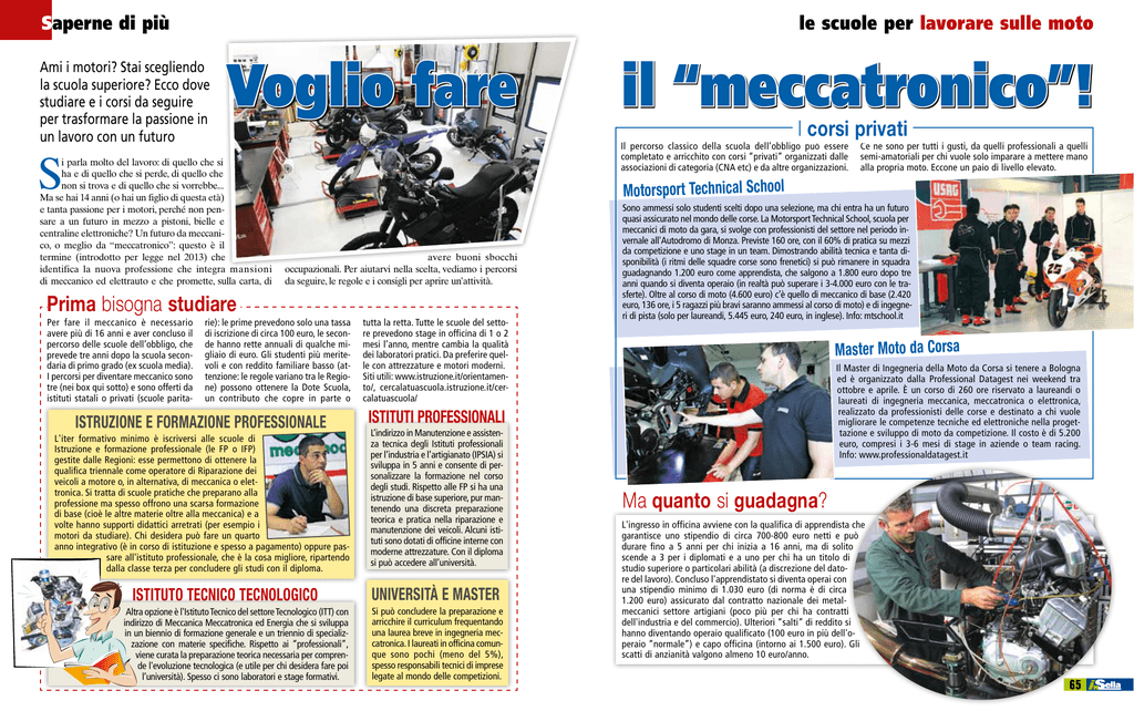 Saperne di più le scuole per lavorare sulle moto Ami i motori? Stai scegliendo la scuola superiore? Ecco dove studiare e i corsi da seguire per trasformare la passione in un lavoro con un futuro Voglio fare Ce ne sono per tutti i gusti, da quelli professionali a quelli semi-amatoriali per chi vuole solo imparare a mettere mano alla propria moto. Eccone un paio di livello elevato. Motorsport Technical School avere buoni sbocchi occupazionali. Per aiutarvi nella scelta, vediamo i percorsi da seguire, le regole e i consigli per aprire un’attività. Prima bisogna studiare Per fare il meccanico è necessario avere più di 16 anni e aver concluso il percorso delle scuole dell’obbligo, che prevede tre anni dopo la scuola secondaria di primo grado (ex scuola media). I percorsi per diventare meccanico sono tre (nei box qui sotto) e sono offerti da istituti statali o privati (scuole parita- I corsi privati Il percorso classico della scuola dell’obbligo può essere completato e arricchito con corsi “privati” organizzati dalle associazioni di categoria (CNA etc) e da altre organizzazioni. S i parla molto del lavoro: di quello che si ha e di quello che si perde, di quello che non si trova e di quello che si vorrebbe... Ma se hai 14 anni (o hai un figlio di questa età) e tanta passione per i motori, perché non pensare a un futuro in mezzo a pistoni, bielle e centraline elettroniche? Un futuro da meccanico, o meglio da “meccatronico”: questo è il termine (introdotto per legge nel 2013) che identifica la nuova professione che integra mansioni di meccanico ed elettrauto e che promette, sulla carta, di il “meccatronico”! rie): le prime prevedono solo una tassa di iscrizione di circa 100 euro, le seconde hanno rette annuali di qualche migliaio di euro. Gli studenti più meritevoli e con reddito familiare basso (attenzione: le regole variano tra le Regione) possono ottenere la Dote Scuola, un contributo che copre in parte o Istruzione e formazione professionale L'iter formativo minimo è iscriversi alle scuole di Istruzione e formazione professionale (le FP o IFP) gestite dalle Regioni: esse permettono di ottenere la qualifica triennale come operatore di Riparazione dei veicoli a motore o, in alternativa, di meccanica o elettronica. Si tratta di scuole pratiche che preparano alla professione ma spesso offrono una scarsa formazione di base (cioè le altre materie oltre alla meccanica) e a volte hanno supporti didattici arretrati (per esempio i motori da studiare). Chi desidera può fare un quarto anno integrativo (è in corso di istituzione e spesso a pagamento) oppure passare all'istituto professionale, che è la cosa migliore, ripartendo dalla classe terza per concludere gli studi con il diploma. Istituto Tecnico Tecnologico Altra opzione è l'Istituto Tecnico del settore Tecnologico (ITT) con indirizzo di Meccanica Meccatronica ed Energia che si sviluppa in un biennio di formazione generale e un triennio di specializzazione con materie specifiche. Rispetto ai “professionali”, viene curata la preparazione teorica necessaria per comprende l'evoluzione tecnologica (e utile per chi desidera fare poi l’università). Spesso ci sono laboratori e stage formativi. tutta la retta. Tutte le scuole del settore prevedono stage in officina di 1 o 2 mesi l’anno, mentre cambia la qualità dei laboratori pratici. Da preferire quelle con attrezzature e motori moderni. Siti utili: www.istruzione.it/orientamento/, cercalatuascuola.istruzione.it/cercalatuascuola/ Sono ammessi solo studenti scelti dopo una selezione, ma chi entra ha un futuro quasi assicurato nel mondo delle corse. La Motorsport Technical School, scuola per meccanici di moto da gara, si svolge con professionisti del settore nel periodo invernale all'Autodromo di Monza. Previste 160 ore, con il 60% di pratica su mezzi da competizione e uno stage in un team. Dimostrando abilità tecnica e tanta disponibilità (i ritmi delle squadre corse sono frenetici) si può rimanere in squadra guadagnando 1.200 euro come apprendista, che salgono a 1.800 euro dopo tre anni quando si diventa operaio (in realtà può superare i 3-4.000 euro con le trasferte). Oltre al corso di moto (4.600 euro) c’è quello di meccanico di base (2.420 euro, 136 ore, i 5 ragazzi più bravi saranno ammessi al corso di moto) e di ingegneri di pista (solo per laureandi, 5.445 euro, 240 euro, in inglese). Info: mtschool.it Master Moto da Corsa Il Master di Ingegneria della Moto da Corsa si tenere a Bologna ed è organizzato dalla Professional Datagest nei weekend tra ottobre e aprile. È un corso di 260 ore riservato a laureandi o laureati di ingegneria meccanica, meccatronica o elettronica, realizzato da professionisti delle corse e destinato a chi vuole migliorare le competenze tecniche ed elettroniche nella progettazione e sviluppo di moto da competizione. Il costo è di 5.200 euro, compresi i 3-6 mesi di stage in aziende o team racing. Info: www.professionaldatagest.it Istituti professionali L’indirizzo in Manutenzione e assistenza tecnica degli Istituti professionali per l’industria e l’artigianato (IPSIA) si sviluppa in 5 anni e consente di personalizzare la formazione nel corso degli studi. Rispetto alle FP si ha una istruzione di base superiore, pur mantenendo una discreta preparazione teorica e pratica nella riparazione e manutenzione dei veicoli. Alcuni istituti sono dotati di officine interne con moderne attrezzature. Con il diploma si può accedere all’università. Università e Master Si può concludere la preparazione e arricchire il curriculum frequentando una laurea breve in ingegneria meccatronica. I laureati in officina comunque sono pochi (meno del 5%), spesso responsabili tecnici di imprese legate al mondo delle competizioni. Ma quanto si guadagna? L'ingresso in officina avviene con la qualifica di apprendista che garantisce uno stipendio di circa 700-800 euro netti e può durare fino a 5 anni per chi inizia a 16 anni, ma di solito scende a 