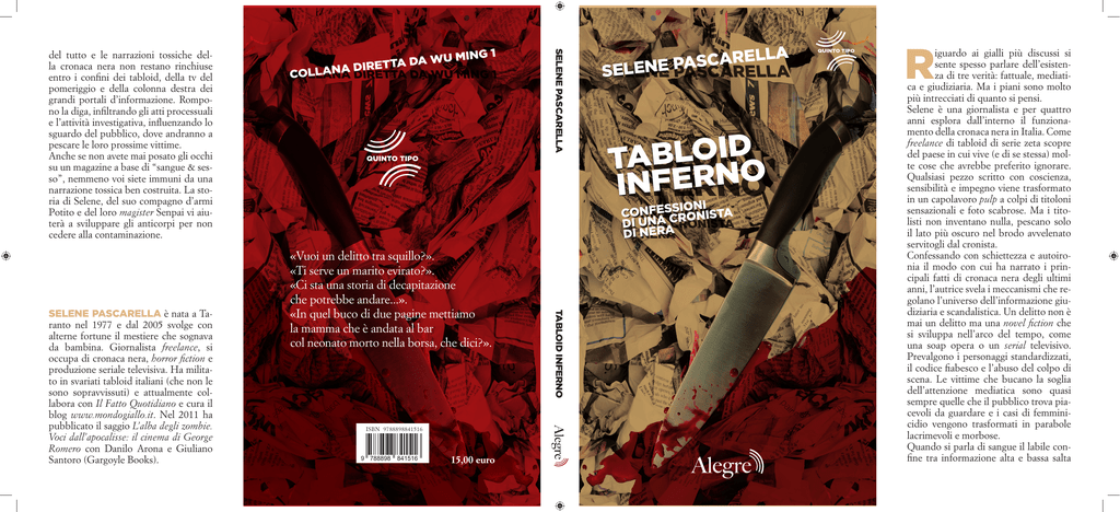 ELLA R A C S A P ELENE PASCARELLA S SELENE D I O L B TABLOID TA O N R E F N IINFERNO IONI A ONFESSR CONFESSIONI C ONIST NA C DII U UNA CRONISTA D ERA D DII N NERA «Vuoi un delitto tra squillo?». «Ti serve un marito evirato?». «Ci sta una storia di decapitazione che potrebbe andare...». «In quel buco di due pagine mettiamo la mamma che è andata al bar col neonato morto nella borsa, che dici?». ISBN 9788898841516 15,00 euro TABLOID INFERNO SELENE PASCARELLA è nata a Taranto nel 1977 e dal 2005 svolge con alterne fortune il mestiere che sognava da bambina. Giornalista freelance, si occupa di cronaca nera, horror fiction e produzione seriale televisiva. Ha militato in svariati tabloid italiani (che non le sono sopravvissuti) e attualmente collabora con Il Fatto Quotidiano e cura il blog www.mondogiallo.it. Nel 2011 ha pubblicato il saggio L’alba degli zombie. Voci dall’apocalisse: il cinema di George Romero con Danilo Arona e Giuliano Santoro (Gargoyle Books). MING 1 U W A D A DIRETT OLLANA DIRETTA DA WU MING 1 C COLLANA SELENE PASCARELLA del tutto e le narrazioni tossiche della cronaca nera non restano rinchiuse entro i confini dei tabloid, della tv del pomeriggio e della colonna destra dei grandi portali d’informazione. Rompono la diga, infiltrando gli atti processuali e l’attività investigativa, influenzando lo sguardo del pubblico, dove andranno a pescare le loro prossime vittime. Anche se non avete mai posato gli occhi su un magazine a base di “sangue & sesso”, nemmeno voi siete immuni da una narrazione tossica ben costruita. La storia di Selene, del suo compagno d’armi Potito e del loro magister Senpai vi aiuterà a sviluppare gli anticorpi per non cedere alla contaminazione. R iguardo ai gialli più discussi si sente spesso parlare dell’esistenza di tre verità: fattuale, mediatica e giudiziaria. Ma i piani sono molto più intrecciati di quanto si pensi. Selene è una giornalista e per quattro anni esplora dall’interno il funzionamento della cronaca nera in Italia. Come freelance di tabloid di serie zeta scopre del paese in cui vive (e di se stessa) molte cose che avrebbe preferito ignorare. Qualsiasi pezzo scritto con coscienza, sensibilità e impegno viene trasformato in un capolavoro pulp a colpi di titoloni sensazionali e foto scabrose. Ma i titolisti non inventano nulla, pescano solo il lato più oscuro nel brodo avvelenato servitogli dal cronista. Confessando con schiettezza e autoironia il modo con cui ha narrato i principali fatti di cronaca nera degli ultimi anni, l’autrice svela i meccanismi che regolano l’universo dell’informazione giudiziaria e scandalistica. Un delitto non è mai un delitto ma una novel fiction che si sviluppa nell’arco del tempo, come una soap opera o un serial televisivo. Prevalgono i personaggi standardizzati, il codice fiabesco e l’abuso del colpo di scena. Le vittime che bucano la soglia dell’attenzione mediatica sono quasi sempre quelle che il pubblico trova piacevoli da guardare e i casi di femminicidio vengono trasformati in parabole lacrimevoli e morbose. Quando si parla di sangue il labile confine tra informazione alta e bassa salta