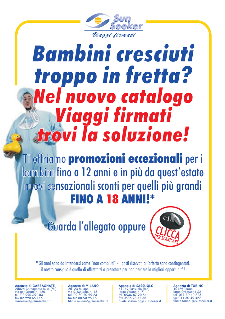 Bambini cresciuti troppo in fretta? Nel nuovo catalogo Viaggi firmati trovi la soluzione! Ti offriamo promozioni eccezionali per i bambini fino a 12 anni e in più da quest’estate nuovi sensazionali sconti per quelli più grandi FINO A 18 ANNI!* Guarda l’allegato oppurexxxxxxxx *Gli anni sono da intendersi come “non compiuti” - I posti riservati all’offerta sono contingentati, il nostro consiglio è quello di affrettarsi a prenotare per non perdere le migliori opportunità! Agenzia di GARBAGNATE 20024 Garbagnate M.se (Mi) via per Cesate n. 120 tel. 02.990.65.103 fax 02.990.65.146 [email protected] Agenzia di MILANO 20123 Milano via S. Maurilio n. 18 tel. 02.80.50.95.23 fax 02.80.50.95.15 [email protected] Agenzia di SASSUOLO 41049 Sassuolo (Mo) largo Verona n. 7 tel. 0536.87.20.54 fax 0536.98.42.38 [email protected] Agenzia di TORINO 10129 Torino largo Orbassano 62 tel. 011.30.40.823 fax 011.30.45.427 [email protected] Catalogo Viaggi Firmati – edizione Estate 2011 VILLAGGI CON PROMOZIONI BAMBINO 12-18 ANNI SARDEGNA fino a 14 anni (non compiuti) Garden Beach**** (Costa Rei/Cala Sinzias) pag. 7 Liscia Hotel*** (San Teodoro) pag. 13 fino a 15 anni (non compiuti) Eden Village Colostrai (Muravera) pag. 8 Eden Village Marina Country (Marina di Orosei) pag. 10 Eden Village Cala della Torre (Siniscola) pag. 12 SICILIA fino a 13 anni (non compiuti) Hotel Gattopardo (Lipari/Isole Eolie) pag. 21 fino a 14 anni (non compiuti) Sporting Club (Cefalù) pag.16 + catalogo specifico Estate 2011 da collezione fino a 15 anni (non compiuti) Eden Village Sikania (Marina di Butera) pag. 19 fino a 18 anni (non compiuti) Fontane Bianche (Siracusa) pag. 18 Agenzia di GARBAGNATE 20024 Garbagnate M.se (Mi) via per Cesate n. 120 tel. 02.990.65.103 fax 02.990.65.146 [email protected] Agenzia di MILANO 20123 Milano via S. Maurilio n. 18 tel. 02.80.50.95.23 fax 02.80.50.95.15 [email protected] Agenzia di SASSUOLO 41049 Sassuolo (Mo) largo Verona n. 7 tel. 0536.87.20.54 fax 0536.98.42.38 [email protected] Agenzia di TORINO 10129 Torino largo Orbassano 62 tel. 011.30.40.823 fax 011.30.45.427 [email protected] SunSeeker - Viaggi firmati S.r.l. - C. F. e P. IVA 12513640156 - Iscrizione C.C.I.A.A. Milano, n. 1566860 Cap. soc. ¤ 10.400,00 (int. vers.) - Polizza assicurativa C.E.A. Assistance (gruppo R.A.S. - Allianz) n. 56913 CALABRIA fino a 15 anni (non compiuti) Eden Village Nausicaa (S. Andrea dello Jonio) pag. 26 Eden Village Borgo del Principe (Marina di Zambrone) pag. 29 BASILICATA fino a 15 anni (non compiuti) Eden Village Argonauti (Marina di Pisticci) pag. 30 PUGLIA fino a 14 anni (non compiuti) iClub Villaggio Santa Sabina (Ostuni) pag. 33 fino a 15 anni (non compiuti) Eden Village Koinè (Alimini) pag. 34 Blu Salento Village (Sant’Isidoro) pag. 35 Isola d’ISCHIA fino a 14 anni (non compiuti) Hotel Terme Parco Teresa (Forio) pag. 39 TOSCANA fino a 15 anni (non compiuti) Grand Hotel (Forte dei Marmi) pag. 45 Park Hotel I Lecci (San Vincenzo) pag. 45 Agenzia di GARBAGNATE 20024 Garbagnate M.se (Mi) via per Cesate n. 120 tel. 02.990.65.103 fax 02.990.65.146 [email protected] Agenzia di MILANO 20123 Milano via S. Maurilio n. 18 tel. 02.80.50.95.23 fax 02.80.50.95.15 [email protected] Agenzia di SASSUOLO 41049 Sassuolo (Mo) largo Verona n. 7 tel. 0536.87.20.54 fax 0536.98.42.38 [email protected] Agenzia di TORINO 10129 Torino largo Orbassano 62 tel. 011.30.40.823 fax 011.30.45.427 [email protected] SunSeeker - Viaggi firmati S.r.l. - C. F. e P. IVA 12513640156 - Iscrizione C.C.I.A.A. Milano, n. 1566860 Cap. soc. ¤ 10.400,00 (int. vers.) - Polizza assicurativa C.E.A. Assistance (gruppo R.A.S. - Allianz) n. 56913 SPAGNA – Isole BALEARI fino a 14 anni (non compiuti) IBIZA/Fiesta Palm Beach pag. 49 MINORCA/Eden Village Cala’n Blanes pag. 53 MAIORCA/Iberostar Vell Mari pag. 60 MAIORCA/Eden Village Cala Mandia pag. 59 fino a 18 anni (non compiuti) IBIZA/Eden Village Tarida Playa pag. 47 FORMENTERA/Club Maryland pag. 51 SPAGNA – Isola CANARIE fino a 13 anni (non compiuti) FUERTEVENTURA/Club Paraiso Playa pag. 63 fino a 14 anni (non compiuti) TENERIFE/Bouganville Playa pag. 66 GRECIA – Isola di RODI fino a 13 anni (non compiuti) Club Miraluna pag. 82 fino a 14 anni (non compiuti) Calypso Resort pag. 80 Rodos Princess pag. 81 fino a 18 anni (non compiuti) Eden Village Myrina Beach pag. 79 Agenzia di GARBAGNATE 20024 Garbagnate M.se (Mi) via per Cesate n. 120 tel. 02.990.65.103 fax 02.990.65.146 [email protected] Agenzia di MILANO 20123 Milano via S. Maurilio n. 18 tel. 02.80.50.95.23 fax 02.80.50.95.15 [email protected] Agenzia di SASSUOLO 41049 Sassuolo (Mo) largo Verona n. 7 tel. 0536.87.20.54 fax 0536.98.42.38 [email protected] Agenzia di TORINO 10129 Torino largo Orbassano 62 tel. 011.30.40.823 fax 011.30.45.427 [email protected] SunSeeker - Viaggi firmati S.r.l. - C. F. e P. IVA 12513640156 - Iscrizione C.C.I.A.A. Milano, n. 1566860 Cap. soc. ¤ 10.400,00 (int. vers.) - Polizza assicurativa C.E.A. Assistance (gruppo R.A.S. - Allianz) n. 56913 GRECIA – Isola di CRETA fino a 14 anni (non compiuti) Sirens Village pag. 84 fino a 15 anni (non compiuti) Eden Village Minoa Palace pag. 87 GRECIA – Isola di KOS fino a 14 anni (non compiuti) Norida Beach pag. 89 fino a 15 anni (non compiuti) Eden Village Sovereign pag. 88 GRECIA – Isola di SAMOS fino a 13 anni (non compiuti) Club Doryssa pag. 92 fino a 14 anni (non compiuti) Volando Club Kampos pag. 92 fino a 18 anni (non compiuti) Eden Village Sirens pag. 91 GRECIA – Isole CICLADI fino a 14 anni (non compiuti) NAXOS/Naxos Imperial pag. 95 SANTORINI/Okeanis Beach pag. 95 Agenzia di GARBAGNATE 20024 Garbagnate M.se (Mi) via per Cesate n. 120 tel. 02.990.65.103 fax 02.990.65.146 [email protected] Agenzia di MILANO 20123 Milano via S. Maurilio n. 18 tel. 02.80.50.95.23 fax 02.80.50.95.15 [email protected] Agenzia di SASSUOLO 41049 Sassuolo (Mo) largo Verona n. 7 tel. 0536.87.20.54 fax 0536.98.42.38 [email protected] Agenzia di TORINO 10129 Torino largo
