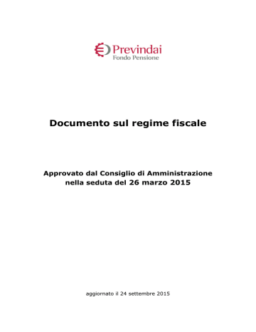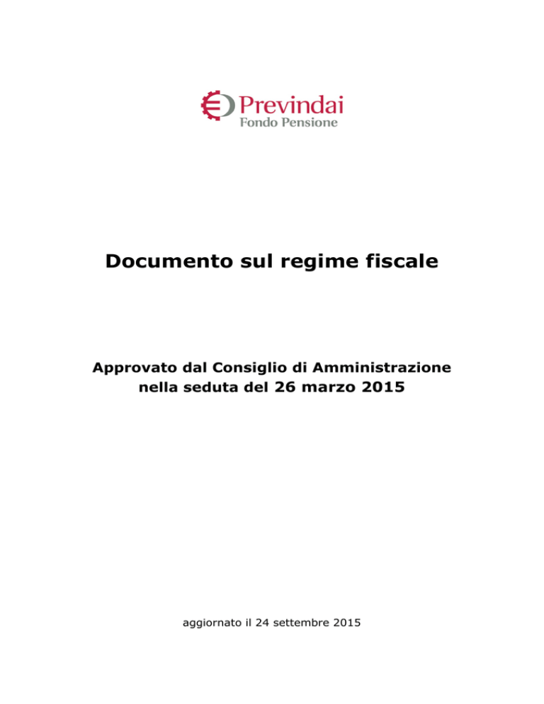 Documento sul regime fiscale Approvato dal Consiglio di Amministrazione nella seduta del 26 marzo 2015 aggiornato il 24 settembre 2015 Sommario 1 – Regime fiscale dei contributi .........................................................................3 2 – Regime fiscale della fase d’accumulo ..............................................................3 3 – Regime fiscale dei trasferimenti e degli switch ................................................. 4 4 – Regime fiscale delle prestazioni .....................................................................4 4.1 - FISCALITA’ DEI MONTANTI MATURATI DAL 1° GENNAIO 2007 ...................... 5 4.1.1 - Prestazioni pensionistiche - sia in forma di rendita, sia di capitale ............ 5 4.1.2 - Prestazioni anticipate: riscatti e anticipazioni ........................................ 6 4.2 - FISCALITA’ DEI MONTANTI MATURATI DAL 1° GENNAIO 2001 AL 31 DICEMBRE 2006 ............................................................................................7 4.2.1 - Prestazioni pensionistiche in forma di rendita ........................................ 6 4.2.2 - Prestazioni pensionistiche in forma di capitale ....................................... 7 4.2.3 - Prestazioni anticipate ........................................................................7 4.3 - FISCALITA’ SUI MONTANTI MATURATI SINO AL 31 DICEMBRE 2000 .............. 8 4.3.1 - Prestazioni pensionistiche in forma di rendita ........................................ 8 4.3.2 - Prestazioni in unica soluzione (pensionistiche, riscatti e anticipazioni) ...... 9 2 1 – Regime fiscale dei contributi I contributi versati ai fondi pensione, quale Previndai, sono deducibili dal reddito complessivo dell’iscritto per un importo annuo non superiore a 5.164,57 euro. Ai fini del computo di tale importo concorrono: i contributi versati dall’iscritto e dal datore di lavoro, dovuti su base contrattuale ovvero in forma aggiuntiva; i contributi versati dall’iscritto volontariamente; le somme versate dall’iscritto a titolo di reintegro di anticipazioni precedentemente percepite. Per la parte dell’importo reintegrato eccedente i 5.164,57 euro – e comunque relativa alla posizione maturata dal 2007 – è riconosciuto al contribuente un credito d'imposta nei limiti della ritenuta pagata al momento della fruizione dell'anticipazione e proporzionale all'importo reintegrato. Ai lavoratori di prima occupazione successiva al 1° gennaio 2007 che nei primi cinque anni di partecipazione alle forme pensionistiche complementari abbiano versato contributi in misura inferiore all’importo massimo deducibile nel quinquennio (5.164,57 * 5 = 25.822,85), è consentito, nei venti anni successivi al quinto, dedurre dal reddito complessivo contributi in misura superiore ai 5.164,57 euro. Tale maggiore importo è pari alla differenza positiva tra 25.822,85 euro e i contributi effettivamente versati nei primi cinque anni di partecipazione e, comunque, per un importo non superiore a 2.582,29 euro annui. Pertanto, l’importo massimo annuale complessivamente deducibile è di 7.746,86 euro ricorrendo le condizioni per l’incremento. Non è deducibile dal reddito complessivo il TFR annualmente destinato alla forma pensionistica complementare, in quanto all’atto del versamento al Fondo non è soggetto a tassazione. Entro il 31 dicembre dell’anno successivo a quello in cui è stato effettuato il versamento alla forma pensionistica complementare ovvero, se antecedente, alla data in cui sorge il diritto alla prestazione, l'iscritto comunica al Fondo, tramite il modello 059 o dichiarazione di contenuto equivalente, l’importo dei contributi versati che non è stato dedotto o che non sarà dedotto in sede di dichiarazione dei redditi. Tale importo verrà escluso dall’imponibile all’atto dell’erogazione della prestazione finale. 2 – Regime fiscale della fase d’accumulo Sui rendimenti della gestione, i fondi pensione sono soggetti ad imposta sostitutiva delle imposte sui redditi nella misura del 20% (L. 190 del 23/12/2014) che si applica annualmente sul risultato maturato in ciascun periodo d'imposta, al netto dei costi di gestione. Fino al 2013 l'aliquota di imposizione del risultato di gestione è stata pari all'11%. Ai fini della determinazione della base imponibile, i redditi derivanti da titoli pubblici italiani ed equiparati oltreché da obbligazioni emesse da Stati o enti territoriali di Stati inclusi nella c.d. white list concorrono nella misura del 62,50%, ossia in relazione al 3 rapporto tra l’aliquota propria dei titoli di stato del 12,50% e quella nuova del 20%. In altri termini, i rendimenti derivanti dai citati titoli pubblici sono imposti per il 12,50%. Inoltre sull’ammontare corrispondente al risultato netto maturato assoggettato alla citata imposta sostitutiva, investito in attività di carattere finanziario a medio o lungo termine (individuate con decreto del Ministro dell’economia e delle finanze, non ancora emanato alla data di approvazione del presente Documento), è riconosciuto un credito d’imposta pari al 9%, nei limiti di uno stanziamento erariale prestabilito. Il credito d’imposta può essere utilizzato a decorrere dal periodo d’imposta successivo a quello di effettuazione del citato investimento, non concorre alla formazione del risultato netto maturato e incrementa la parte corrispondente ai redditi già assoggettati ad imposta ai fini della formazione delle prestazioni. Qualora in un periodo d’imposta si verifichi un risultato negativo, quest’ultimo può essere computato in diminuzione del risultato positivo della gestione dei periodi d'imposta successivi, per l'intero importo che trova in essi capienza oppure utilizzato, in tutto o in parte, dal fondo in diminuzione del risultato positivo di gestione di altre linee di investimento da esso gestite, a partire dal medesimo periodo d’imposta in cui è maturato il risultato negativo. 3 – Regim