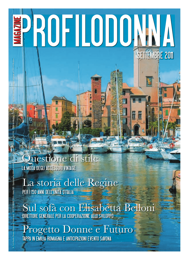 N. 3 di Profilo Donna Magazine Trimestrale - SETTEMBRE 2011 - Anno XII - Spedizione in Abb.to postale - 45% - art.2 comma 20/b Legge 662/96 - Filiale di Modena - Tassa pagata - In caso di mancato recapito ritornare al CPO di Modena SETTEMBRE 2011 Questione di stile la Moda dEgli accESSoRi vinTagE La storia delle Regine pER i 150 anni dEll’UniTà d’iTalia Sul sofà con Elisabetta Belloni diRETToRE gEnERalE pER la coopERazionE allo SvilUppo Progetto Donne e Futuro Tappa in EMilia RoMagna E anTicipazioni EvEnTo Savona verolino c o n t e m p o r a r y OPENING SOON tappeti contemporanei e di design Modena - Via Farini 70 ang. P.za Roma Tel. +39 059 237845 Fax +39 059 222618 www.verolino.com e-mail: [email protected] 6 N.3 SETTEMBRE 2011 13 23 IN QUESTO NUMERO: 5 Editoriale 6 In vintage we trust 10 Le Regine d’Italia 13 Progetto Donne e Futuro fa tappa in Emilia Romagna 20 Profilo Donna sul green 37 23 Sul sofà con Elisabetta Belloni Direttore Generale per la Cooperazione allo Sviluppo 28 25 settembre 2011: anticipazioni evento Savona Profilo Donna Magazine n.45 Settembre 2011 - Numero 3 Comitato di redazione: Cristina Bicciocchi, Baselito S.r.l. Profilo Donna Magazine Settembre 2011 - Anno XII Spedizione in Abb.to postale - 45% art.2 comma 20/b Legge 662/96 - Filiale di Modena - Hanno collaborato: Cecilia Brandoli, Daniela Severi, Carlo italo Vittorio Nardi, Silvia Bottaro, Cristina Botti e Veronica Piolini Tassa pagata - Contiene I.P. - Autorizzazione del Tribunale di Modena n.1495 del 20/10/99. Editore: Arbe Editoriale V. Emilia Ovest 1014 - 41100 Modena Direttore responsabile: Cristina Bicciocchi Modena - Tel. e Fax 059-391615 email: [email protected] Fotografie: Roberto Vacirca, Marco De Franco, archivio Baselito S.r.l. Progettazione e realizzazione grafica: Baselito S.r.l - Modena - Tel. 059/821887 www.mainstreet.it - [email protected] Stampa: Arbe Industrie Grafiche S.p.A. 34 Collezione d’arte sacra contemporanea “Santa Rossello” 37 Bruno Magli: brand di lusso della calzatura 41 Sandro Pertini: l’intelligenza al sevizio della politica 44 Speciale Premio Profilo Donna Junior con Veronica Piolini 46 Cioccolato: una storia di energia e dolcezza 48 PPDNews 49 News Tel. 059 896811 - www.arbegrafiche.it Per la pubblicità su questa rivista rivolgersi a: Redazione di Profilo Donna via Buon Pastore, 63 Modena tel. e fax 059-391615 cellulare 335/292472 Ufficio di Rappresentanza via S. Tomaso, 6 Milano tel. 02 86995469 fax 02 86467823 Il suo nome è inserito nella nostra mailing list esclusivamente per l’invio delle nostre pubblicazioni (legge 675/96 sulla Protezione dei dati Personali), se desidera essere escluso dall’elenco invii la sua richiesta a: Redazione di Profilo Donna, via Buon Pastore, n.63 - 41125 Modena. Regina del Castello - 1981/82 gesso-forma cm 173x73x73 collezione privata Bianca Berti foto Beppe Zagaglia Fernanda Gattinoni Moda e stelle ai tempi della Hollywood sul Tevere Mostra Teatro Comunale “Luciano Pavarotti” da giovedì a venerdì ore 16.00 / 19.00 sabato e domenica ore 10.30 / 13.00 e ore 16.00 / 19.00 28 settembre / 30 ottobre 2011 PROMOSSA DA CON IL PATROCINIO DI GRAZIE AL SOSTEGNO DI GRUPPO BPER SPONSOR EDITORIALE IN COPERTINA “CURVY CAN” insieme si può fare! di Cristina Bicciocchi È il messaggio che 6 modelle professioniste “Taglie Più” (46-48), in collaborazione con Jonas Onlus, vogliono lanciare a tutte le persone che per inseguire i canoni estetici proposti dalla moda e dalla società stessa, sono precipitate nel tunnel dell’anoressia e della bulimia rifiutando il cibo e sottoponendo il proprio corpo a quotidiane torture. Aija Barzdina, Eleonora Finazzer, Elisa D’Ospina, Miriam Bon, Marina Ferrari e Valentina Fogliani hanno ideato il progetto “Curvy Can” (che riprende il più celebre “Yes We Can” d’oltreoceano), una campagna nazionale di sensibilizzazione contro i disturbi alimentari che ha lo scopo di far capire che la bellezza è una conquista che nasce da dentro, dalla consapevolezza del proprio corpo e dalla valorizzazione di quelle caratteristiche personali che ci rendono originali e uniche. Per far ciò hanno deciso di posare senza veli al grido di “I’m not a Fashion Victim” davanti all’obiettivo del fotografo Luca Patrone. Alcune di loro hanno iniziato la carriera da adolescenti, come modelle “regular” (taglia 38-40) senza sapere a cosa sarebbero andate incontro. Hanno vissuto per anni schiave delle misure, N. 2 di Profilo Donna Magazine Trimestrale - GIUGNO 2011 - Anno XII - Spedizione in Abb.to postale - 45% - art.2 comma 20/b Legge 662/96 - Filiale di Modena - Tassa pagata - In caso di mancato recapito ritornare al CPO di Modena SETTEMBRE 2011 La festa del Mac π 100 all’accadEMia MiliTaRE di ModEna Delegazione di Profilo Donna in viaggio a San PiETRoBuRgo Intervista a Marina Cicogna PRoduTTRicE cinEMaTogRafica Progetto Donne e Futuro a Milano, alESSandRia E vERona In copertina: costrette a lunghi digiuni ca dendo Le barche ormeggiate nella darsena di Savona. Sullo sfondo la famosa torre del nella trappola Brandale, detta anche Campanassa..... di considerare il cibo un nemico e Servizio a pag.28 mettendo in serio pericolo la loro stessa salute. Arrivate ai limiti dell’anoressia, grazie all’aiuto di amici, familiari ed esperti, hanno iniziato a vedere il mondo con una luce diversa capendo che corpo e anima sono i beni più preziosi e che metterli in pericolo per inseguire i miti proposti dalla moda era un delitto. Oggi sono felicemente passate dalla taglia 38-40 alla più comoda 46-48 assecondando la loro naturale fisicità e sono testimonial delle più importanti aziende “conformato” in Italia e nel Mondo. Sono amanti della buona e sana cucina e sono finalmente consapevoli del loro fascino e della loro femminilità anche con addosso quei chili che qualcuno definisce di troppo. Per entrare nella moda non bisogna necessariamente rimanerne vittime. Si può diventare modelle di successo anc