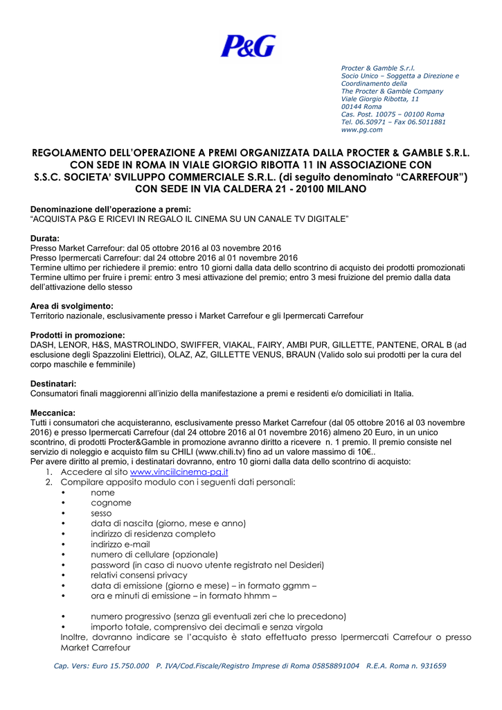 Procter & Gamble S.r.l. Socio Unico – Soggetta a Direzione e Coordinamento della The Procter & Gamble Company Viale Giorgio Ribotta, 11 00144 Roma Cas. Post. 10075 – 00100 Roma Tel. 06.50971 – Fax 06.5011881 www.pg.com REGOLAMENTO DELL’OPERAZIONE A PREMI ORGANIZZATA DALLA PROCTER & GAMBLE S.R.L. CON SEDE IN ROMA IN VIALE GIORGIO RIBOTTA 11 IN ASSOCIAZIONE CON S.S.C. SOCIETA’ SVILUPPO COMMERCIALE S.R.L. (di seguito denominato “CARREFOUR”) CON SEDE IN VIA CALDERA 21 - 20100 MILANO Denominazione dell’operazione a premi: “ACQUISTA P&G E RICEVI IN REGALO IL CINEMA SU UN CANALE TV DIGITALE” Durata: Presso Market Carrefour: dal 05 ottobre 2016 al 03 novembre 2016 Presso Ipermercati Carrefour: dal 24 ottobre 2016 al 01 novembre 2016 Termine ultimo per richiedere il premio: entro 10 giorni dalla data dello scontrino di acquisto dei prodotti promozionati Termine ultimo per fruire i premi: entro 3 mesi attivazione del premio; entro 3 mesi fruizione del premio dalla data dell’attivazione dello stesso Area di svolgimento: Territorio nazionale, esclusivamente presso i Market Carrefour e gli Ipermercati Carrefour Prodotti in promozione: DASH, LENOR, H&S, MASTROLINDO, SWIFFER, VIAKAL, FAIRY, AMBI PUR, GILLETTE, PANTENE, ORAL B (ad esclusione degli Spazzolini Elettrici), OLAZ, AZ, GILLETTE VENUS, BRAUN (Valido solo sui prodotti per la cura del corpo maschile e femminile) Destinatari: Consumatori finali maggiorenni all’inizio della manifestazione a premi e residenti e/o domiciliati in Italia. Meccanica: Tutti i consumatori che acquisteranno, esclusivamente presso Market Carrefour (dal 05 ottobre 2016 al 03 novembre 2016) e presso Ipermercati Carrefour (dal 24 ottobre 2016 al 01 novembre 2016) almeno 20 Euro, in un unico scontrino, di prodotti Procter&Gamble in promozione avranno diritto a ricevere n. 1 premio. Il premio consiste nel servizio di noleggio e acquisto film su CHILI (www.chili.tv) fino ad un valore massimo di 10€.. Per avere diritto al premio, i destinatari dovranno, entro 10 giorni dalla data dello scontrino di acquisto: 1. Accedere al sito www.vinciilcinema-pg.it 2. Compilare apposito modulo con i seguenti dati personali: • nome • cognome • sesso • data di nascita (giorno, mese e anno) • indirizzo di residenza completo • indirizzo e-mail • numero di cellulare (opzionale) • password (in caso di nuovo utente registrato nel Desideri) • relativi consensi privacy • data di emissione (giorno e mese) – in formato ggmm – • ora e minuti di emissione – in formato hhmm – • numero progressivo (senza gli eventuali zeri che lo precedono) • importo totale, comprensivo dei decimali e senza virgola Inoltre, dovranno indicare se l’acquisto è stato effettuato presso Ipermercati Carrefour o presso Market Carrefour Cap. Vers: Euro 15.750.000 P. IVA/Cod.Fiscale/Registro Imprese di Roma 05858891004 R.E.A. Roma n. 931659 Procter & Gamble S.r.l. Socio Unico – Soggetta a Direzione e Coordinamento della The Procter & Gamble Company Viale Giorgio Ribotta, 11 00144 Roma Cas. Post. 10075 – 00100 Roma Tel. 06.50971 – Fax 06.5011881 www.pg.com Il sito suddetto sarà attivo dal 05 ottobre 2016 al 13 novembre 2016. A completamento delle suddette operazioni e verificata la conformità di partecipazione al presente regolamento, il partecipante riceverà, all’indirizzo e-mail indicato in fase di registrazione, un’e-mail con un codice univoco che consentirà di fruire del servizio di noleggio e acquisto film su www.chili.tv fino ad un valore massimo di 10 Euro. Si precisa che i contenuti cinematografici fra cui è possibile scegliere di acquistare o noleggiare sono esclusivamente quelli presenti nella sezione denominata “Promo per te”. Per poter fruire del premio i consumatori in possesso di un codice CHILI dovranno, entro il 13 febbraio 2017: - Accedere al sito www.chili.tv; - Inserire il codice univoco ricevuto via email nel campo “Coupon”; - Accedere, se già clienti, o registrarsi gratuitamente. Il valore di 10€ verrà automaticamente caricato sul Borsellino Elettronico del consumatore che potrà così noleggiare e acquistare film della “Promo per te” fino ad esaurimento del valore e comunque entro e non oltre il 15 maggio 2017. Decorso tale periodo il premio – nella sua interezza o parzialmente se non fruito completamente – non sarà rimborsato né più fruibile. Premi in palio: Il premio in palio consiste nel servizio di noleggio e acquisto film a scelta nella sezione “Promo per te” su CHILI (www.chili.tv), erogato attraverso codici univoci, fino ad un valore massimo di 10€. Si prevede di distribuire, salvo conguaglio a fine manifestazione: n. 5.000 codici univoci CHILI del valore commerciale unitario di 10 Euro (IVA inclusa e non scorporabile) e del valore commerciale complessivo di 50.000,00 Euro (IVA inclusa e non scorporabile). I codici CHILI devono essere attivati entro il 13 febbraio 2017, mentre il valore di 10€ deve essere fruito entro il 15 maggio 2017. Montepremi totale: € 50.000,00 (IVA inclusa e non scorporabile). Garanzia: € 10.000,00 (pari al 20% del montepremi). A garanzia dei premi messi in palio, la Società promotrice ha richiesto apposita fideiussione, a favore del Ministero dello Sviluppo Economico, di importo pari al 20% del montepremi e si riserva di integrare tale garanzia qualora i premi erogati siano di numerosità superiore a quella preventivamente stimata. Adempimenti e garanzie: I consumatori che, secondo il giudizio insindacabile della Società promotrice o di terze parti incaricate dalla stessa, partecipino con mezzi e strumenti in grado di eludere l’aleatorietà, o comunque giudicati in maniera sospetta, fraudolenta, o in violazione del normale svolgimento dell’iniziativa, saranno esclusi dalla partecipazione e non potranno godere dell’eventuale premio vinto. Pertanto, la Società promotrice, o terze parti incaricate dalla stessa, si riservano il diritto di procedere, nei confronti di 