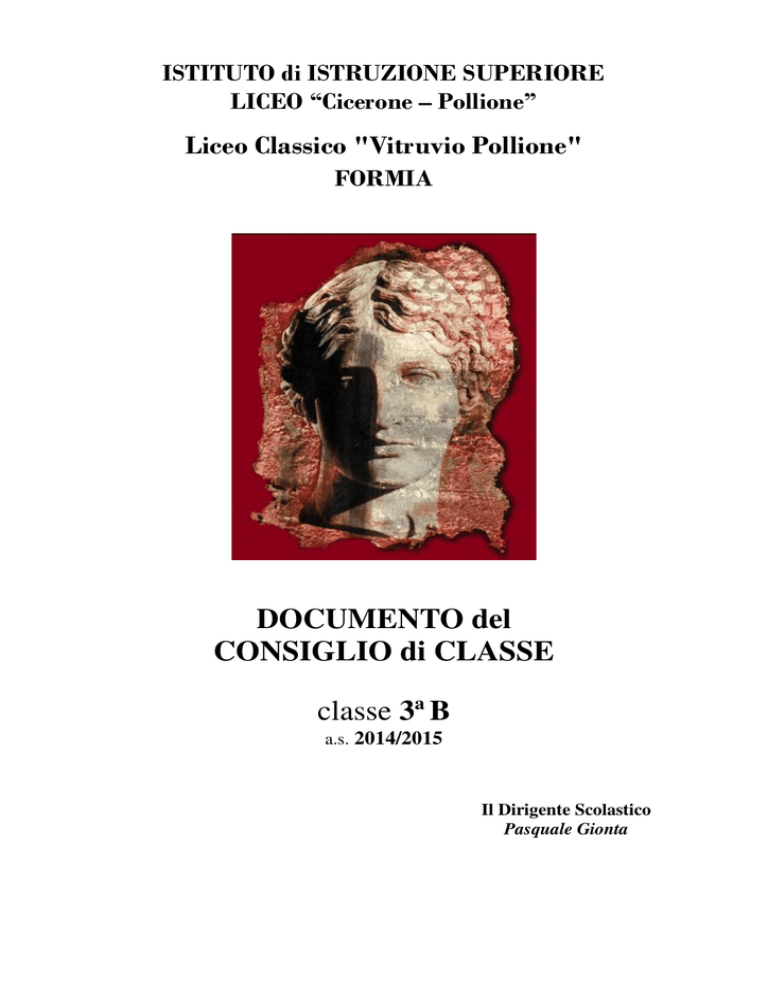 ISTITUTO di ISTRUZIONE SUPERIORE LICEO “Cicerone – Pollione” Liceo Classico "Vitruvio Pollione" FORMIA DOCUMENTO del CONSIGLIO di CLASSE classe 3a B a.s. 2014/2015 Il Dirigente Scolastico Pasquale Gionta INDICE 1. CENNI STORICI SULL’ISTITUZIONE SCOLASTICA PAG. 3 2. PROFILO DELLA CLASSE PAG. 8 3. FINALITÀ EDUCATIVE DELL'ISTITUTO E OBIETTIVI GENERALI DELL'INDIRIZZO DI STUDIO PAG. 9 4. SCHEDA DI VALUTAZIONE DELLA PRIMA PROVA: TIPOLOGIA A PAG. 15 5. SCHEDA DI VALUTAZIONE DELLA PRIMA PROVA: TIPOLOGIA B,C,D PAG. 16 6. SCHEDA DI VALUTAZIONE DELLA SECONDA PROVA PAG. 17 7. SCHEDA DI VALUTAZIONE DEL COLLOQUIO PAG. 18 8. SCHEDA DI VALUTAZIONE DELLA TERZA PROVA PAG. 19 9. TERZA PROVA : SIMULAZIONI PAG. 21 10. RELAZIONI E CONTENUTI DELLE SINGOLE DISCIPLINE: 2 - FILOSOFIA PAG. 22 - STORIA PAG. 27 - STORIA DELL’ARTE PAG. 29 - MATEMATICA PAG. 34 - FISICA PAG. 37 - LATINO PAG. 44 - GRECO PAG. 54 - SCIENZE PAG. 62 - ITALIANO PAG. 64 - ED FISICA PAG. 71 - RELIGIONE PAG. 72 - INGLESE PAG. 73 1 Cenni storici sull’Istituzione Scolastica Il Liceo Classico “Vitruvio Pollione” è un’antica e prestigiosa istituzione. Nato come Regio Liceo-Ginnasio e posto al centro di via Vitruvio, viene inaugurato dal Ministro della Cultura, Pietro Fedele, il 6 novembre 1927, diventando subito polo di attrazione per il territorio circostante e vanto della cittadinanza. Famoso per la qualità del servizio, il Liceo annovera, fra gli alunni, politici della statura di Pietro Ingrao, già presidente della Camera dei deputati, e di Antonio Ruberti, ex Ministro della Università e della Ricerca Scientifica e Tecnologica nonché Rettore dell’Università di Roma “La Sapienza”; inoltre, figurano il campione olimpionico Livio Berruti ed uno dei massimi ingegneri aerospaziali del Novecento, Angelo Miele. Fra i docenti vanno ricordati Pilo Albertelli e Gioacchino Gesmundo, due dei martiri trucidati alle Fosse Ardeatine, e Mario Trevi, decano in Italia degli psicoanalisti di scuola junghiana. Il Liceo subisce la distruzione dell’edificio per minamento durante la seconda guerra mondiale, ma continua a funzionare nei locali del Grand Hotel, sotto la presidenza ad interim della professoressa Di Silva; in seguito si trasferisce a Castellone, dove trova ospitalità presso il convento degli Olivetani nei locali della Colonia Di Donato. Rimane in tale situazione di precarietà fino a quando, negli anni ’50, secondo il piano della ricostruzione post-bellica, si attua a Formia un’importante operazione di edilizia scolastica che crea il complesso scolastico “Vitruvio Pollione – Dante Alighieri” in zona centrale, nei pressi della stazione ferroviaria in Via Rialto Ferrovia, ora Via Divisione Julia. Insieme alla Scuola Media con cui divide il monumentale impianto, il Liceo fa suo il motto araldico POST FATA RESURGO che giganteggia a fronte dell’edificio ad esprimere la volontà della cittadinanza di rinnovarsi attraverso una valida formazione culturale. Nell’anno scolastico 2000-2001 nasce l’ I.S.I.C.T. con l’aggregazione al Liceo Classico “Vitruvio” dell’Istituto Tecnico per Geometri “Tallini”, entrambi da tempo esistenti nel Distretto Scolastico 49. I docenti operano separatamente nei due indirizzi, ubicati a notevole distanza l’uno dall’altro, ma l’Istituto ha, oltre a una comune dirigenza, una comune gestione amministrativa e didattica ed un unitario Collegio dei Docenti. A partire dall’anno scolastico 2011-2012 il Liceo vede nuovamente riconosciuta la sua autonomia dal momento che, a decorrere dal 01.09.2011, è diventato un altro soggetto giuridico, in seguito al piano di dimensionamento delle istituzioni scolastiche dell’Ufficio Scolastico Regionale per il Lazio che con decreto n°7del19.01.2011 ha aggregato l’ I.T.G. “Tallini” all’I.PS.I.A. ”Fermi”, ed ha conferito autonomia e personalità giuridica al Liceo “Vitruvio”. Tuttavia, ai sensi dell'art. 19, § 5, del D.L. n. 98 del 06.07.2011 convertito nella Legge n. 111 del 15.07.2011 come modificato dall'art. 4, § 69 della Legge di stabilità n. 183 del 12.11.2011, nell'anno scolastico 2013/14 , l'ottantacinquesimo dalla sua istituzione, il liceo classico "Vitruvio Pollione" di Formia, che ha un numero di alunni inferiore a 600 unità, è stato conferito in reggenza, per continuità, al Dirigente scolastico prof. Pasquale Gionta, con incarico presso il campus dei licei "Massimiliano Ramadù" di Cisterna di Latina. Nell'anno scolastico in corso : 2014/15 nasce l‘ I.I.S. Liceo ' Cicerone-Pollione ' con l'aggregazione del Liceo Linguistico, Pedagogico, 'M.T.Cicerone ' di Formia. 3 DOCUMENTO DEL CONSIGLIO DI CLASSE III B Regolamento art. 5 Anno scolastico 2014 – 2015 Istituto Istruzione Secondaria Liceo ' Cicerone- Pollione' Via Divisione Julia - 0771 – 771261 IL CONSIGLIO DI CLASSE DISCIPLINE DOCENTI Religione UgoTomassi Italiano Annamaria Rinaldo Lett. Latine Maria Graziano Lett. Greche Maria Graziano Storia ed.Civica Rocco Raduazzo Filosofia Rocco Raduazzo Inglese Ersilia Pirozzi Matematica Massimo Mazzucco Fisica Massimo Mazzucco Scienze Sandra Vaudo Storia dell’Arte Rossella Cervone Educaz. Fisica Antonino Pio Marzullo Formia, 15 maggio 2015 Il Dirigente Scolastico Prof. Pasquale Gionta ELENCO CANDIDATI Classe III sez. B ANNO SCOLASTICO 2014-2015 1 Antetomaso Ilaria 2 D‘Acunto Chiara 3 D‘Acunto Mario 4 De Santis Antonio 5 Di Francia Elena 6 Di Russo Sara 7 Emoinet Taiko Daniel 8 Falco Martina 9 10 Fioravanti Fiumara Andrea Maria Sole 11 Lanna Matteo 12 Mazza Elisabetta 13 14 Monghese Montesano Flavia Sveva 15 Pierro Roberta 16 Pipolo Gaia 17 18 Rao Tomao Loredana Claudia 5 DOCUMENTO FINALE RELATIVO ALLE ATTIVITÀ EDUCATIVO-DIDATTICHE SVOLTE NELLA CLASSE III B NELL'ANNO SCOLASTICO 2013-14 Viste la legge del 11 gennaio 2007, n. 1; visto il D.M. n. 5 del 15 gennaio 2010; viste la C.M. n. 11 del 9 febbraio 2010; visti i D.P.R. n. 323 del 23 luglio 1998, n. 356/98, 357/98 e 358/98; vista la Programmazione edu